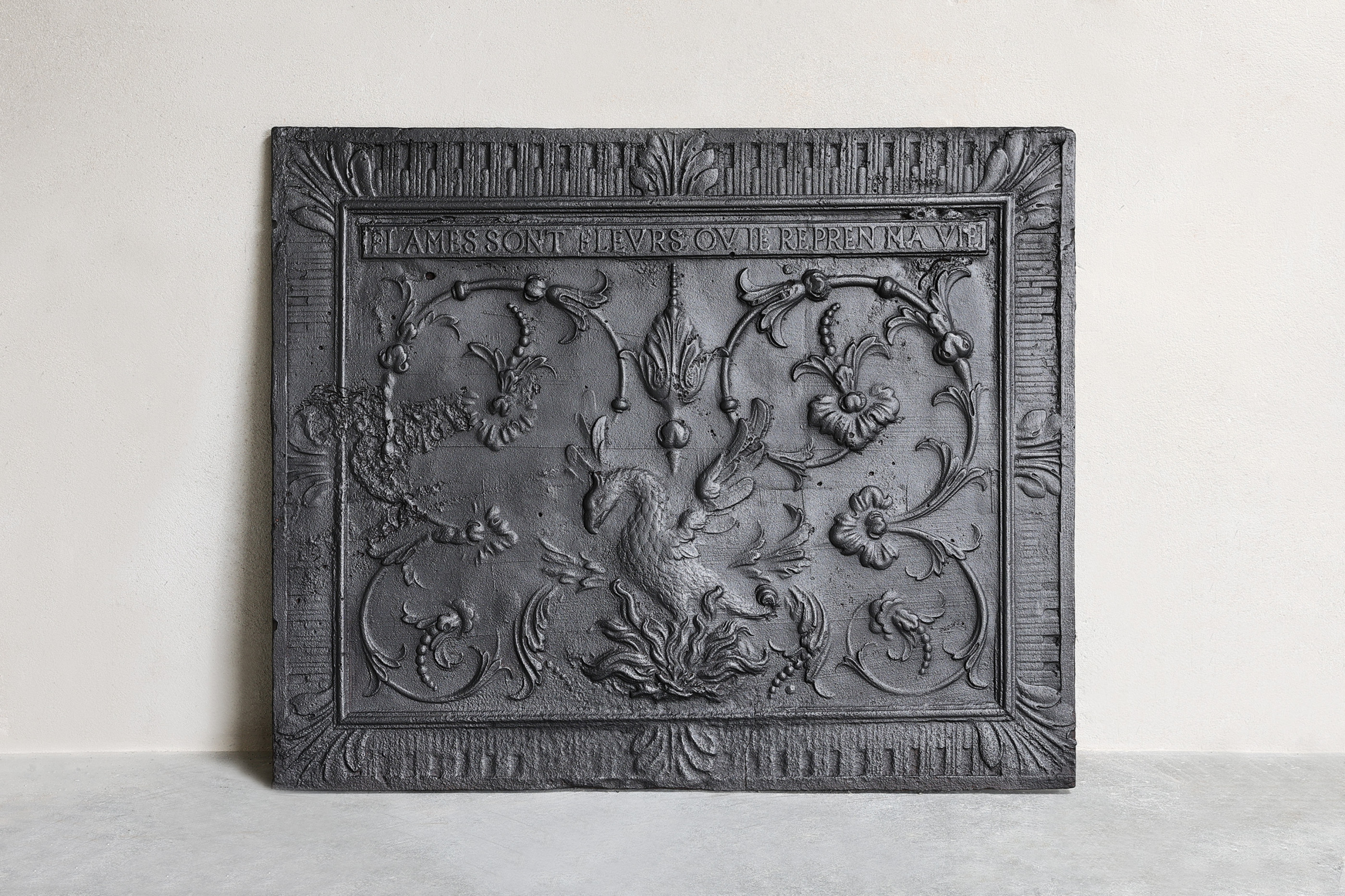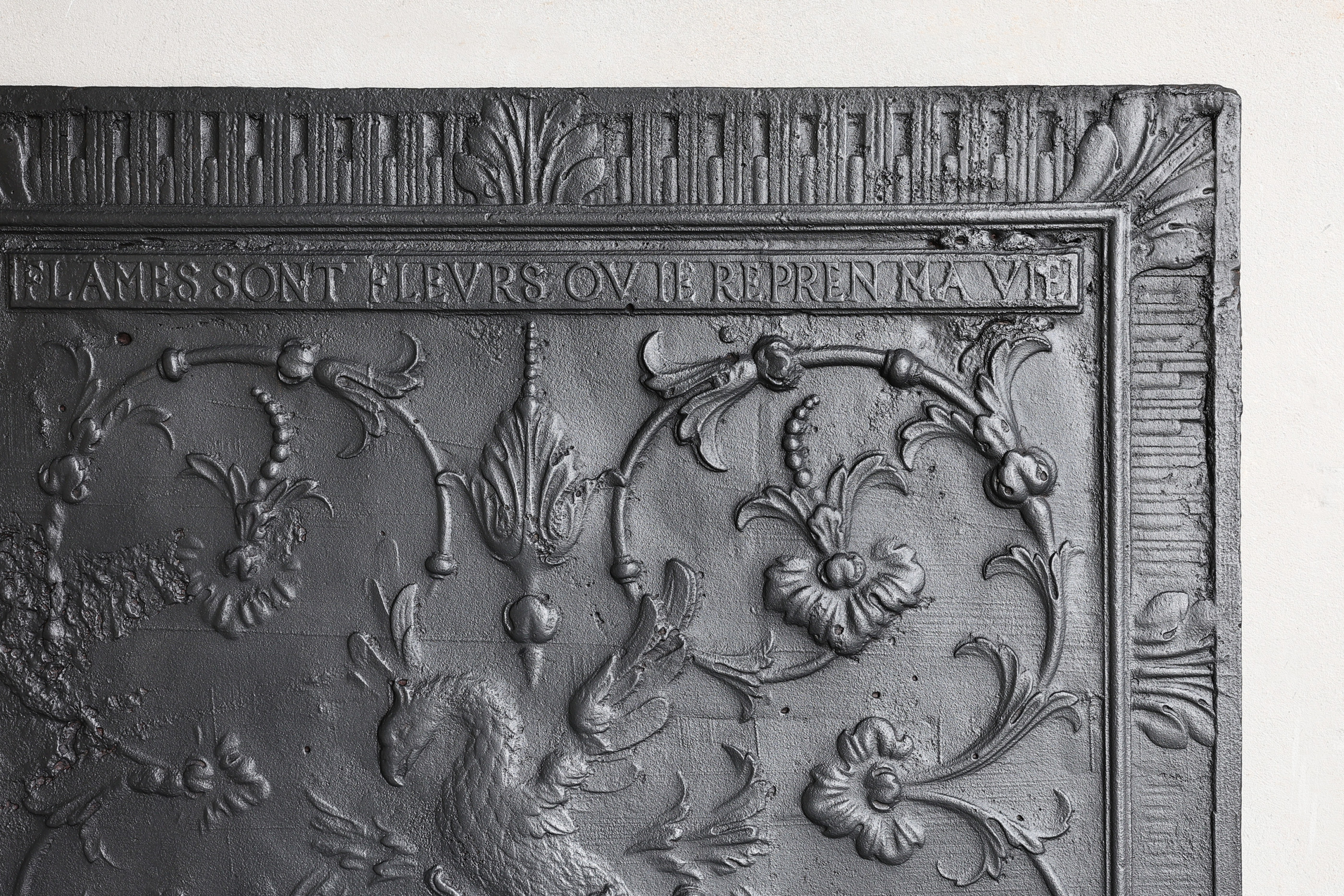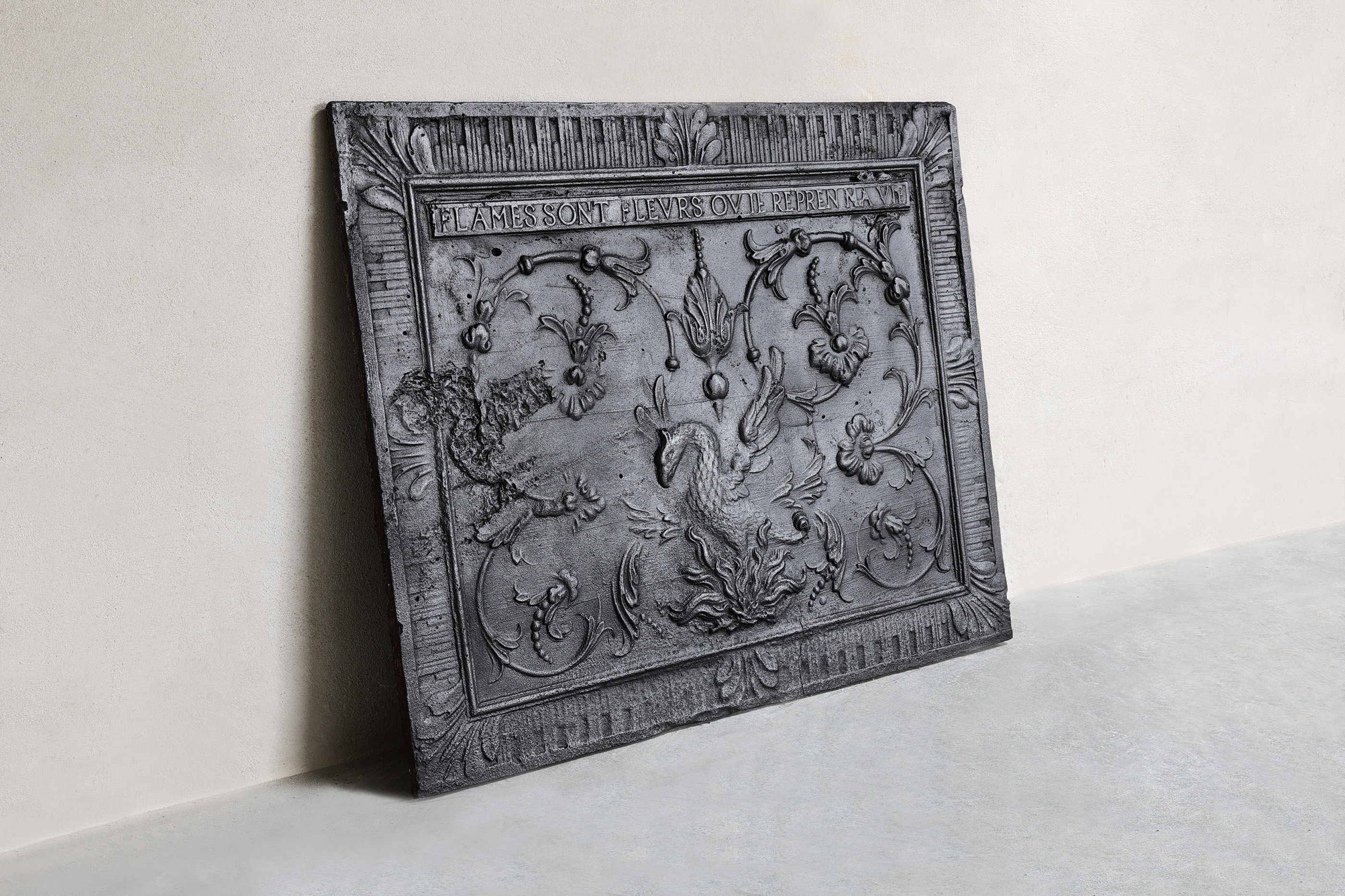 This true monumental antique fireback "plaque de cheminee" was made between 1680-1700 at the Saint-Claire foundry in Villerupt, Lorraine - France owned by M Beguinet and his wife. The foundry closed in 1708.