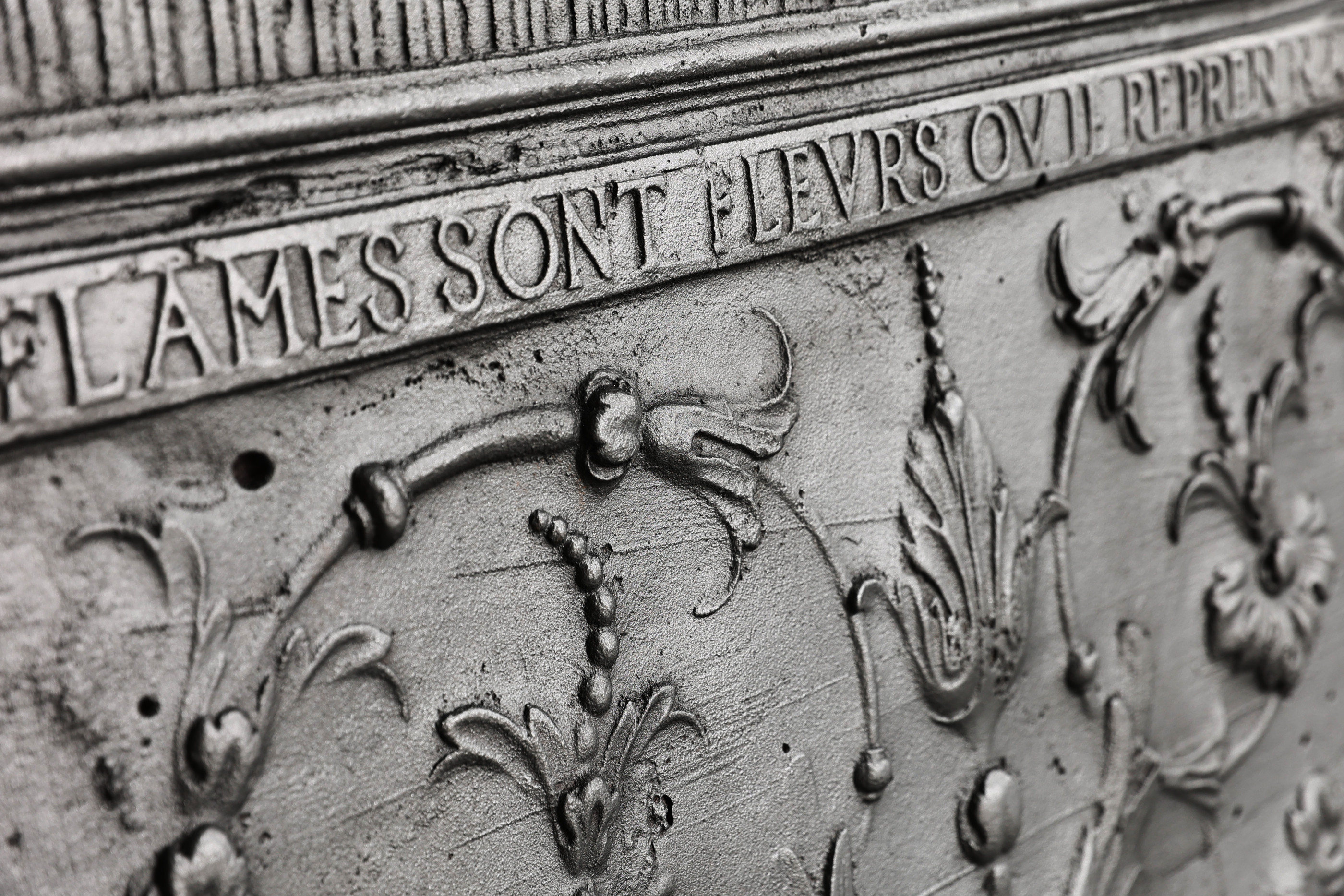 It is adorned with a phoenix which is starting to burn in an elegant arabesque decoration composed of flowers and acanthus leaves. It is also lightened up with the words "Flames sont fleurs ou je repren ma vie" in old French, meaning in English : Flammes are the flowers where I reborn, being an echo to the legend saying that the phoenix is able to return to life after being burnt.