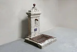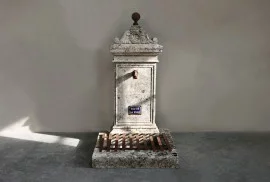 The horizontal base with integrated iron grille adds weight and visual grounding, while the proportions remain elegant and vertical. Water functionality can be restored using a discreet recirculating pump.