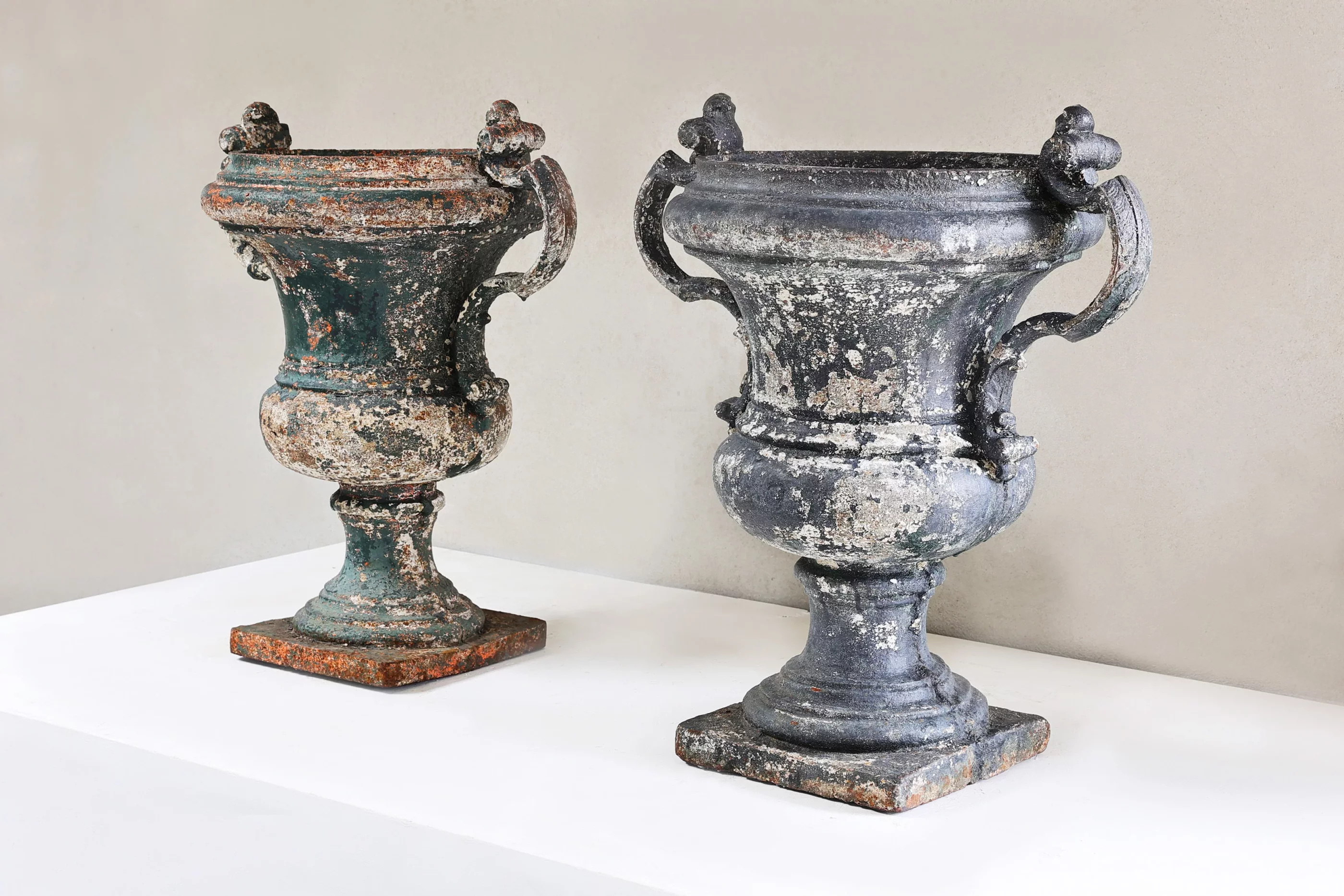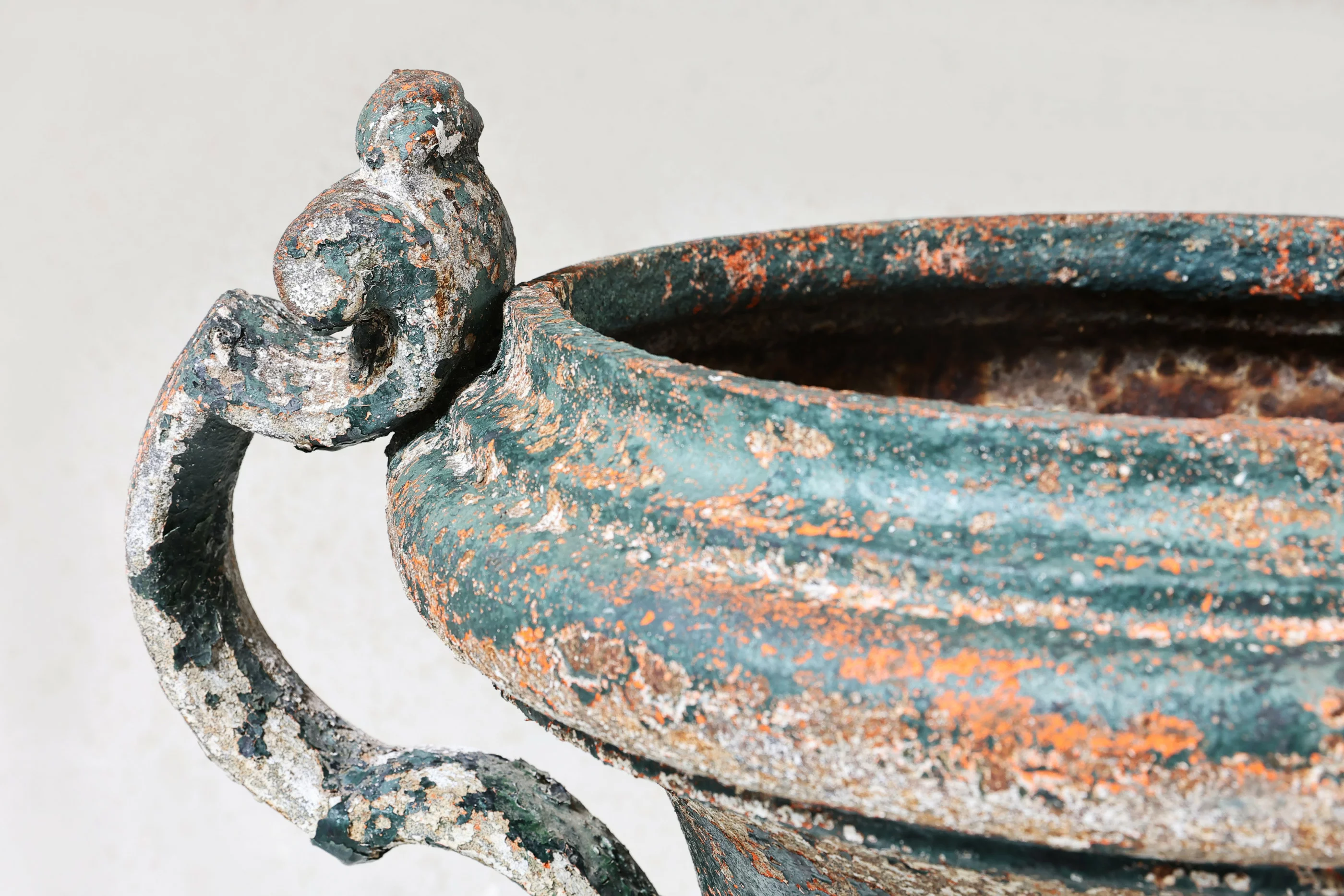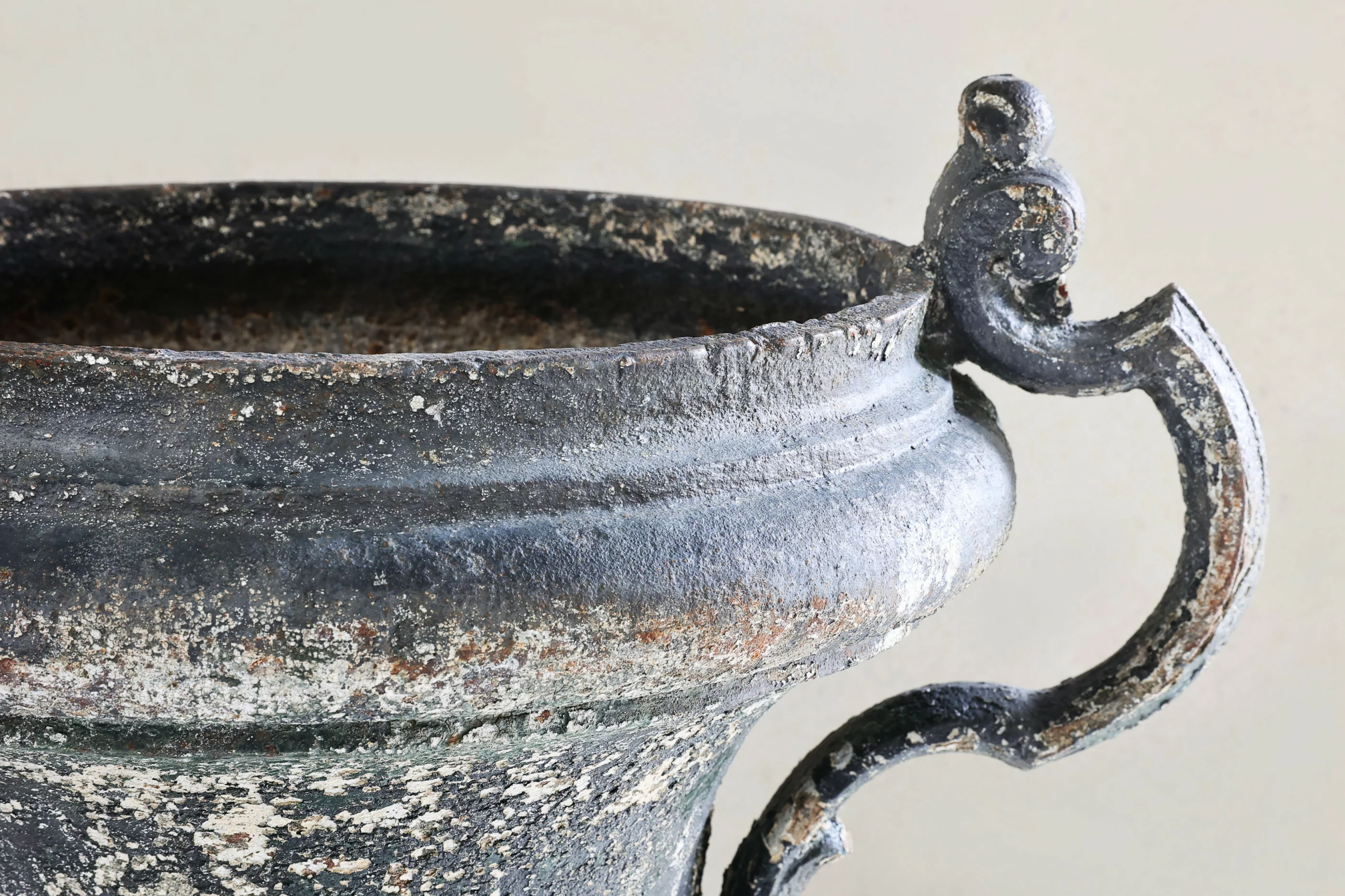 Interested in this pair of large iron garden vases on stands? You can place them on hold while finalizing your decision. We offer professional in-house crating to ensure safe delivery and provide full-service shipping to your desired location, including construction sites. For inquiries, please reach out to info@de-opkamer.nl.