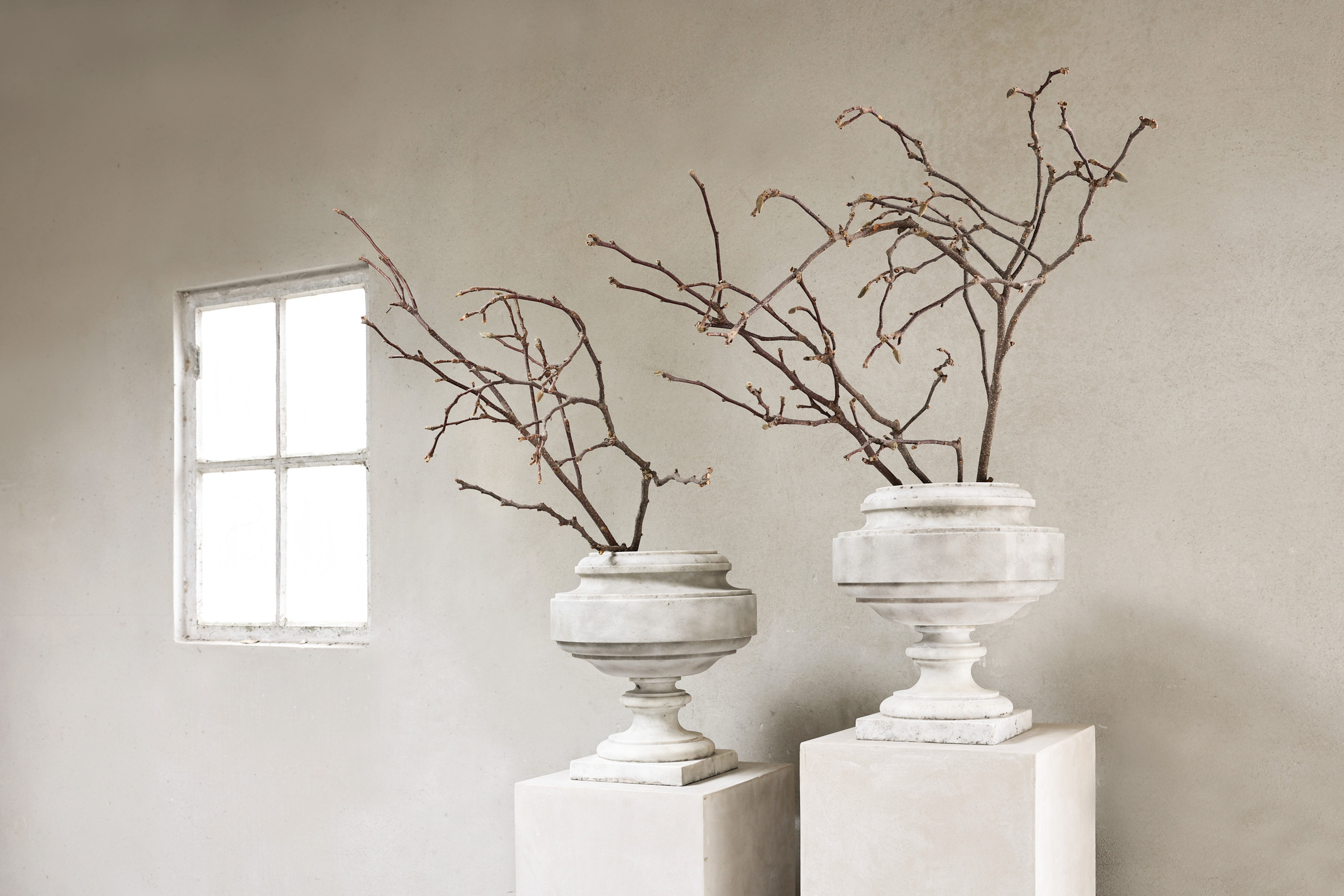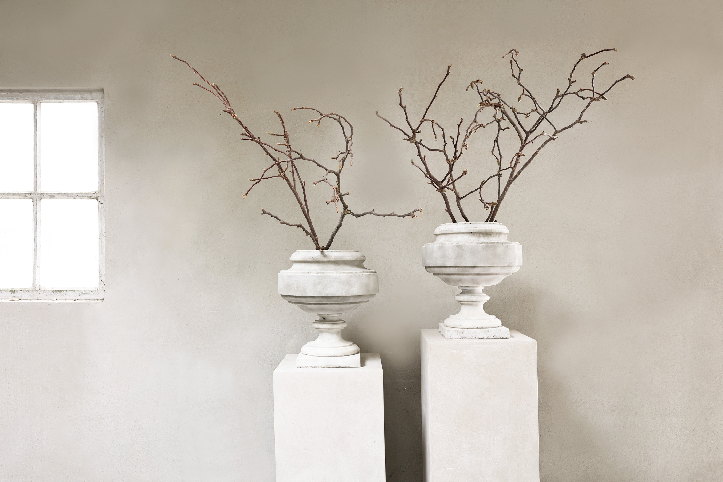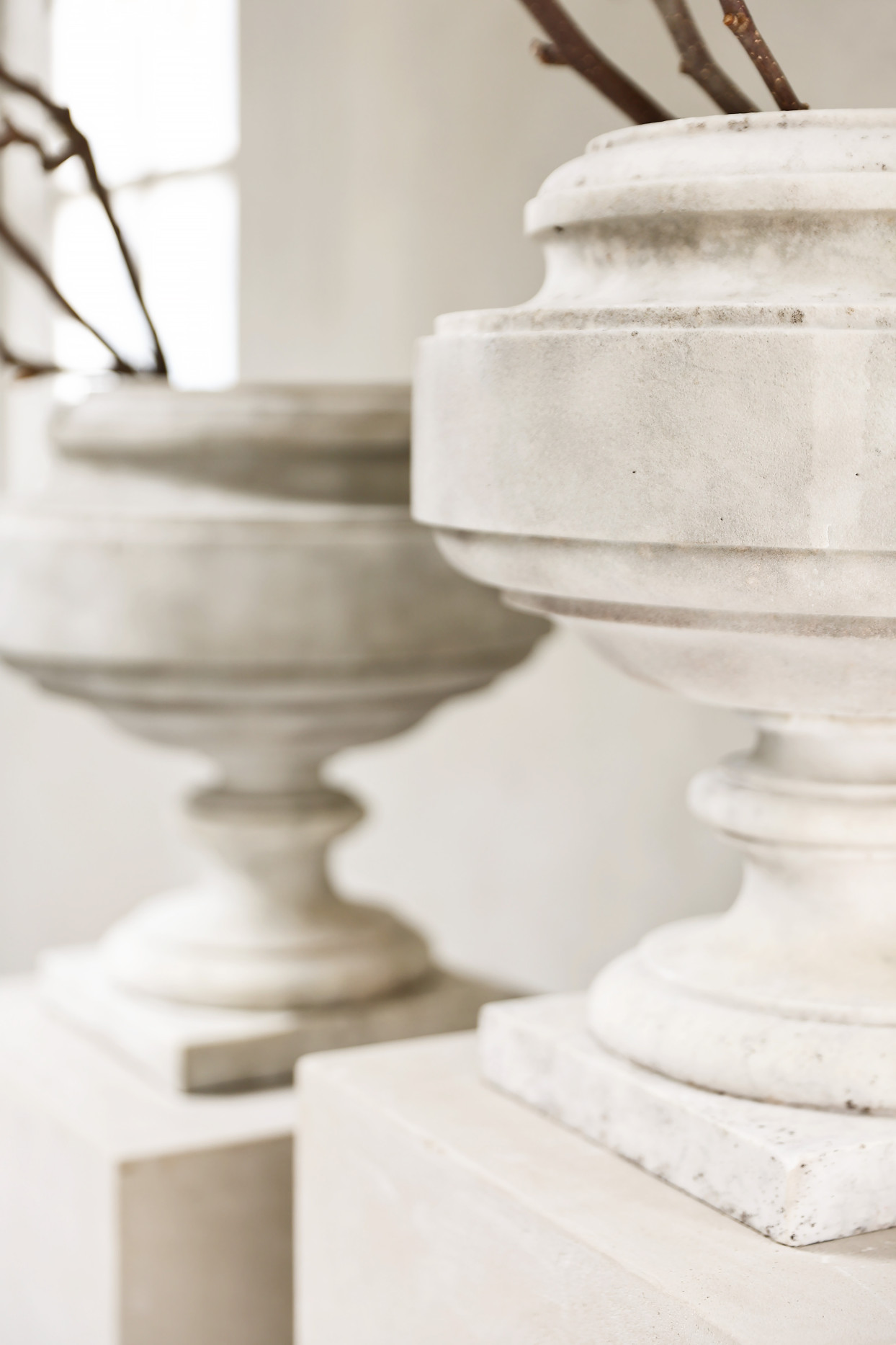 A pair of antique marble urns in white marble, offered as a matching set. The calm Neo-Classic / Directoire profile and time-softened patina suit entry halls, orangeries, and refined contemporary interiors. The set (Ref. ID100) is currently available and can be viewed by appointment in Made (The Netherlands).