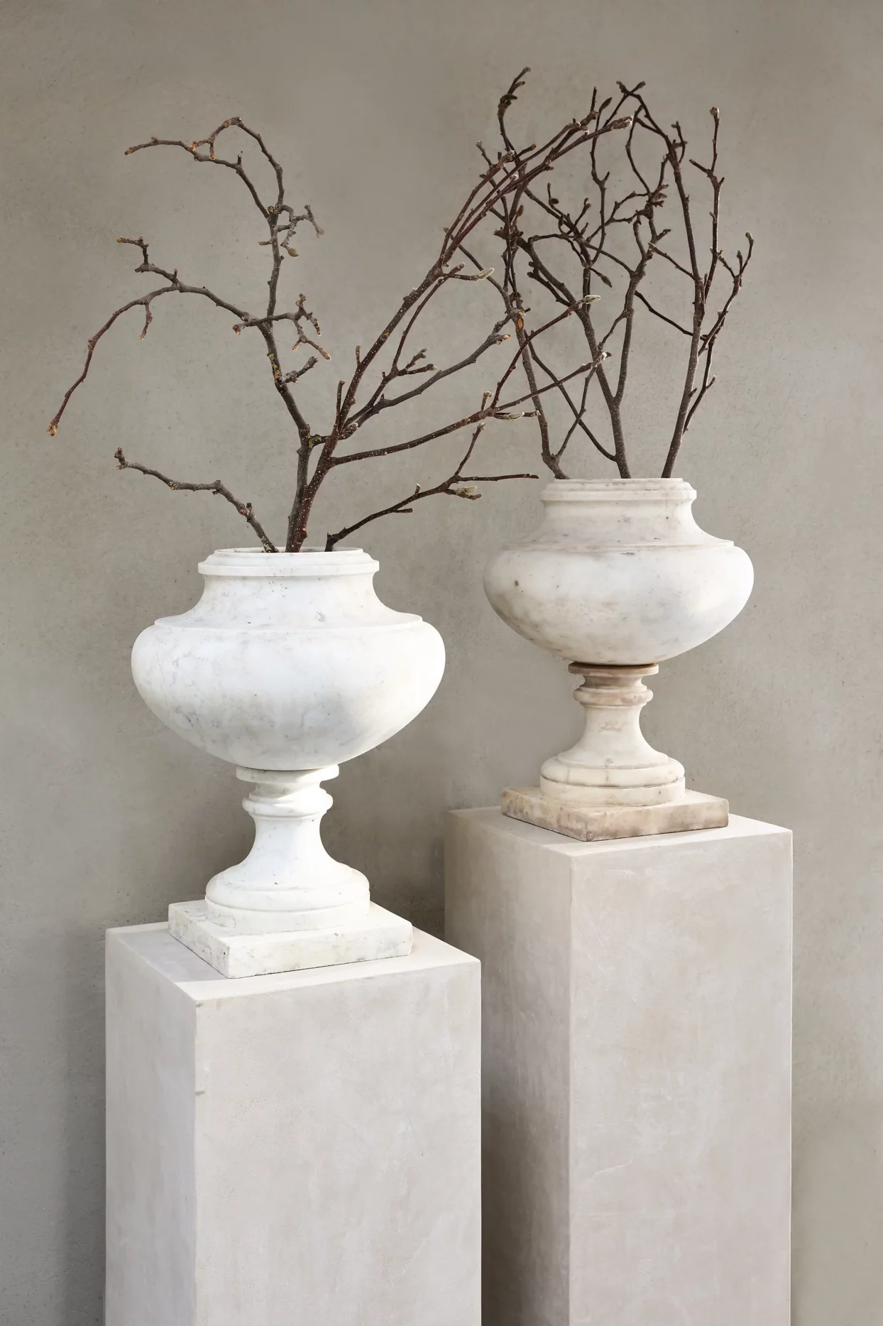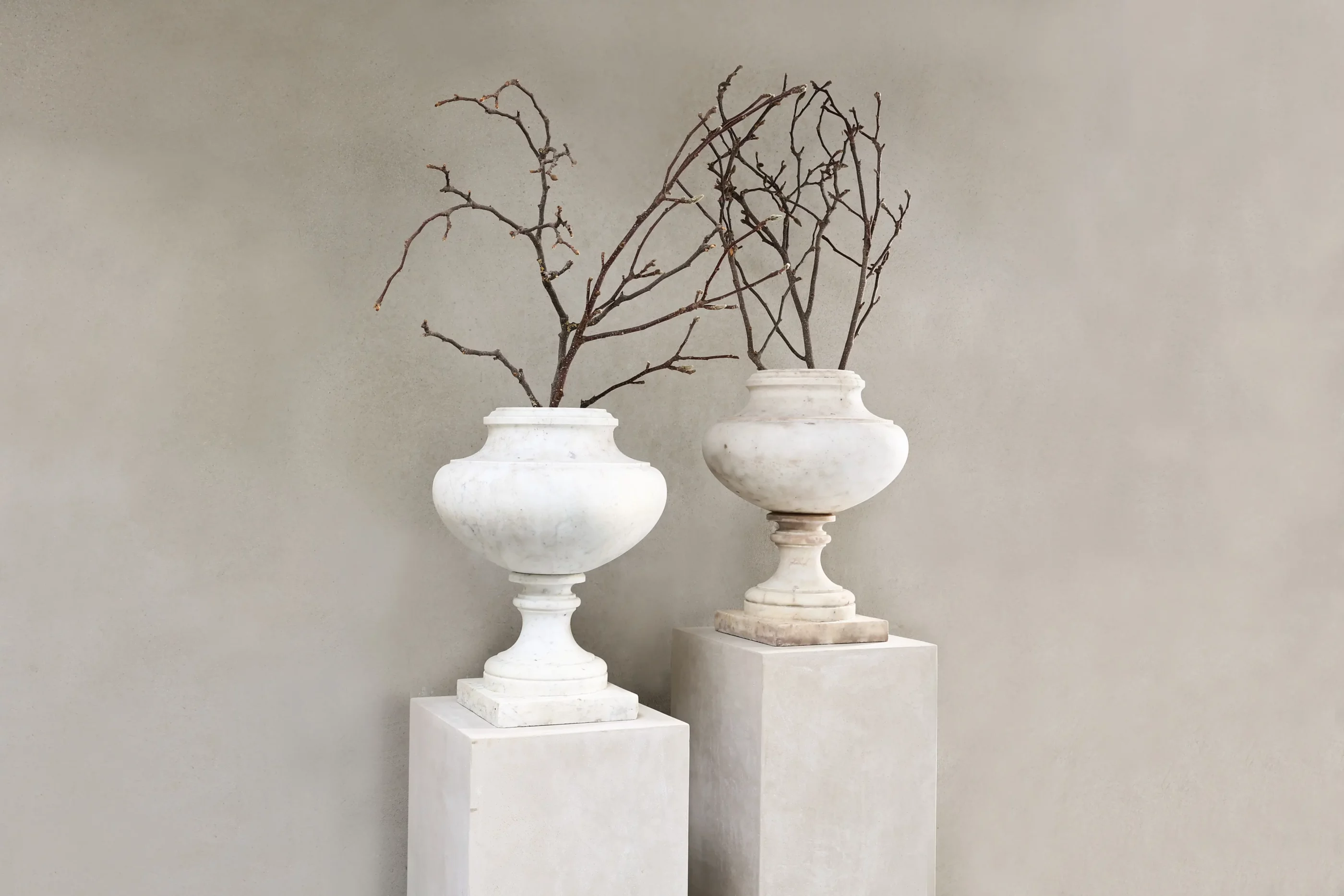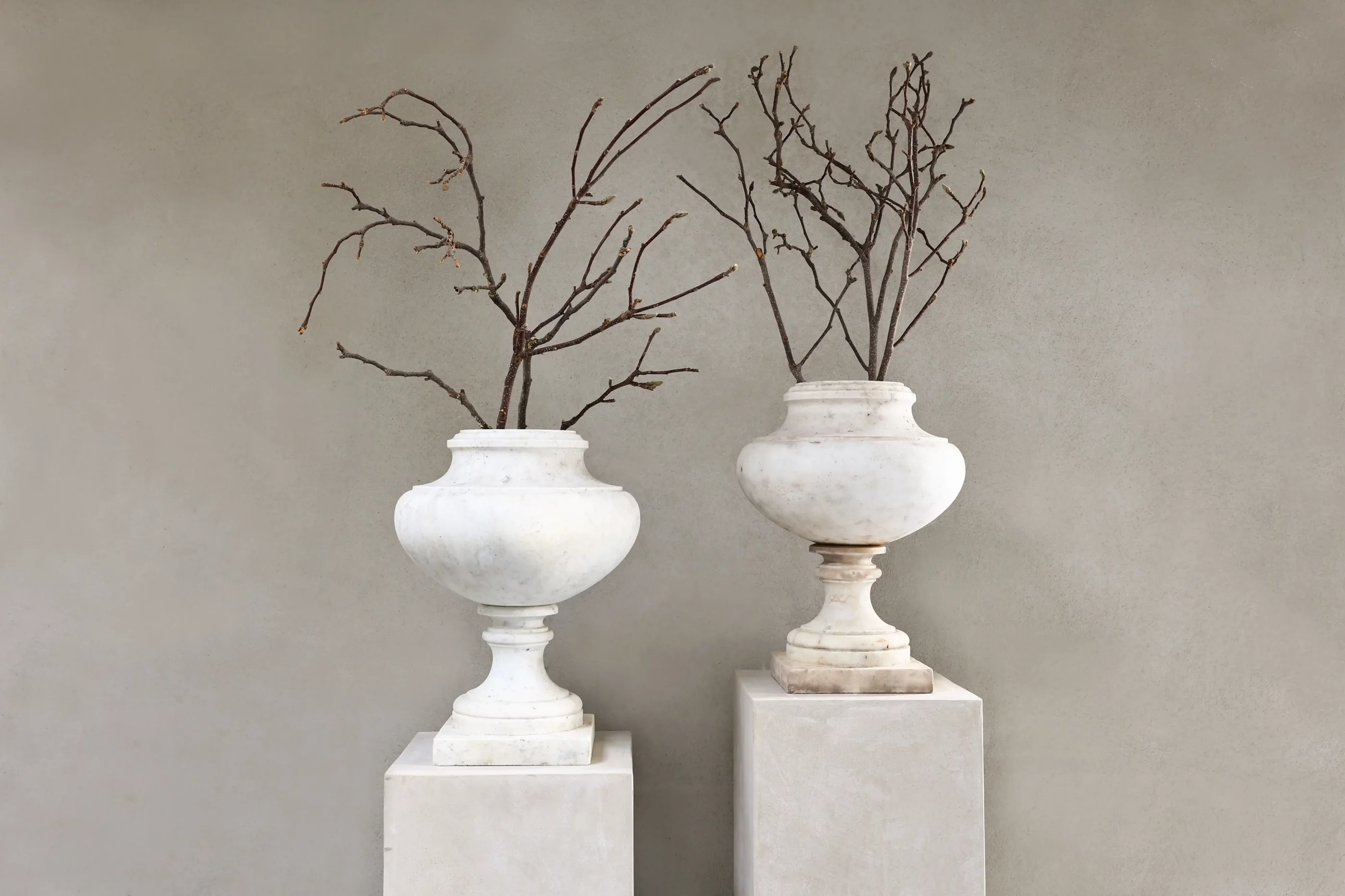A pair of antique marble urns in white marble, offered as a matching set. The calm Neo-Classic / Directoire profile and time-softened patina suit entry halls, orangeries, and refined contemporary interiors. The set (Ref. ID100) is currently available and can be viewed by appointment in Made (The Netherlands).