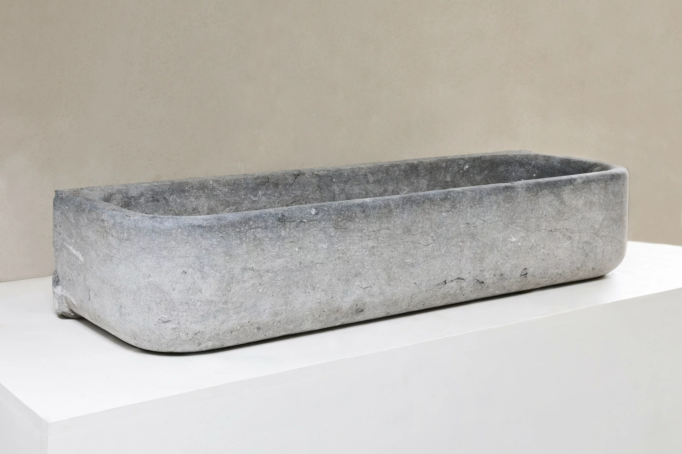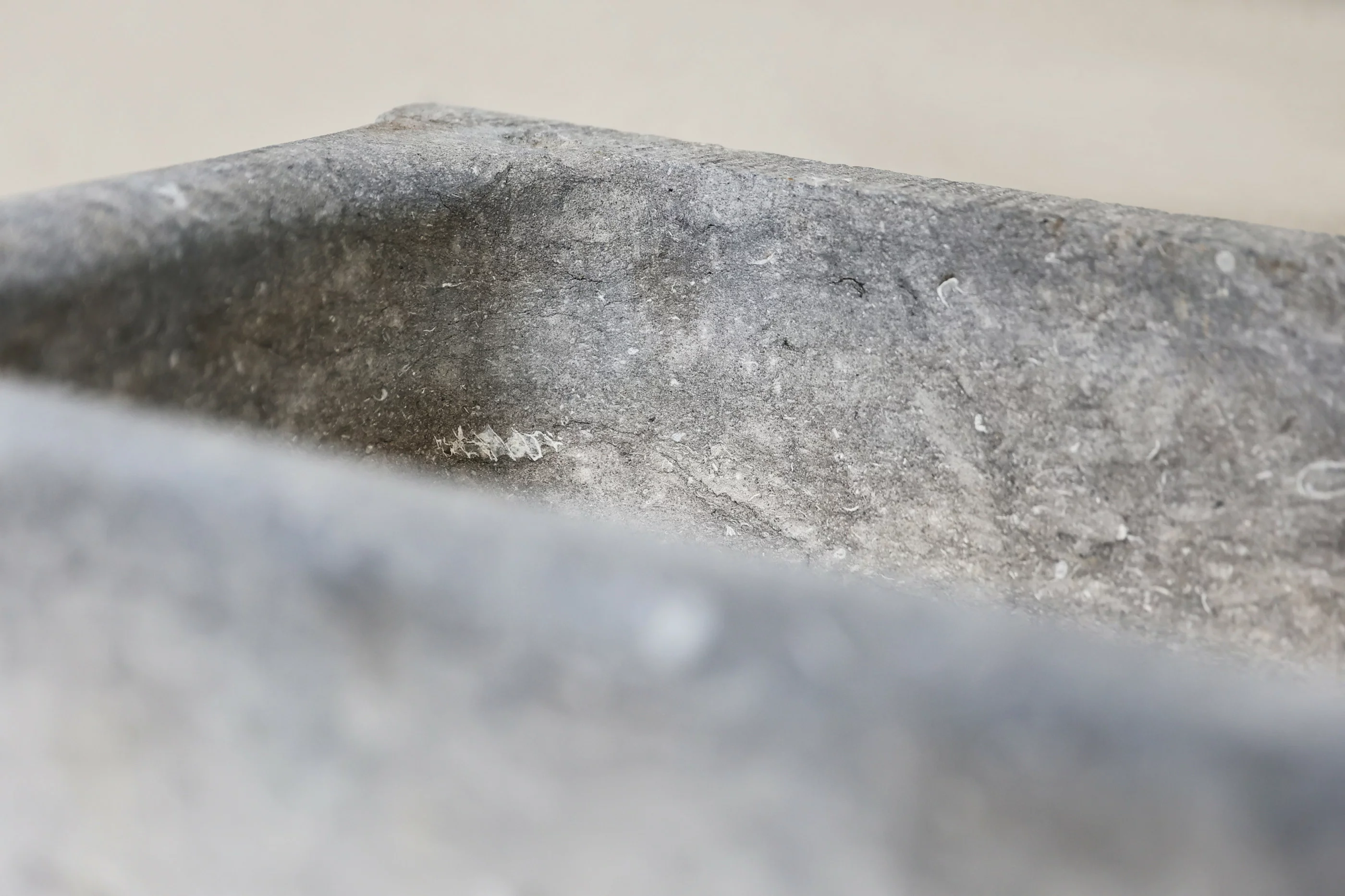 Belgian bluestone, also known as petit granit, is prized for its density, durability, and fossil-rich surface. This particular sink’s sweeping curves and softened edges set it apart from the typically angular antique basins. Such rounded examples are exceptionally rare—our team has handled thousands of antique sinks over the decades, yet only a handful with this sculptural fluidity.