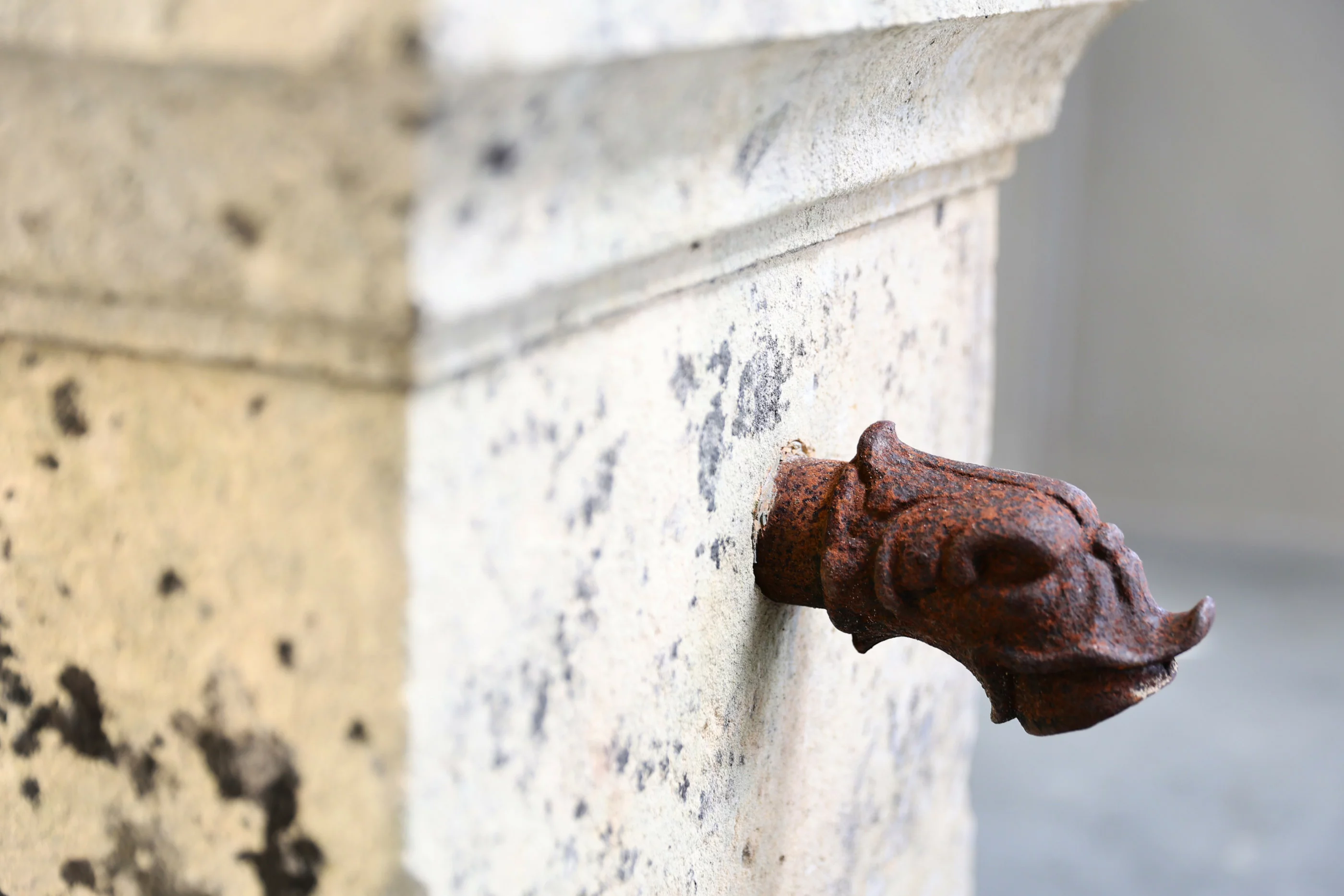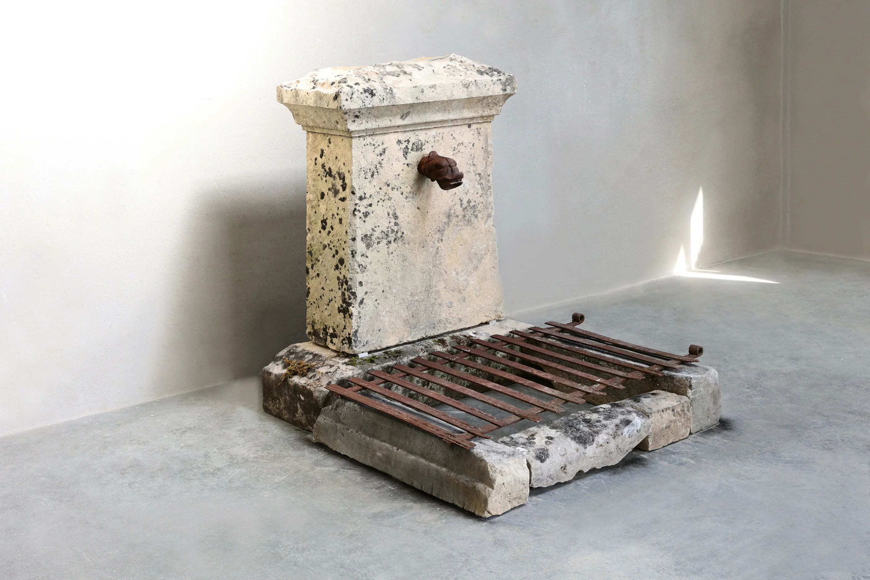 The fountain exudes history with its beautifully weathered patina and original details, such as the wrought iron grate and robust stone base. Every trace of aging highlights its authenticity, making this object truly one of a kind.