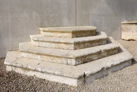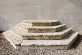 The different levels create a dynamic architectural effect and make this staircase suitable as access to a terrace, entrance, or raised garden area. The limestone shows authentic wear, color variations, and minor irregularities that enhance its character.