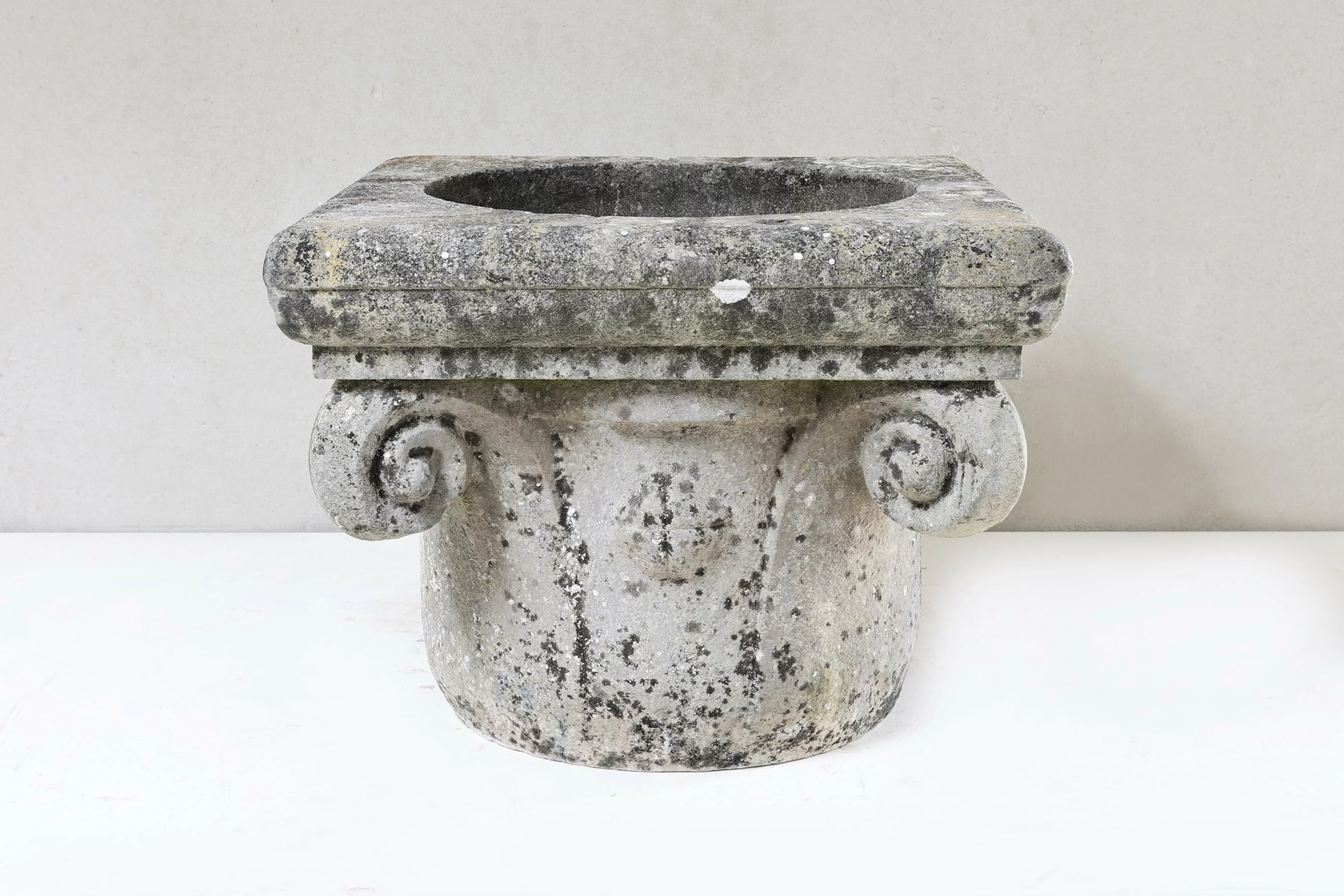 A margelle de puits is the stone curb protecting the opening of a well and providing a robust working surface. This example echoes a classical capital with graceful volutes, a motif frequently reinterpreted in 18th-century garden architecture. Hand-hewn tooling and a time-earned patina set it apart from modern reproductions.