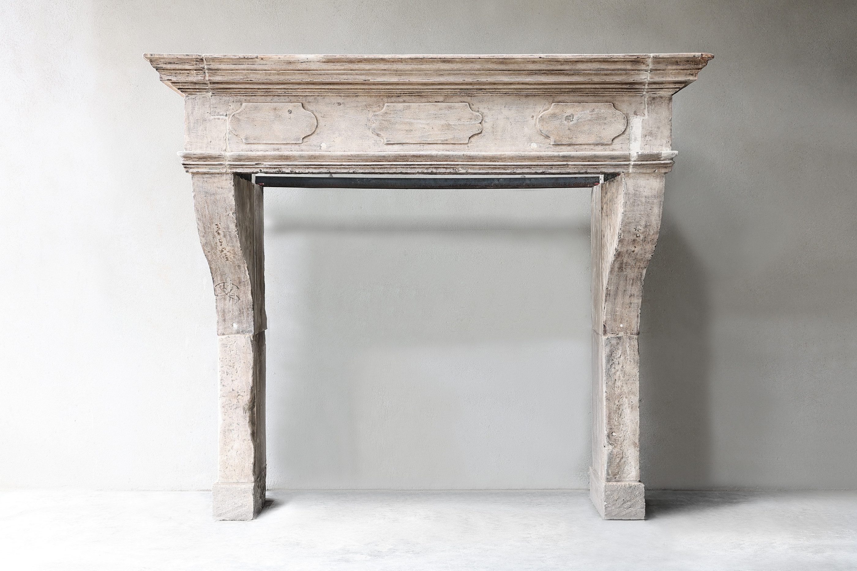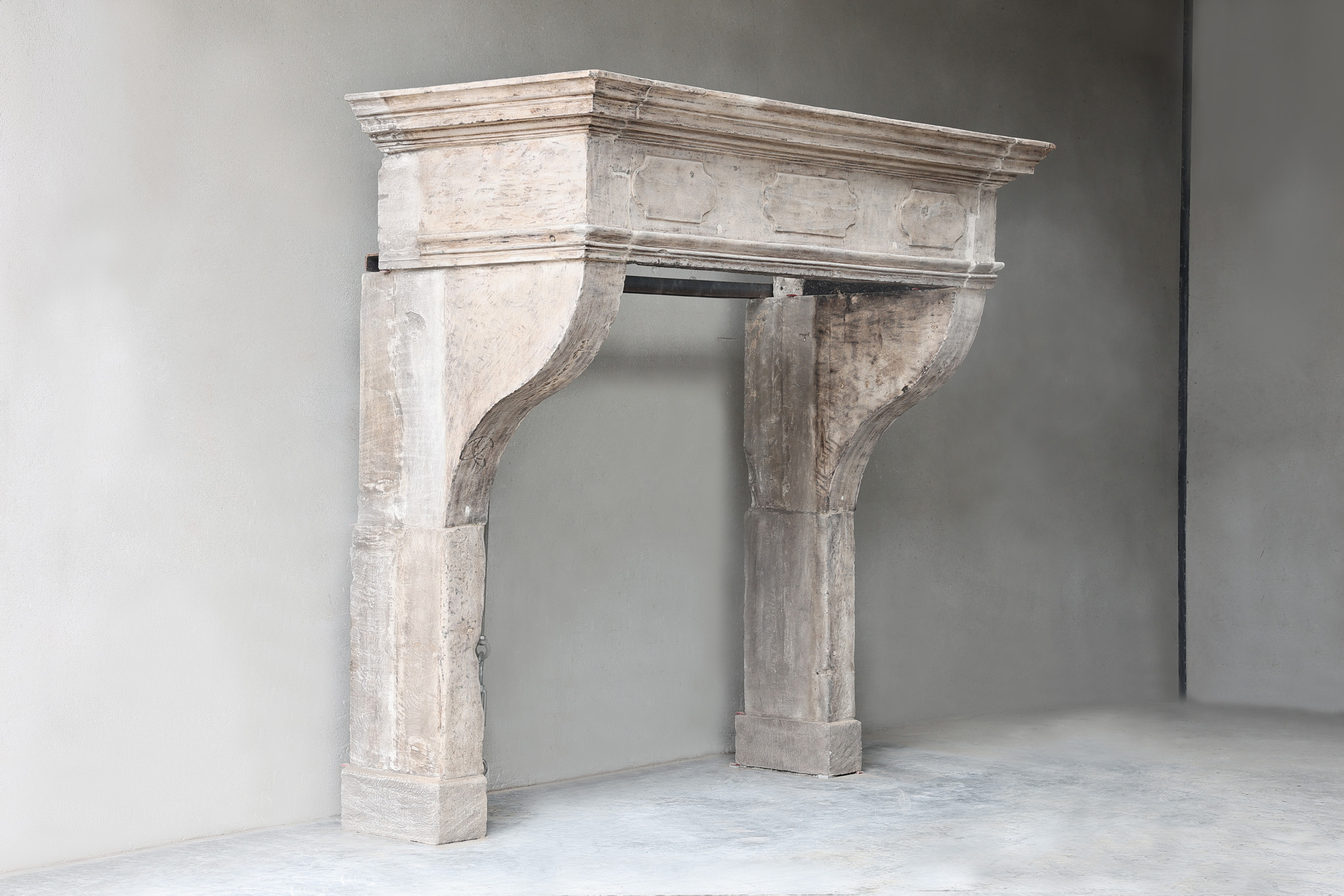 Very impressive antique castle mantelpiece made of French limestone from the 19th century! A beautiful robust fireplace with a warm color scheme and beautiful ornaments in the front part. This mantelpiece is in the style of Louis XIII and fits perfectly in various interiors.