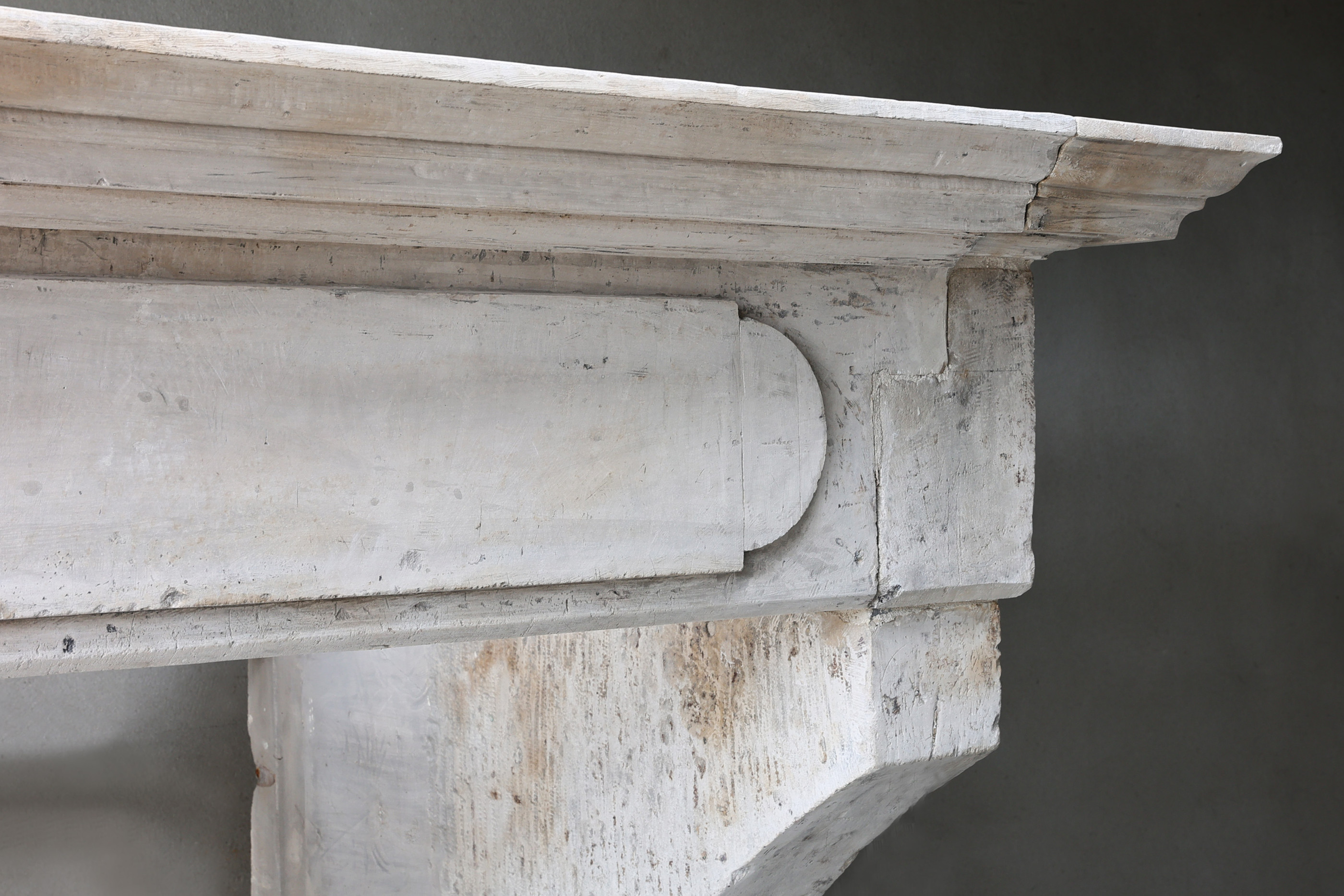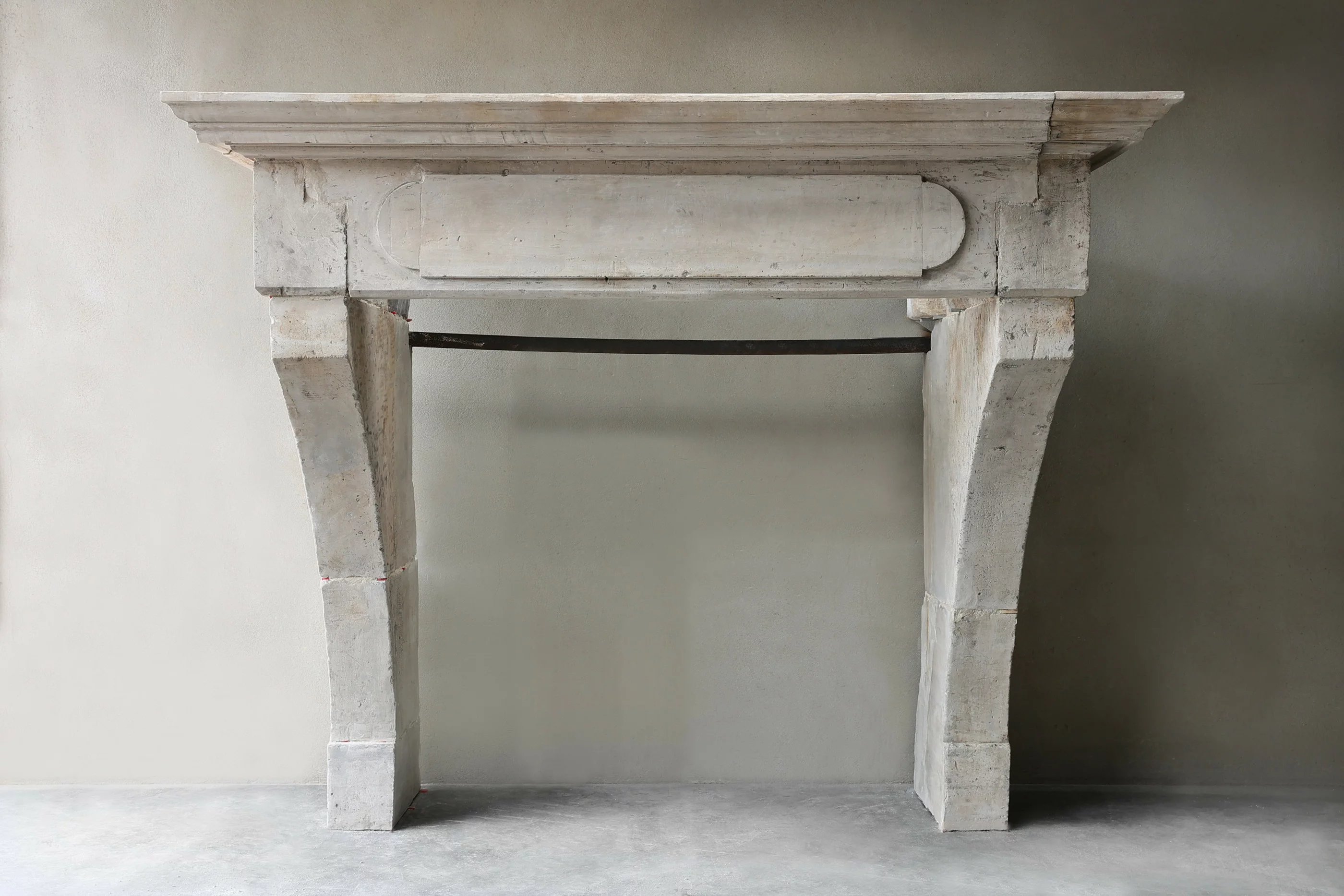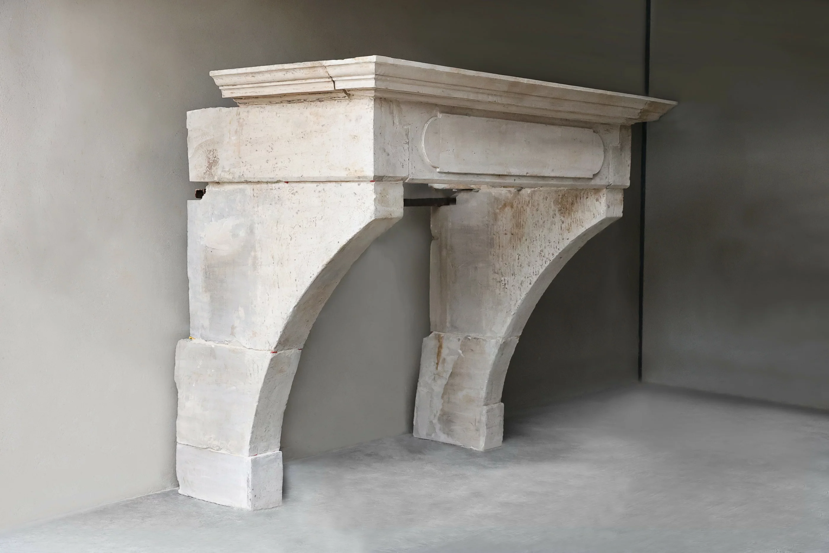 Beautiful robust castle mantelpiece made of French limestone. This antique mantle dates from the 19th century and is in the style of Louis XIII with a beautiful ornament in the middle of the front part of the fireplace. The shape of the legs is obelisk, the mantelpiece has a warm appearance with beautiful lines.