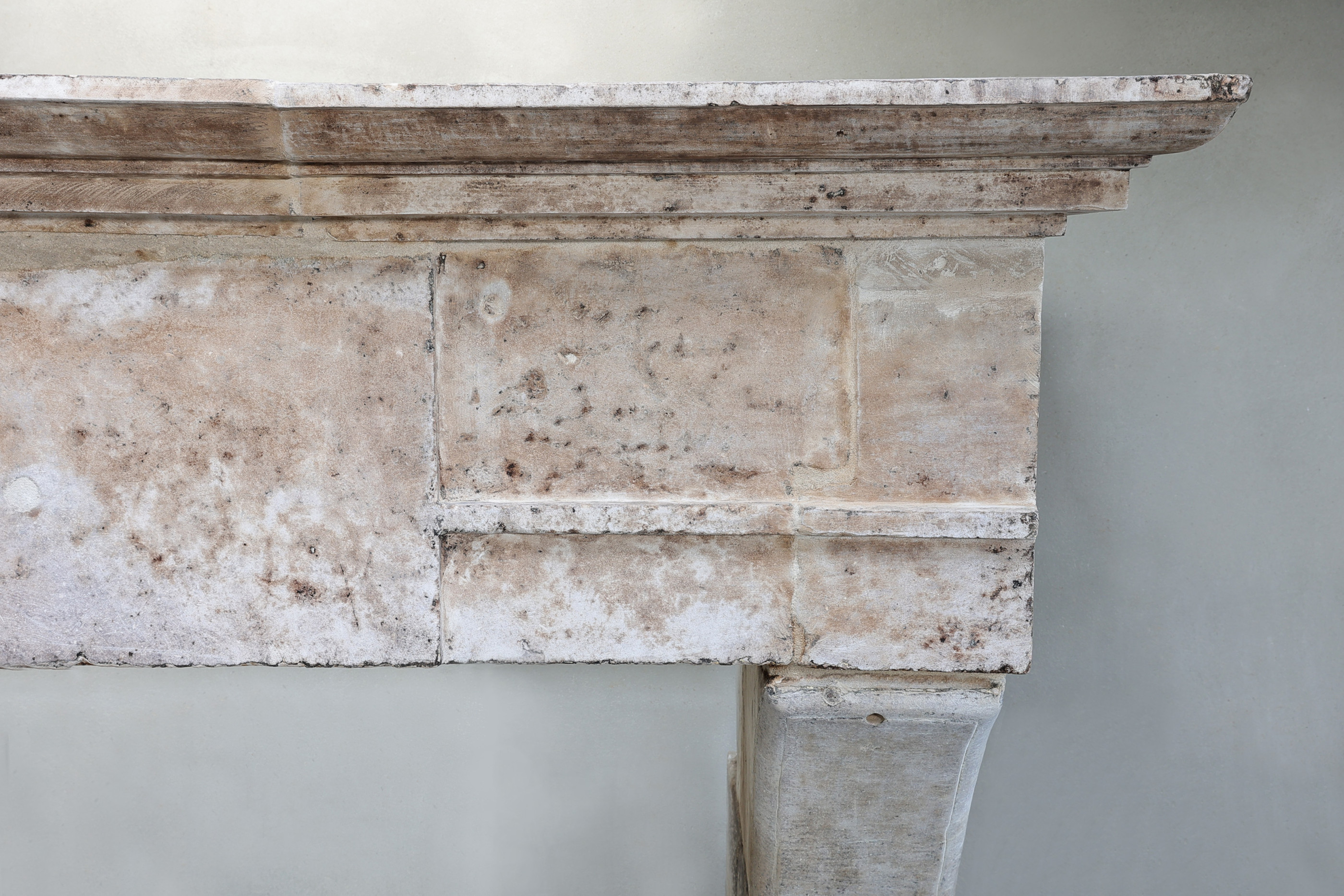 Very impressive castle mantel surround made of French limestone from the 18th century in the style of Louis XIII. A robust antique mantle with a beautiful wide top and a warm appearance!