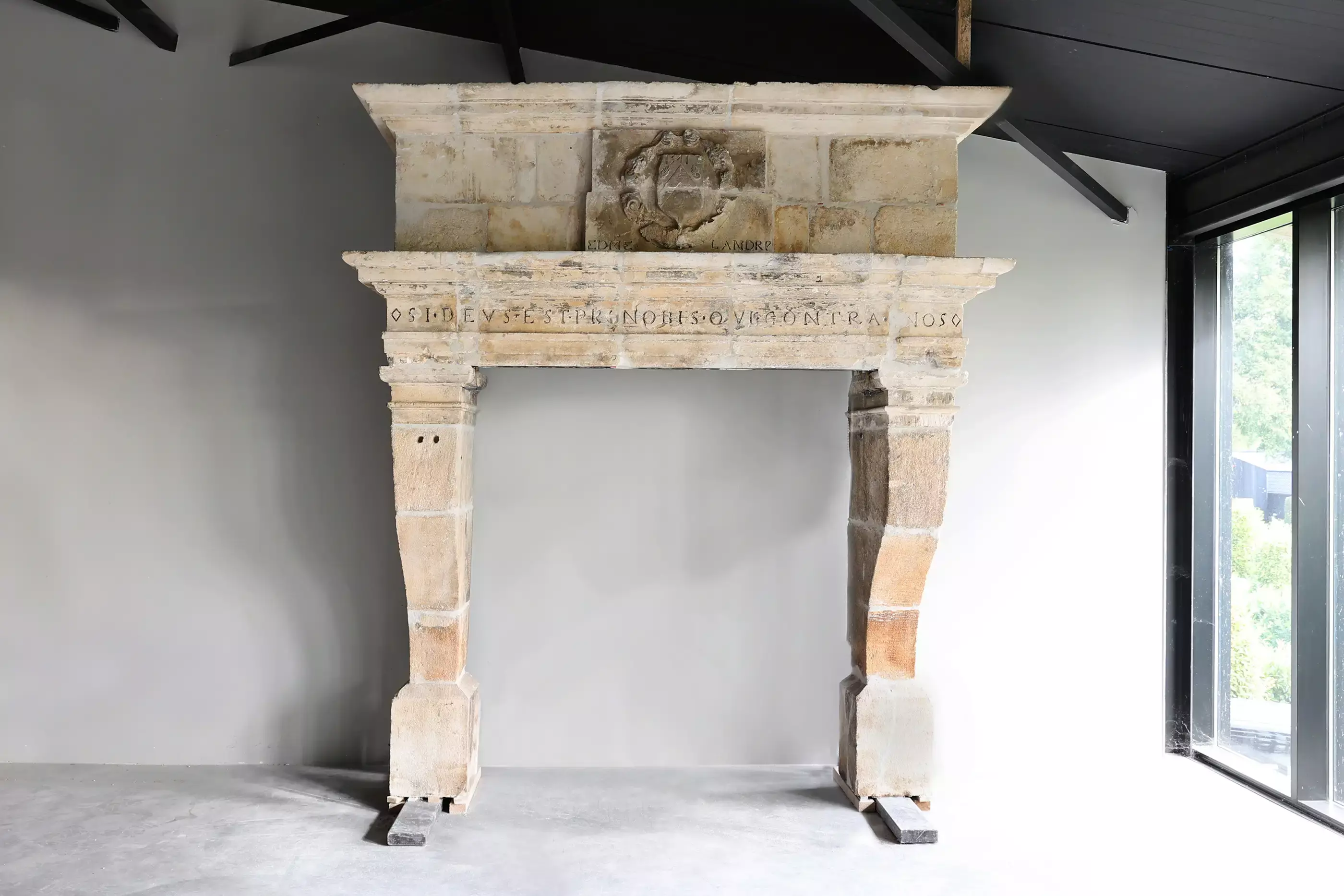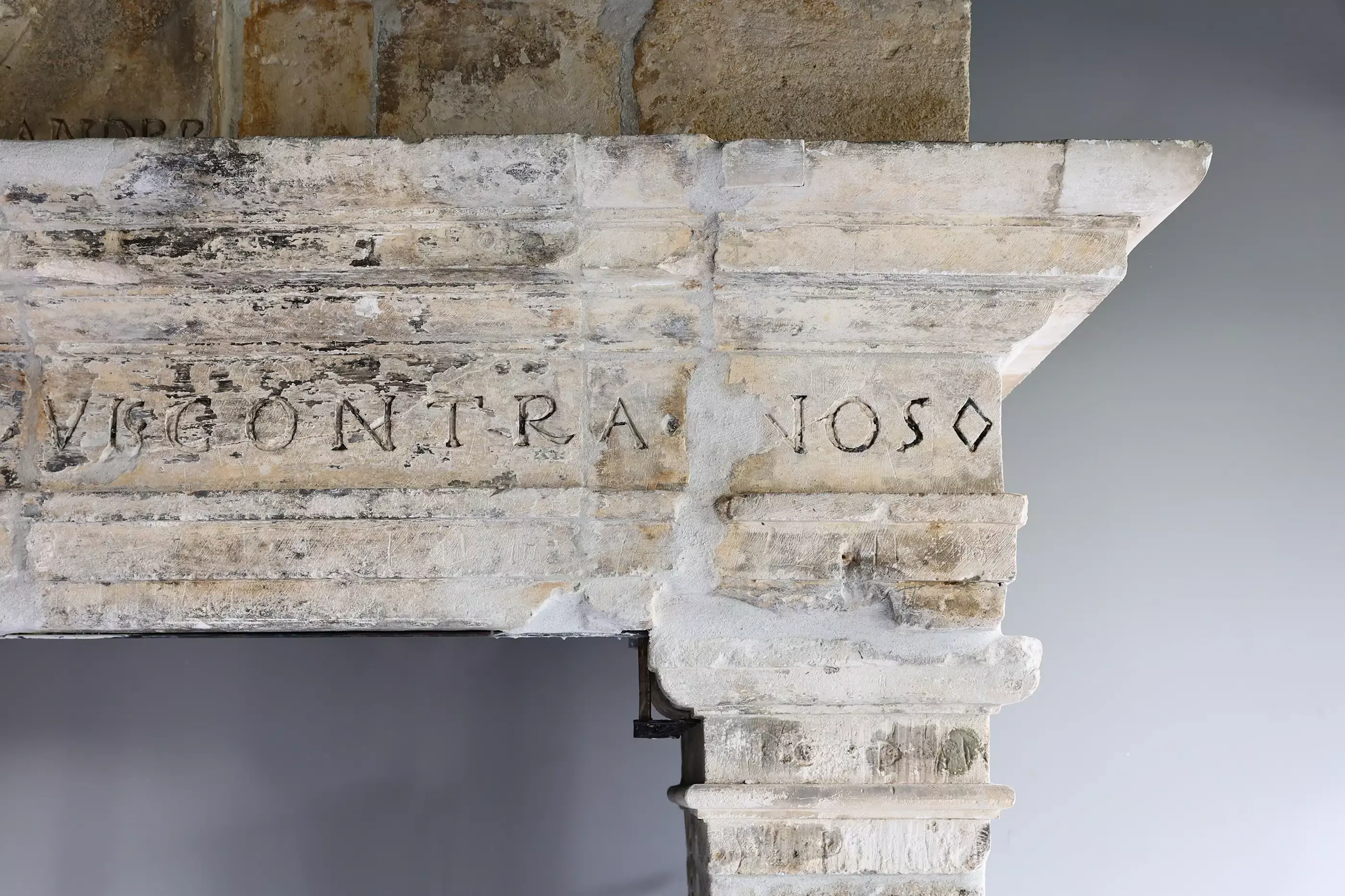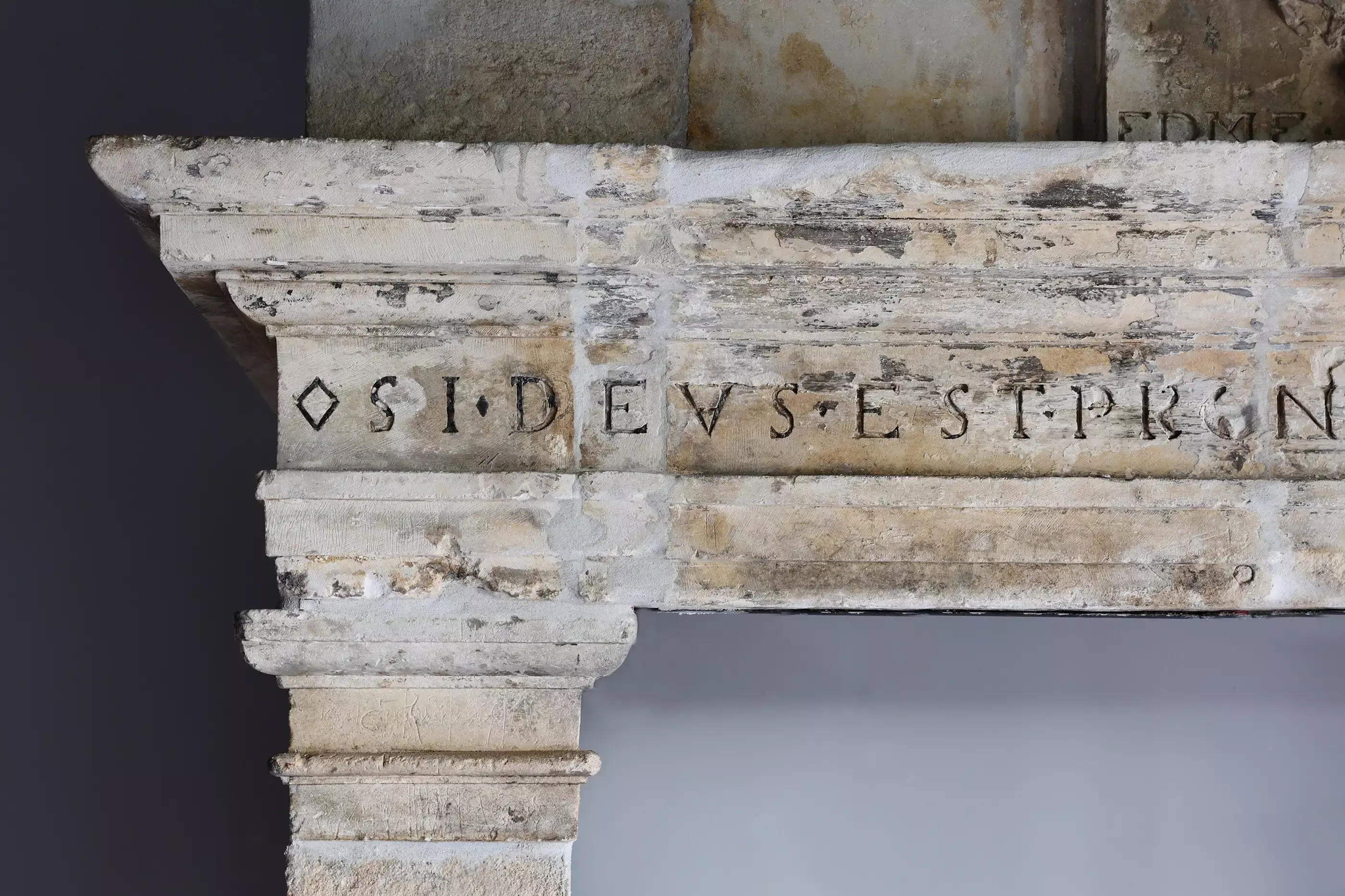 Monumental original limestone mantel with Latin inscription and heraldic cartouche – a true statement piece with history.