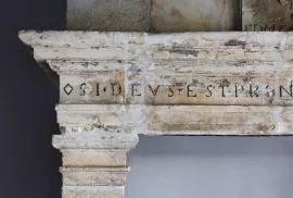 Monumental original limestone mantel with Latin inscription and heraldic cartouche – a true statement piece with history.