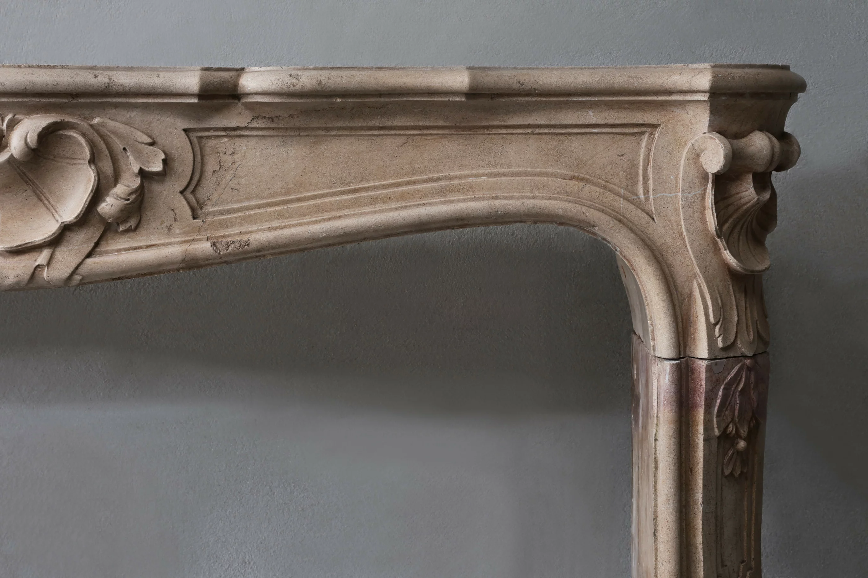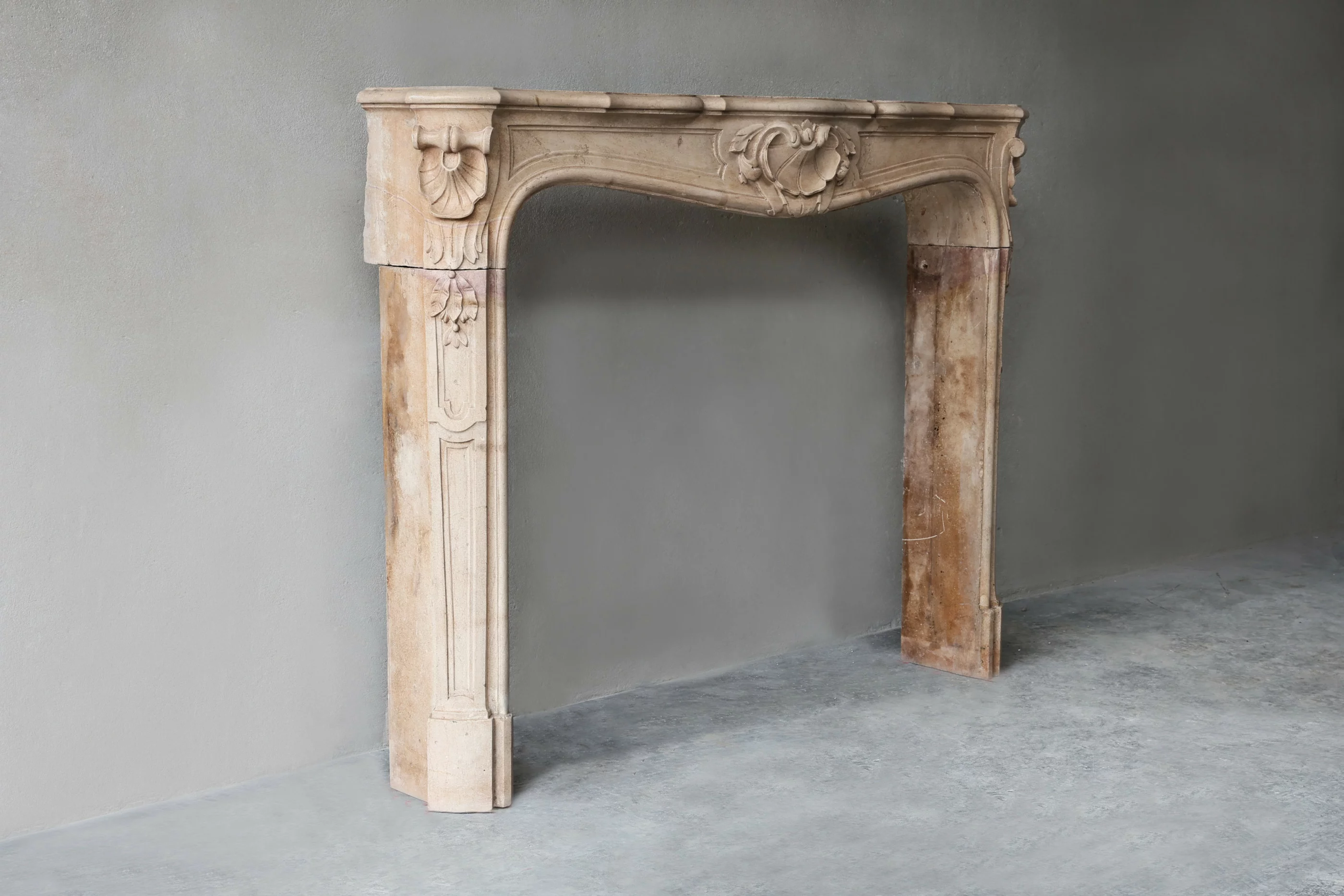 Very nice antique fireplace of French Burgundian stone from the 19th century. This fireplace is in the style of Louis XV and has a beautiful scallop in the middle of the front part and also continuous ornaments on the legs. A beautiful fireplace with a warm appearance due to the Burgundian stone.