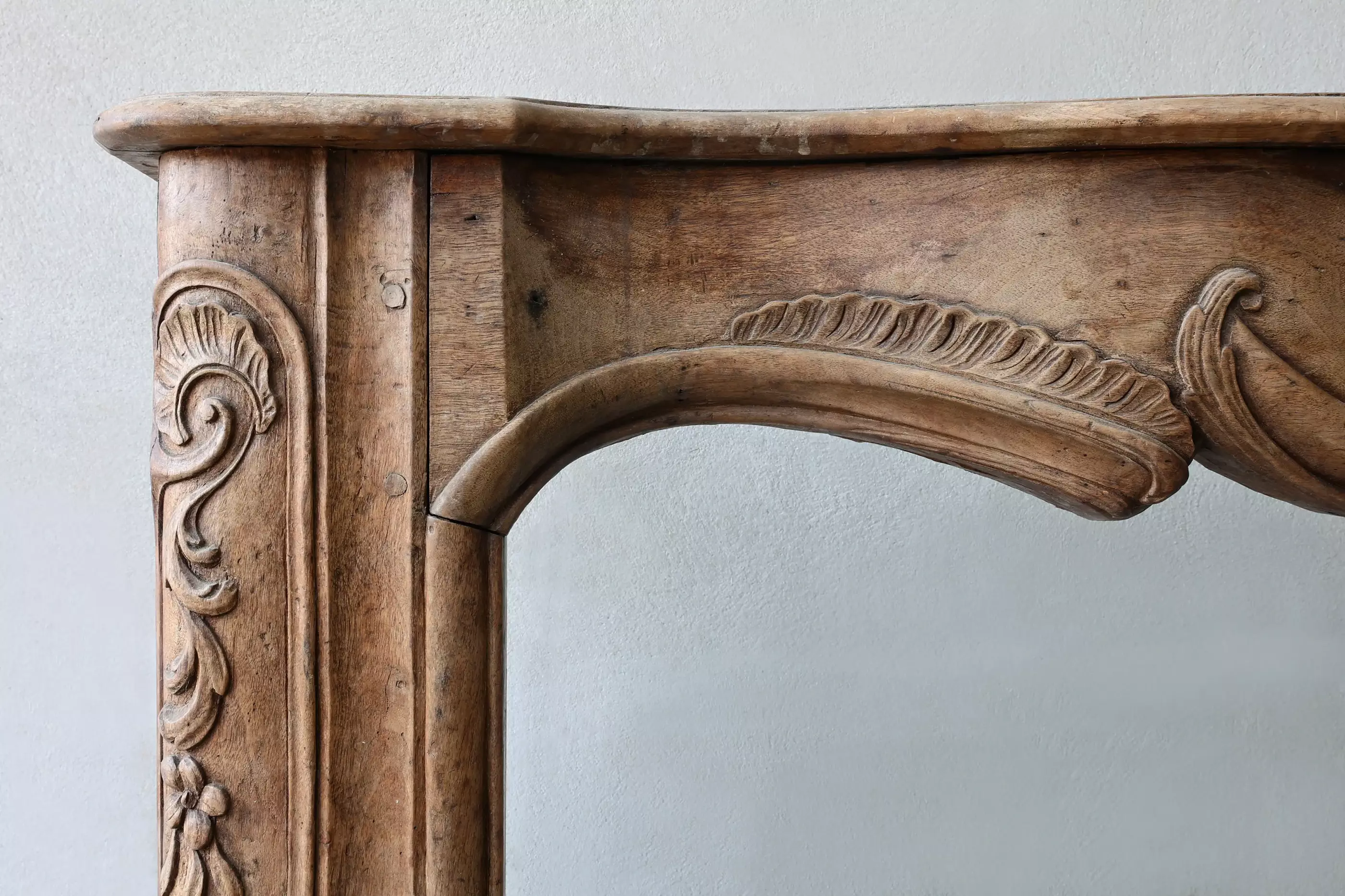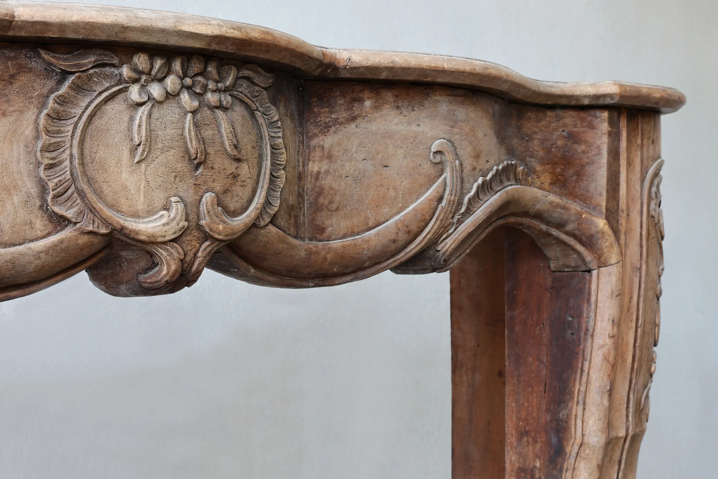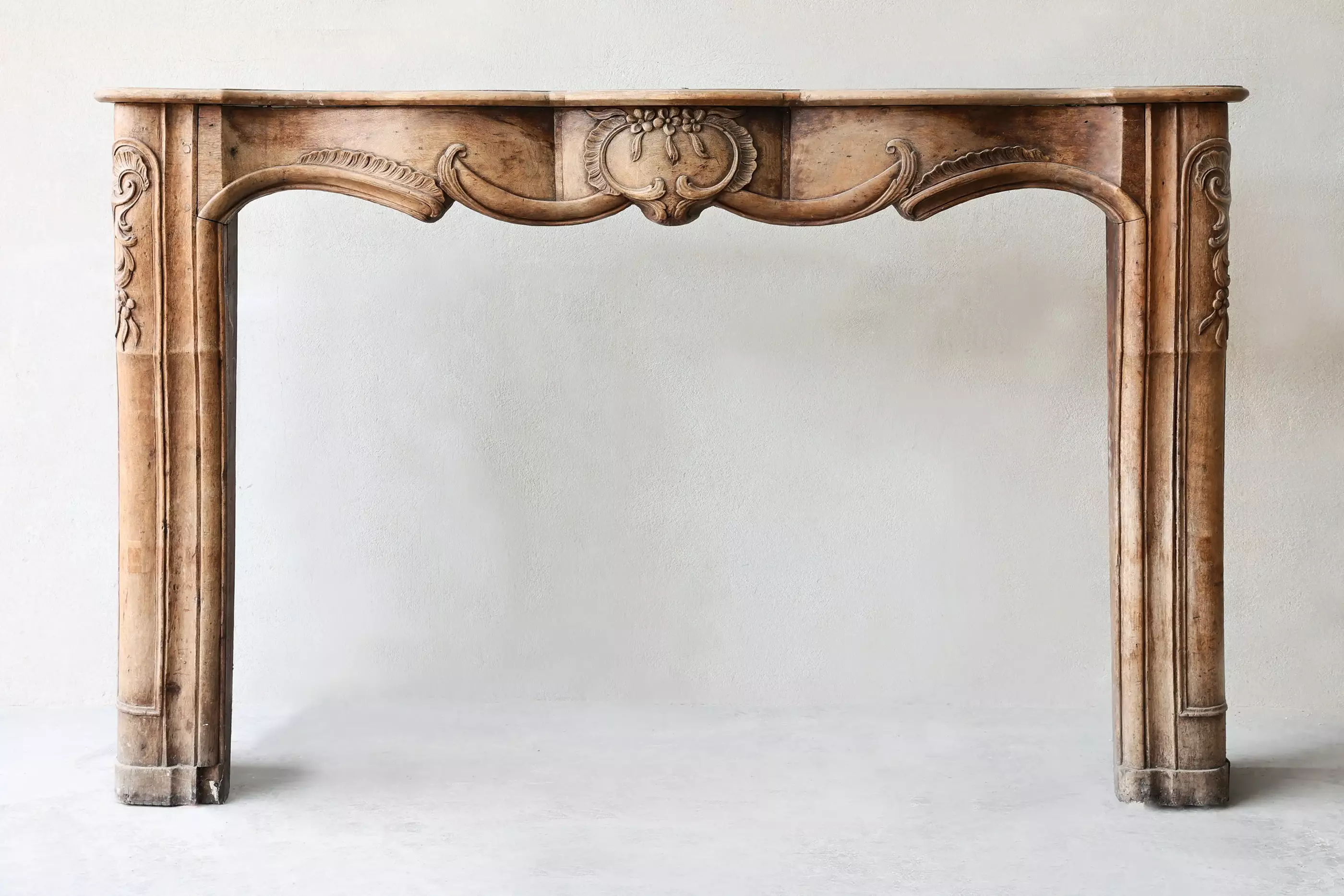 This elegant antique French mantel is a rare example of the Louis XV style, characterised by its soft, curved lines and refined carved ornamentation. The central cartouche and flowing side scrolls create a graceful movement typical of 18th-century French design.