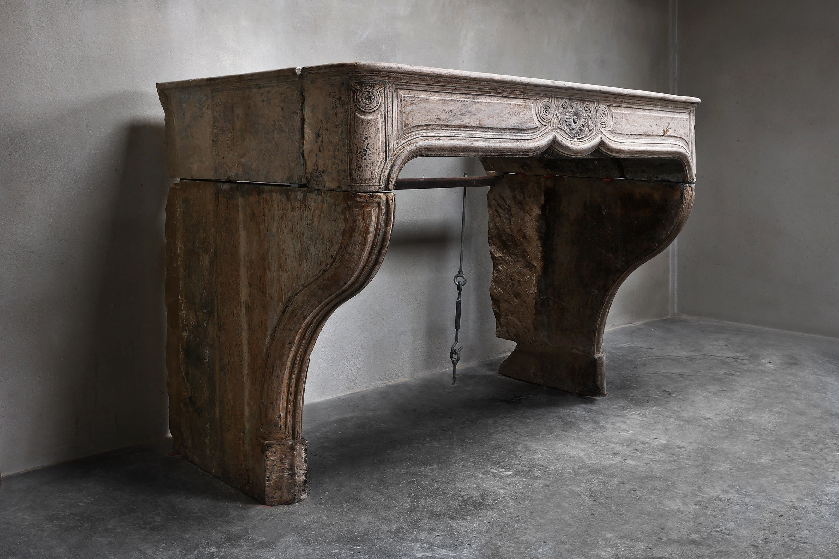 A beautiful antique French limestone fireplace in the style of Louis XV from the 19th century. This fireplace has a very nice front part with ornaments and lines! The round shapes also ensure that the fireplace radiates elegance. A unique fireplace within our collection of antique fireplaces!