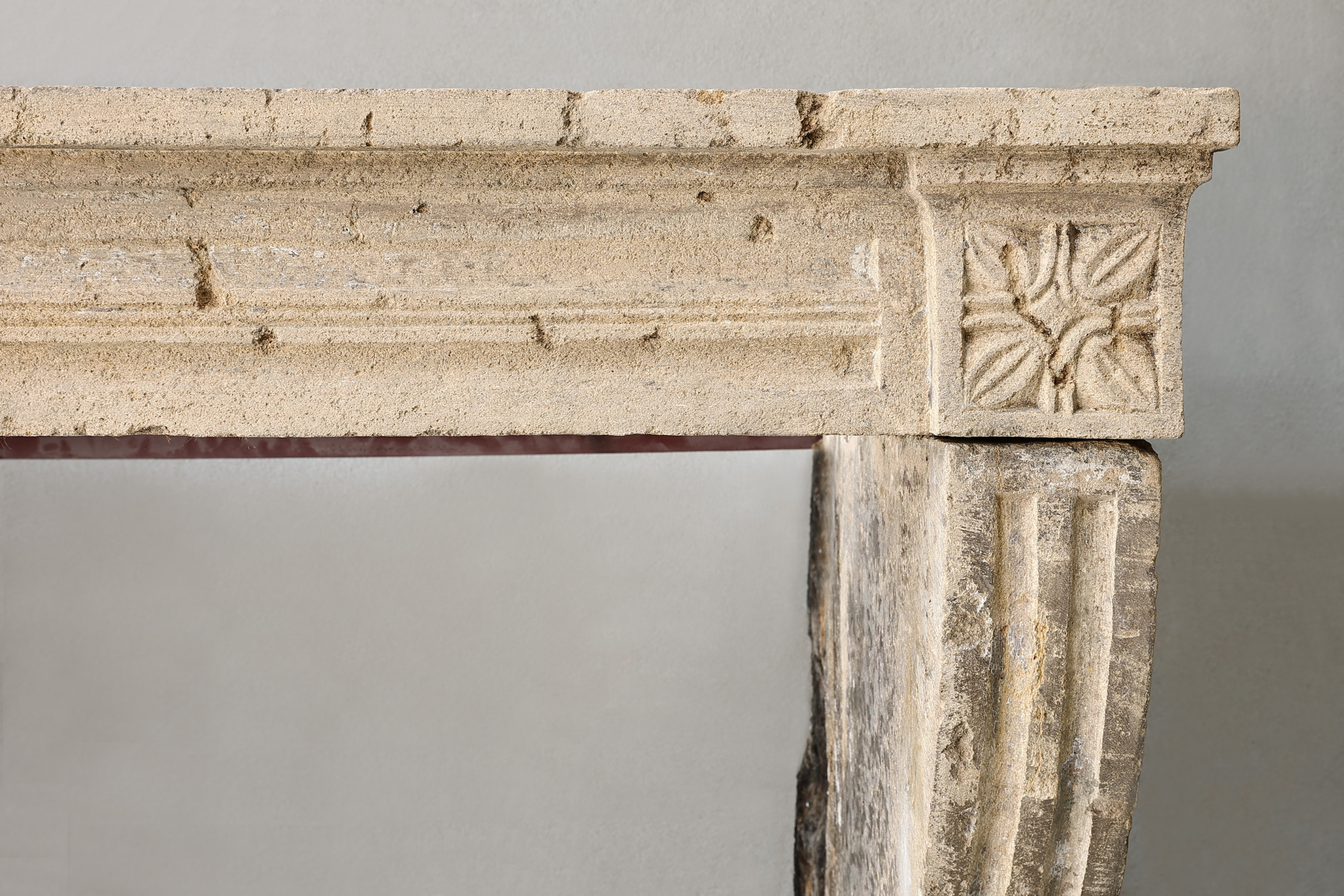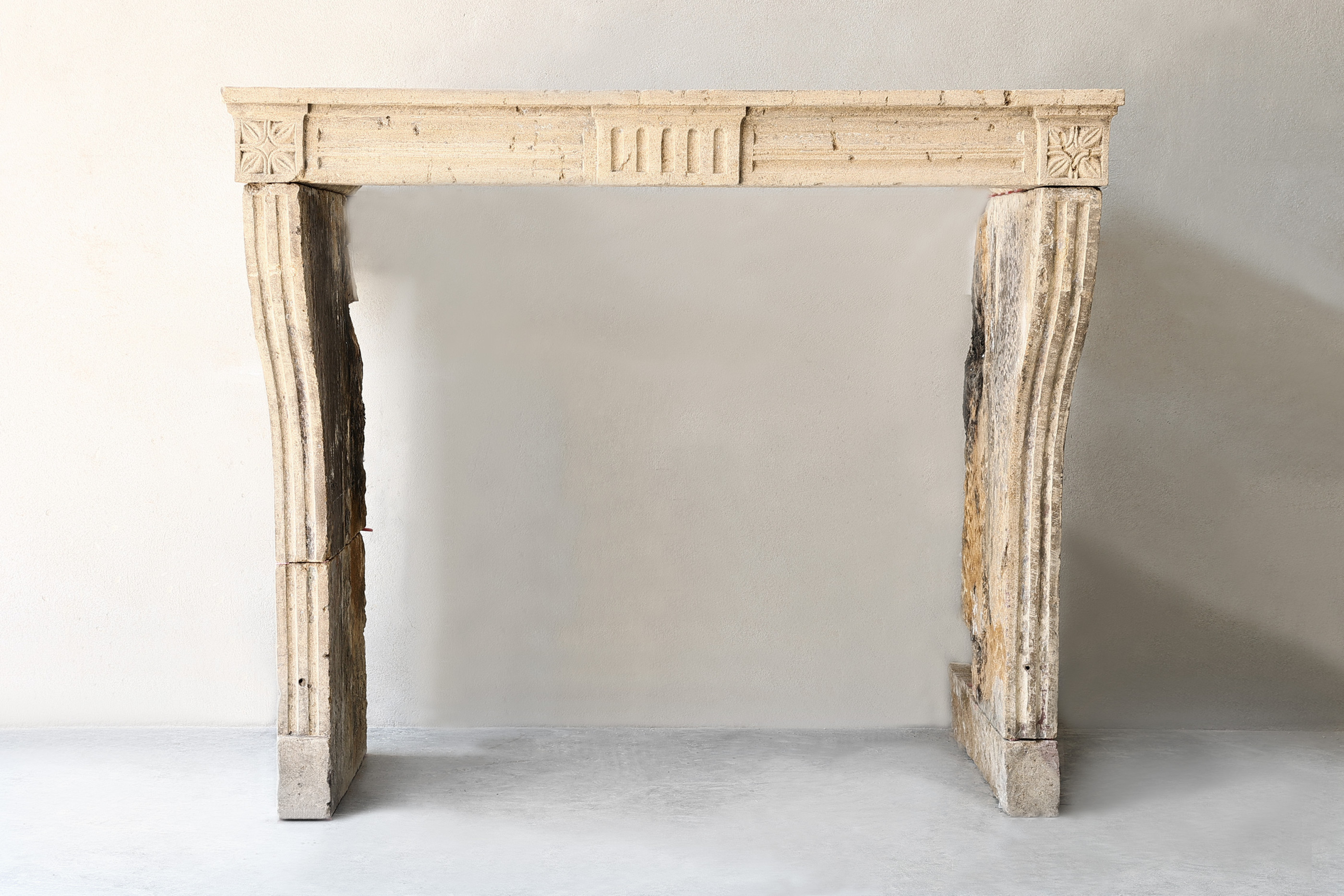 Antique French limestone fireplace from the 19th century! A rustic, slender fireplace with few ornaments, but with beautiful lines. The front part is provided with flutes that also continue on the legs. The legs are slightly curved and the warm colors make this fireplace a unique fireplace.