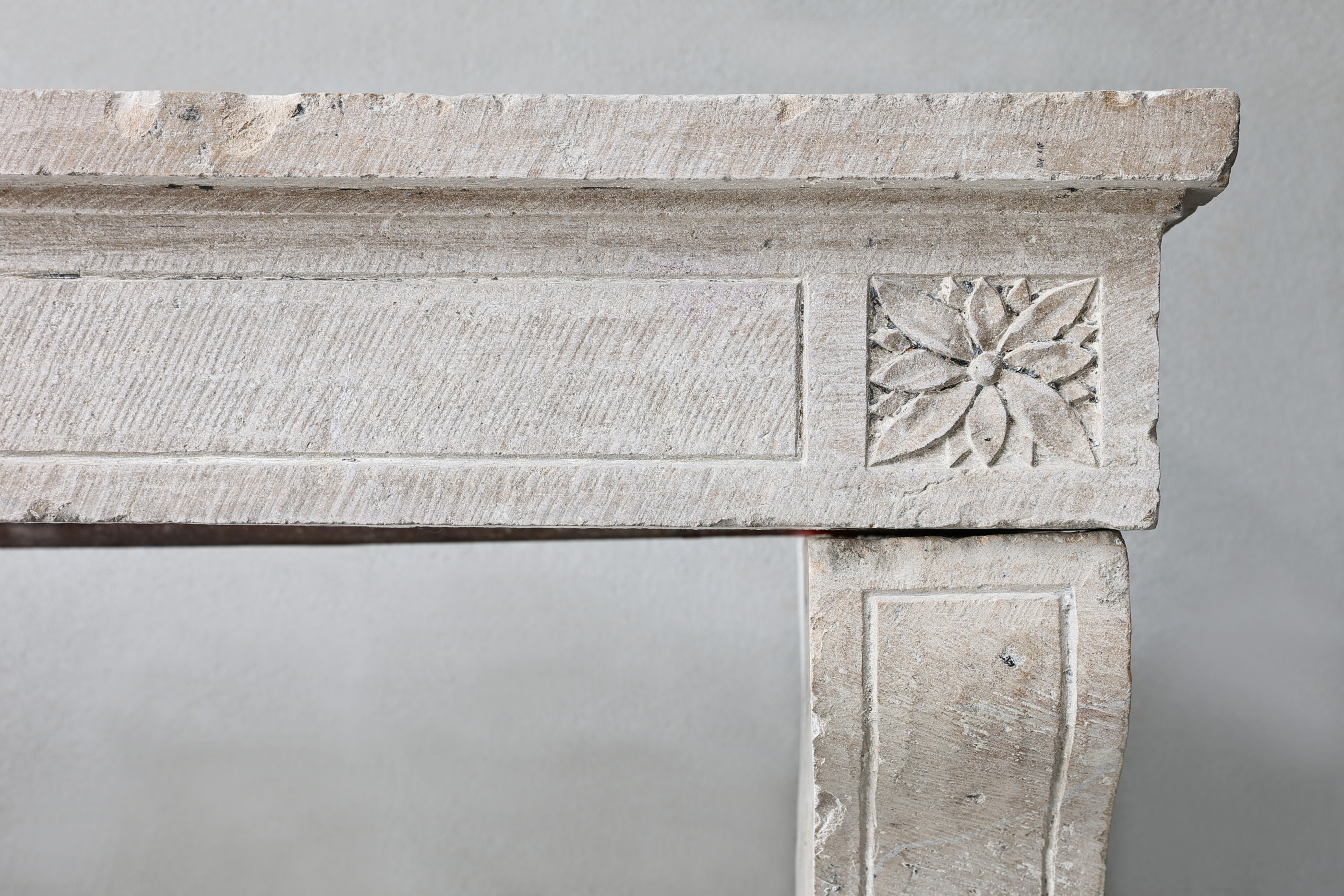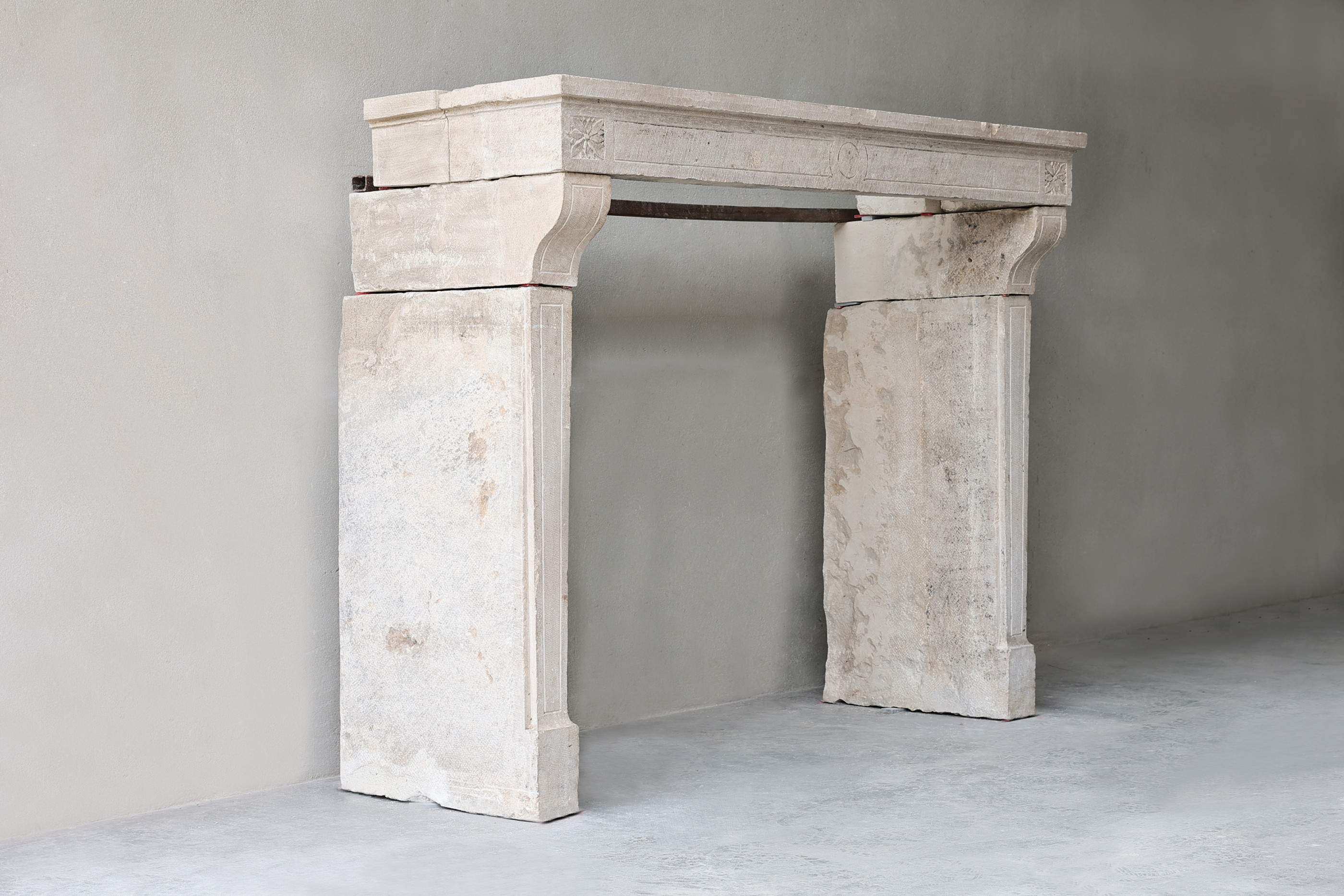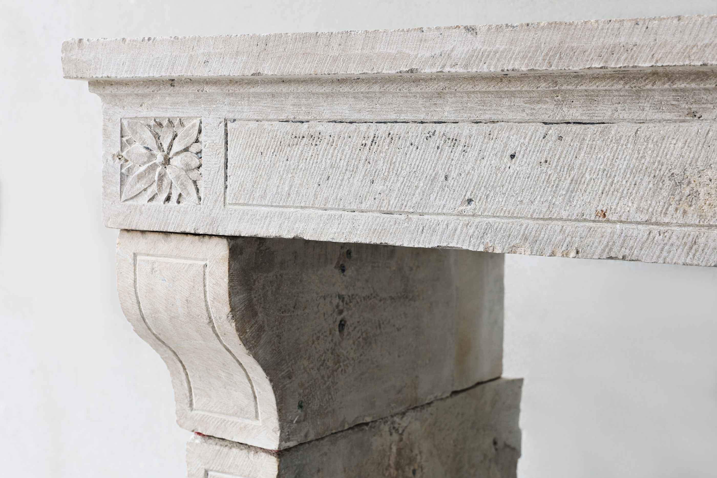 Beautiful antique fireplace from the 19th century in Campagnarde style. This old fireplace of French limestone has a warm color scheme and some beautiful ornaments. A charming rustic mantle with character.