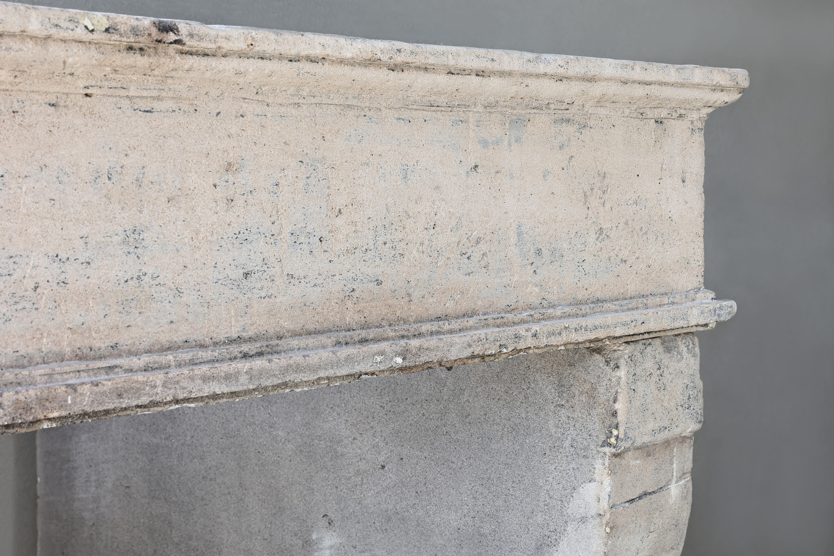 Beautiful rustic mantelpiece of French limestone from the 19th century. This antique mantelpiece has a wide front section and beautiful lines. The legs of this fireplace are slightly curved. A robust mantelpiece with authenticity.