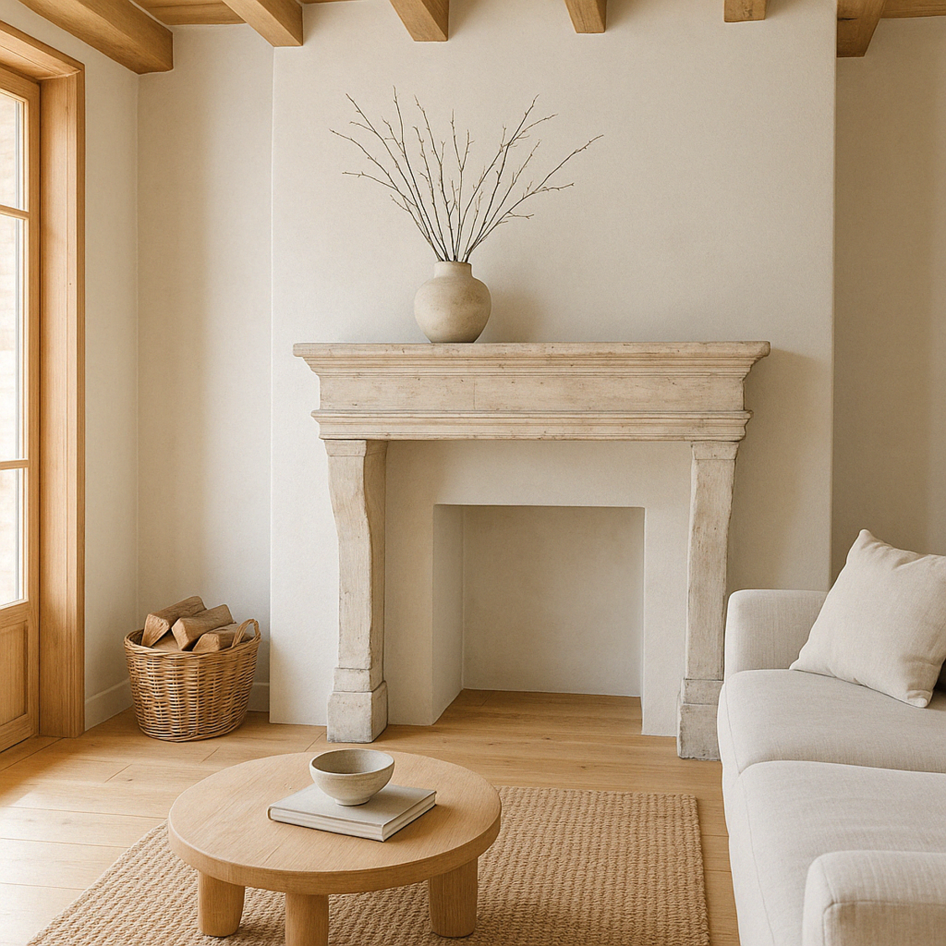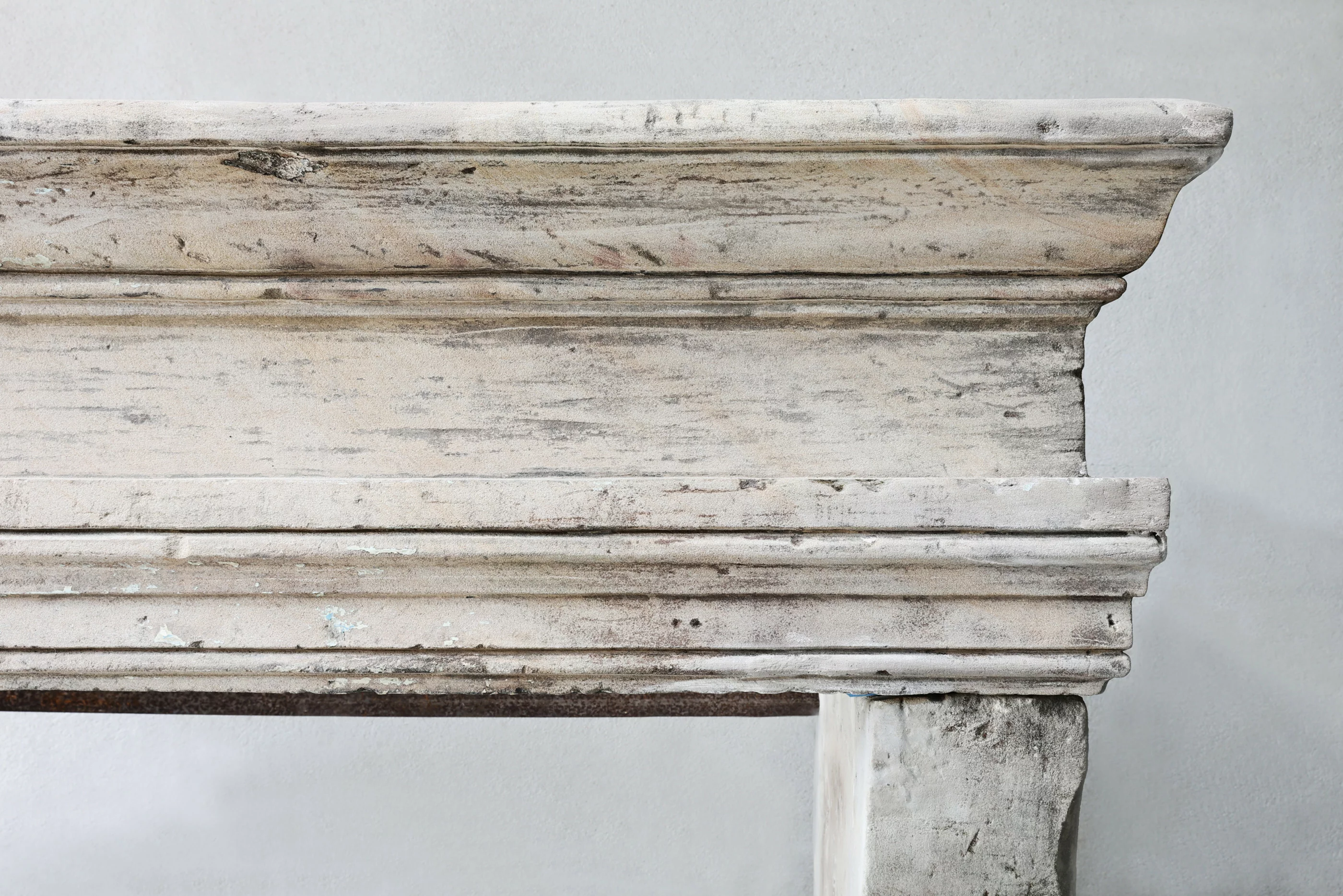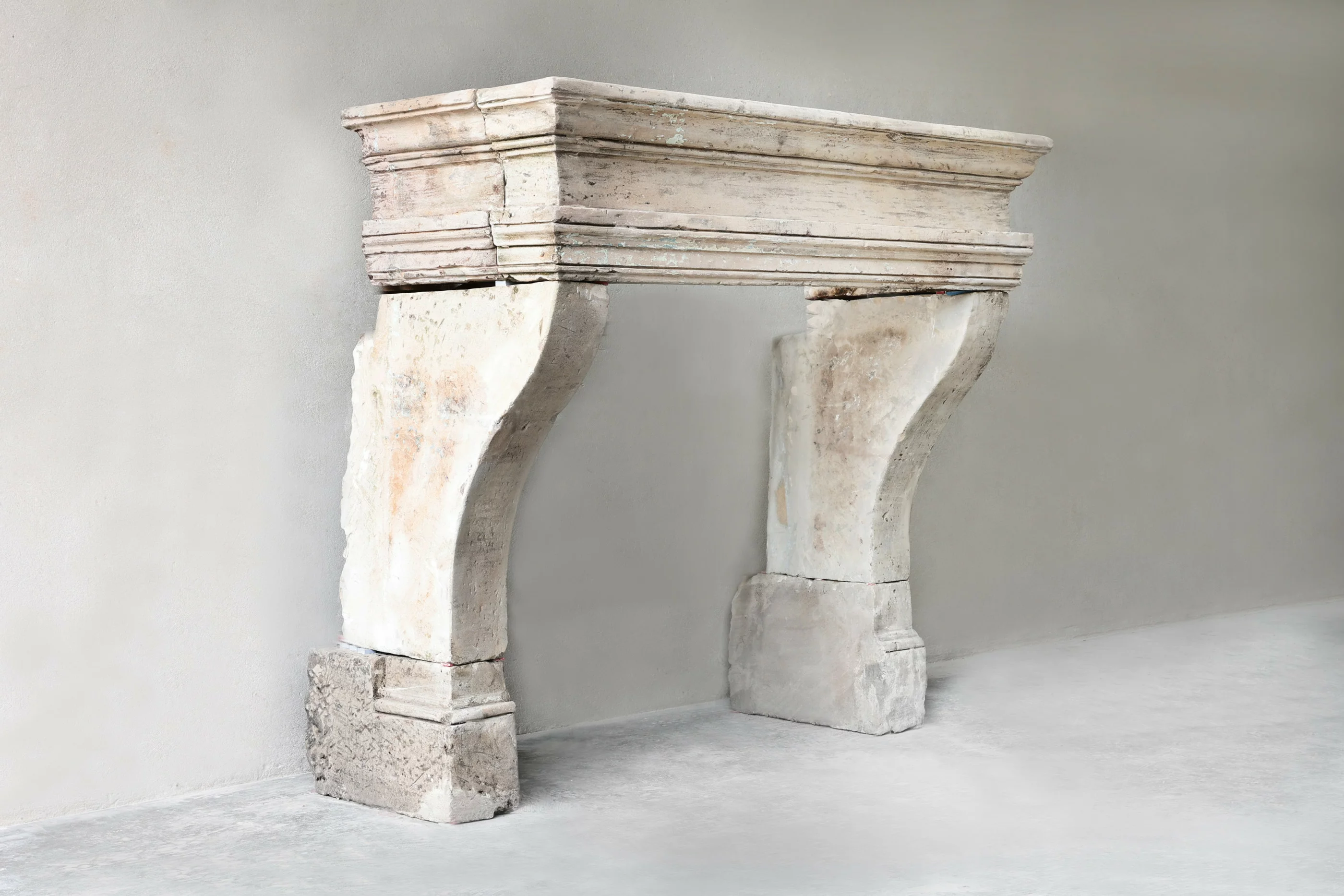 Beautiful antique fireplace of French limestone from the 19th century in Campagnarde style. This mantel has a rustic and warm appearance due to the color scheme and beautiful lines. A fireplace with a compact size, applicable for many interiors. The legs are slightly curved and the top is robust due to the width, which gives this fireplace a really tough appearance.