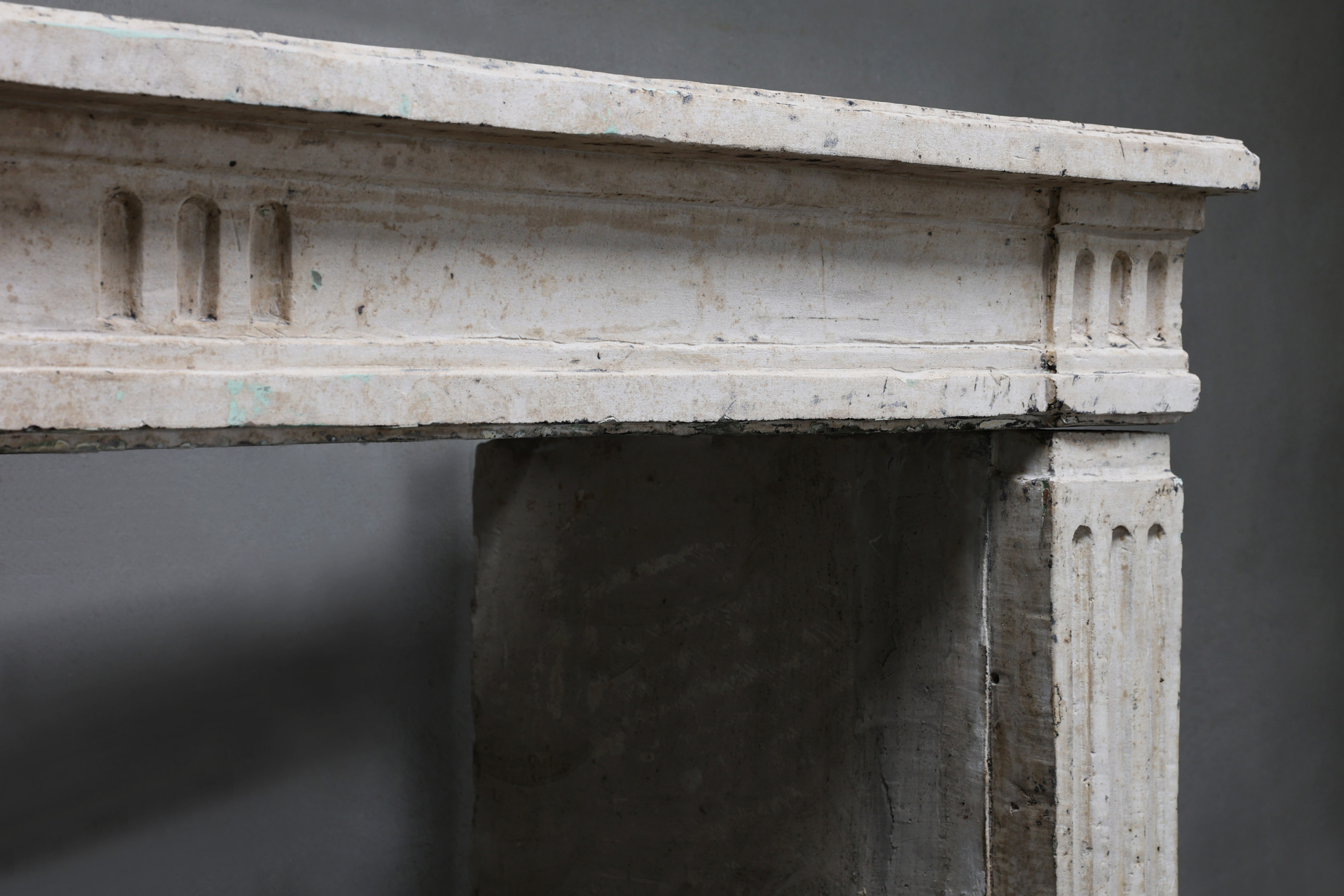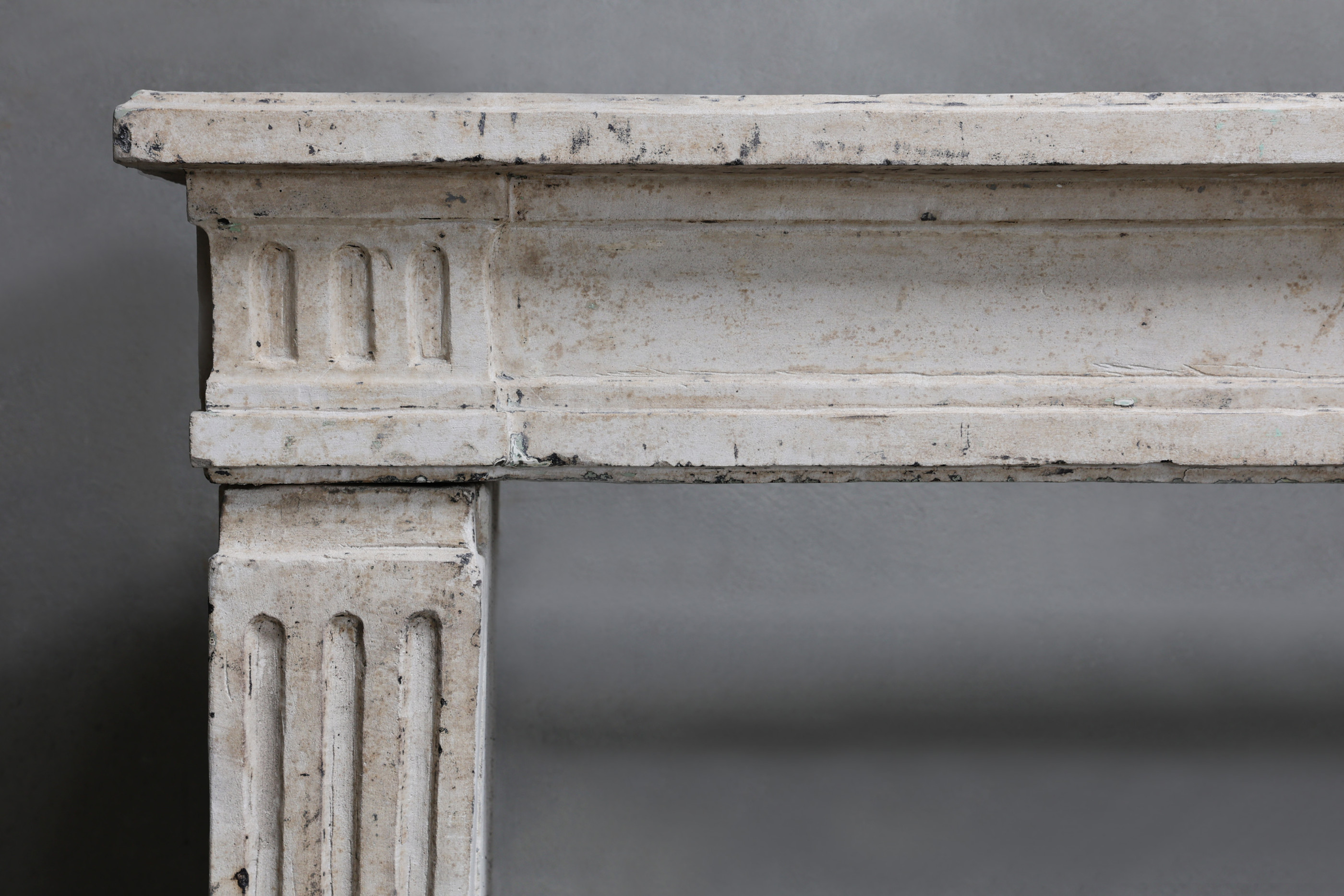 This antique mantelpiece from the 19th century is made of French limestone and executed in Louis XVI style. The sleek, straight design with fine vertical lines gives a calm, classic look. The mantelpiece combines simplicity with elegance and fits well in both historical and modern interiors. A stylish and timeless piece that immediately adds character to a room.
