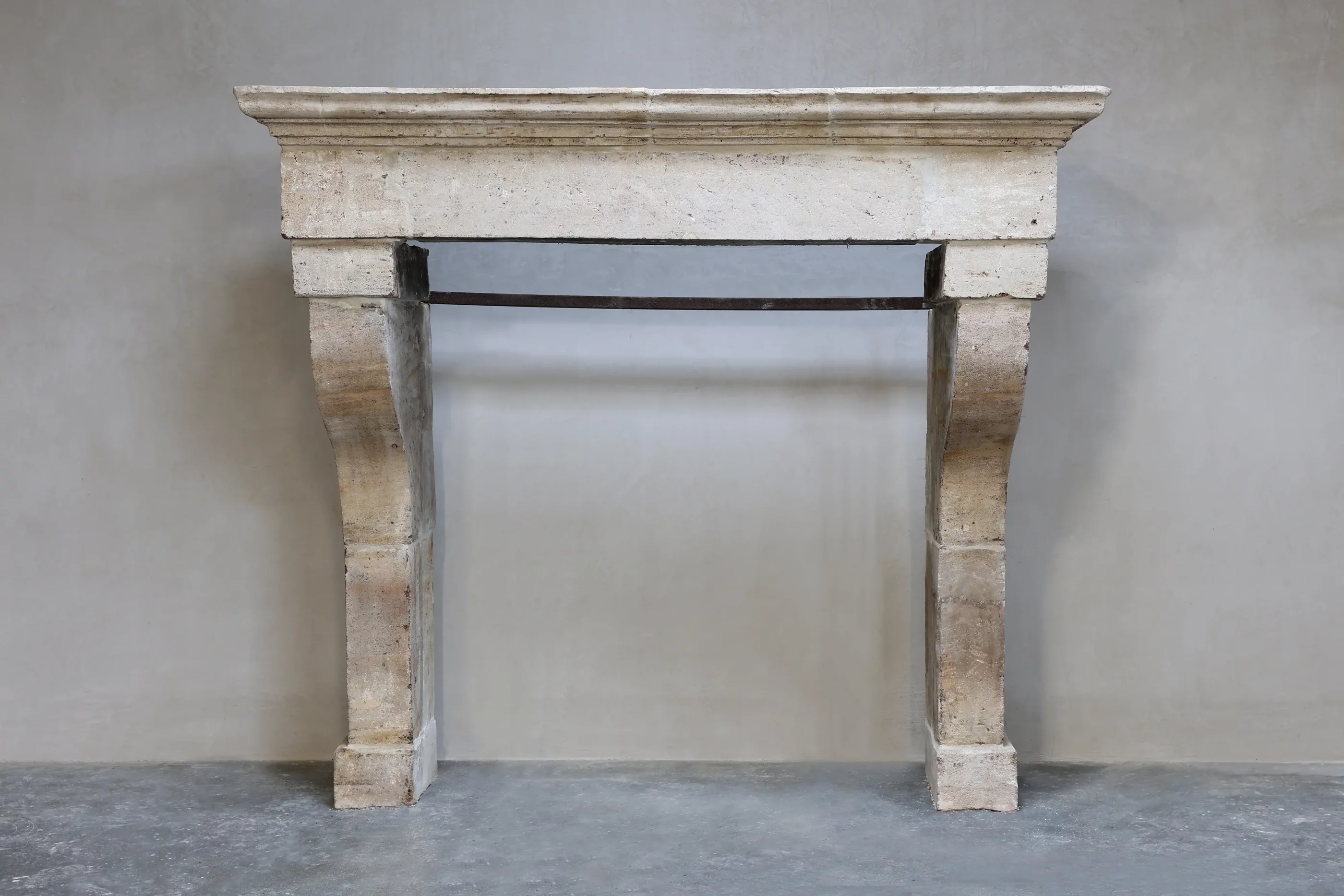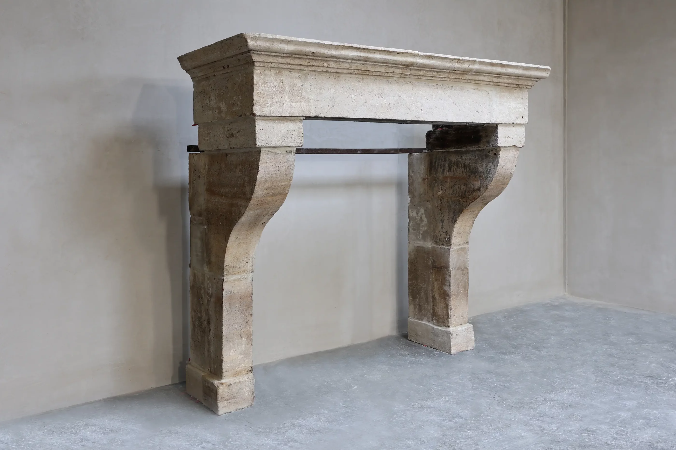 The fireplace is handmade and shows signs of use that enhance its original, historical character. The solid jambs and generously proportioned top ensure a stable and well-balanced construction. Thanks to the neutral tones of the limestone, this fireplace can easily be combined with a wide range of materials and interior styles.