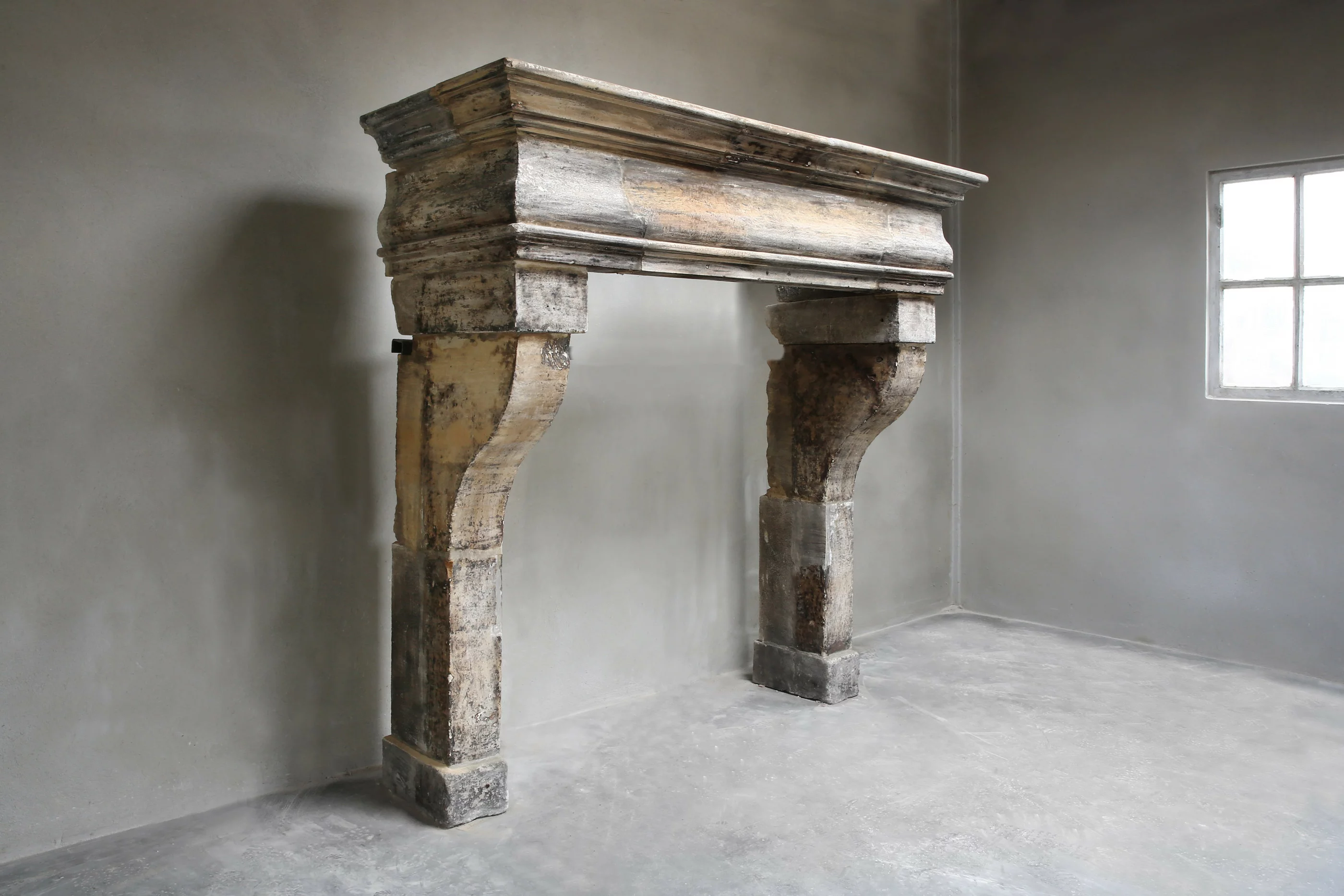 A very rare and beautiful antique chimney made of french limestone. This antique mantelpiece dates from the 18th century, in the style of Louis XIII and is special because of the original patina and the 'galbé' in the front part of the chimney. A robust and stately fireplace that fits into various interiors!