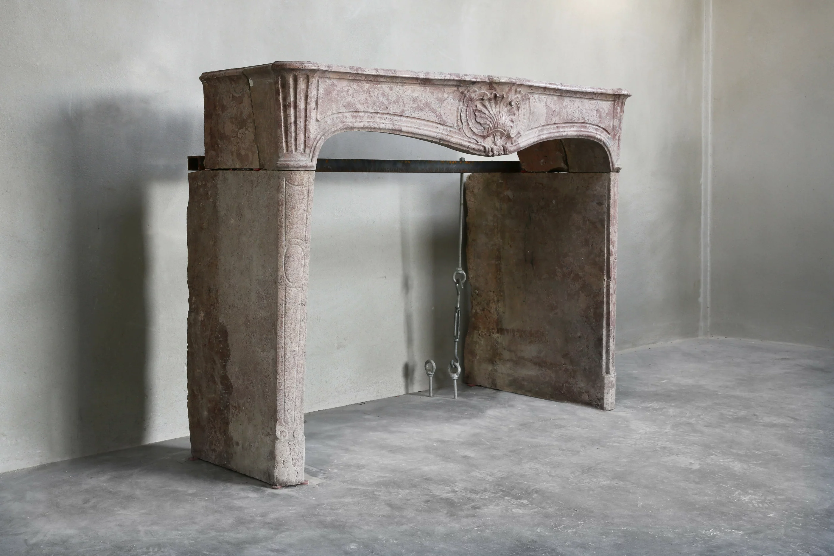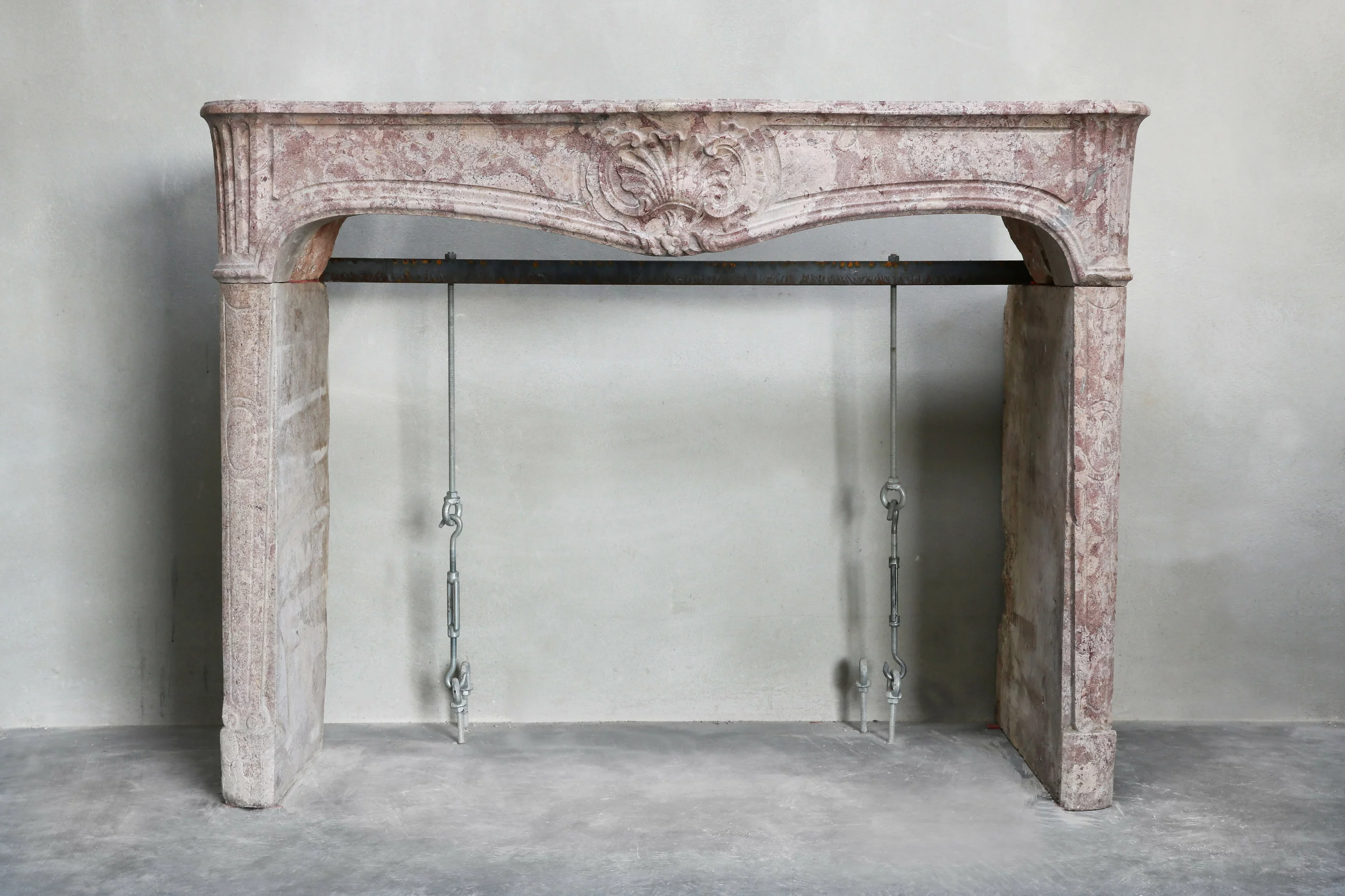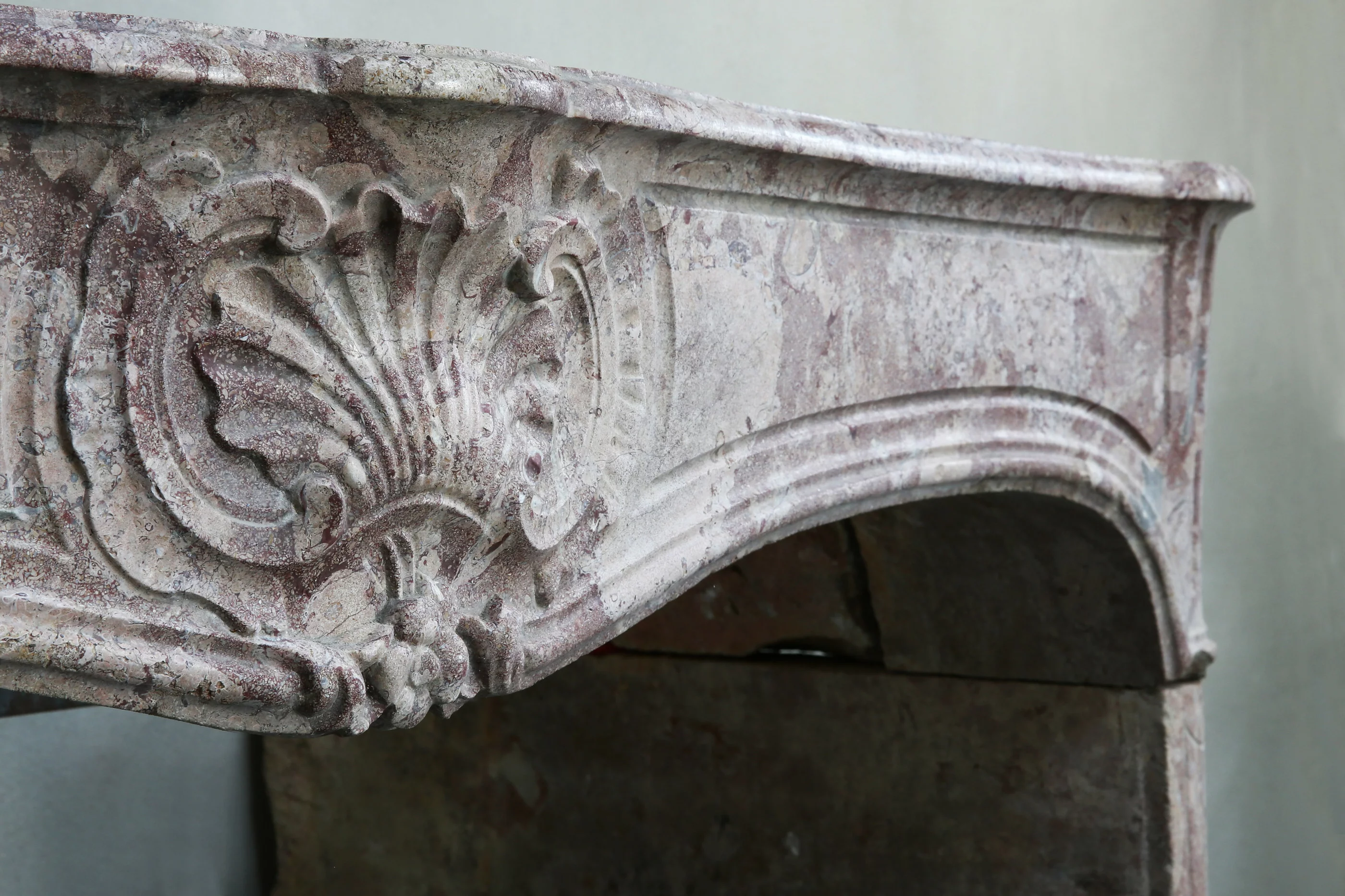 Beautiful antique marble stone fireplace! A very special item because of the color. This is a color that we don't see often and that makes this antique fireplace unique. This fireplace dates from the 19th century and is in the style of Louis XV. These chimneys are often characterized by the scallop in the middle.
