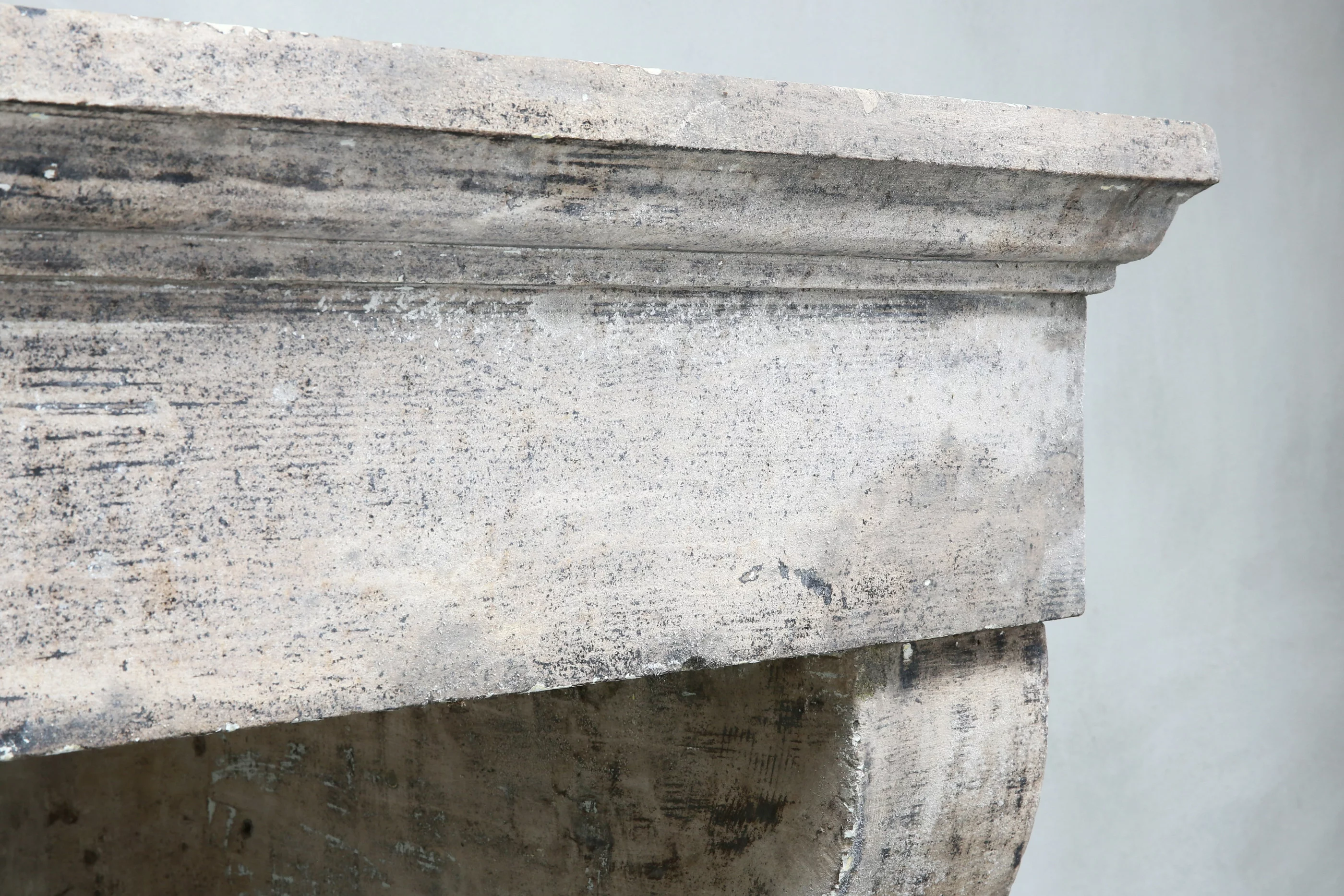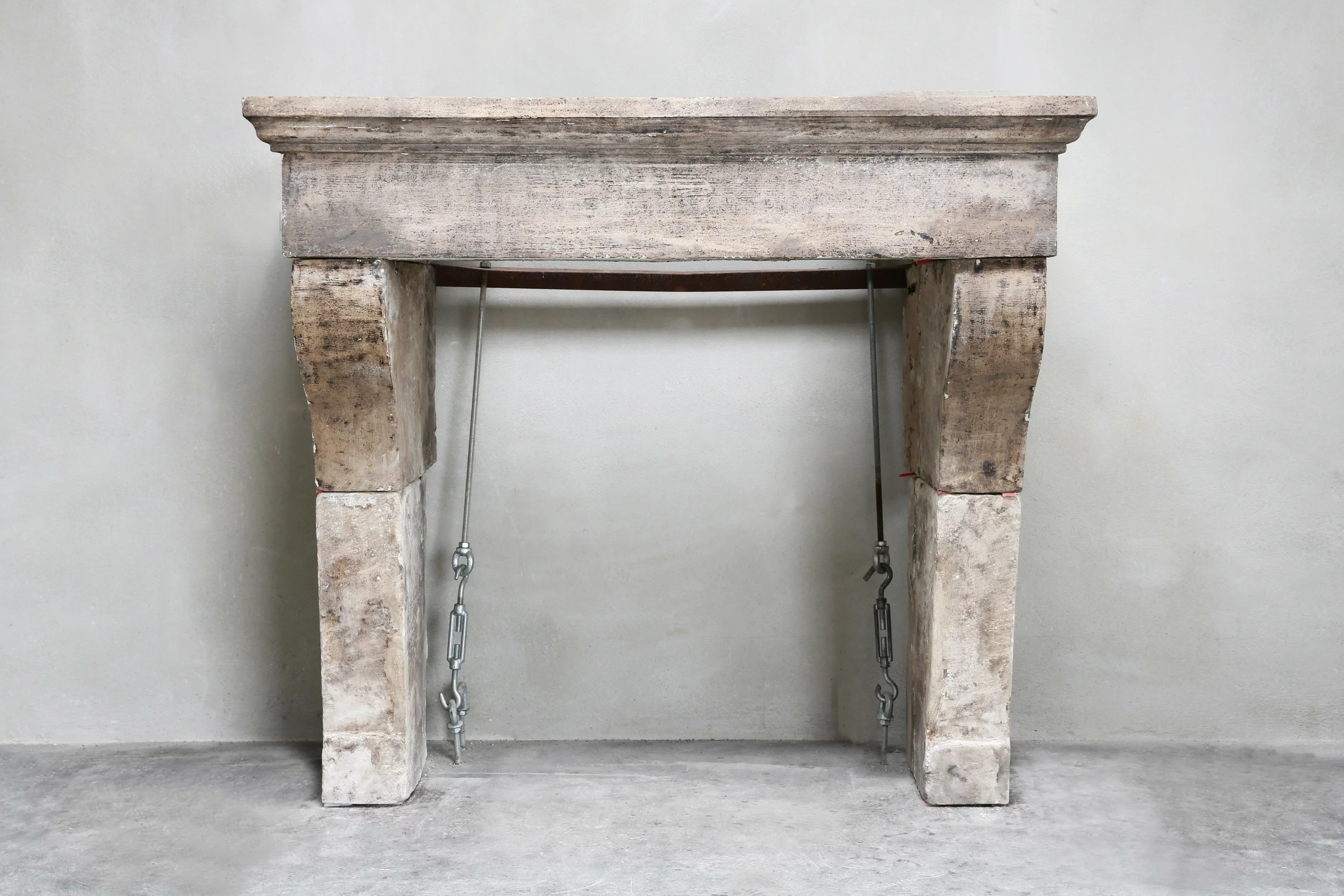 Very nice compact antique fireplace made of French limestone with appearance. The fireplace dates from the 19th century and is in Campagnarde style. The top is nice and robust and has beautiful lines. The legs are slightly bent and give charm to the fireplace.