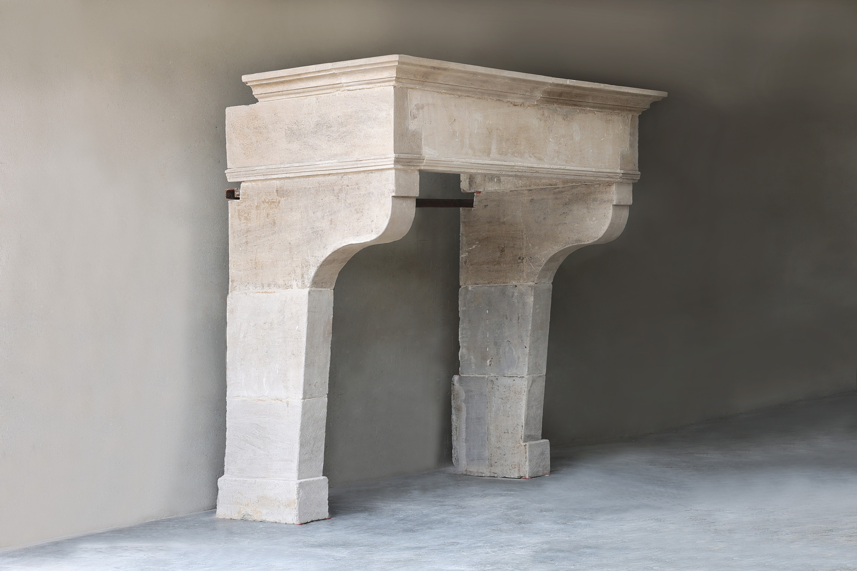Beautiful antique castle mantelpiece made of French limestone from the 19th century! This beautiful fireplace has a wide top with slightly curved legs. A rustic mantle with a historic look.