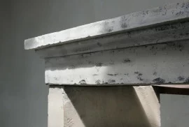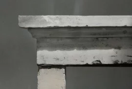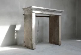 Beautiful patinated antique chimney of French limestone. The chimney is simple and quiet. The top has beautiful lines and a beautiful patina. The legs are straight and fit nicely with the top. This farmer's review is also known as 'Campagnarde'. A simple and austere appearance ensures that this chimney fits both in rural homes and in modern homes.
