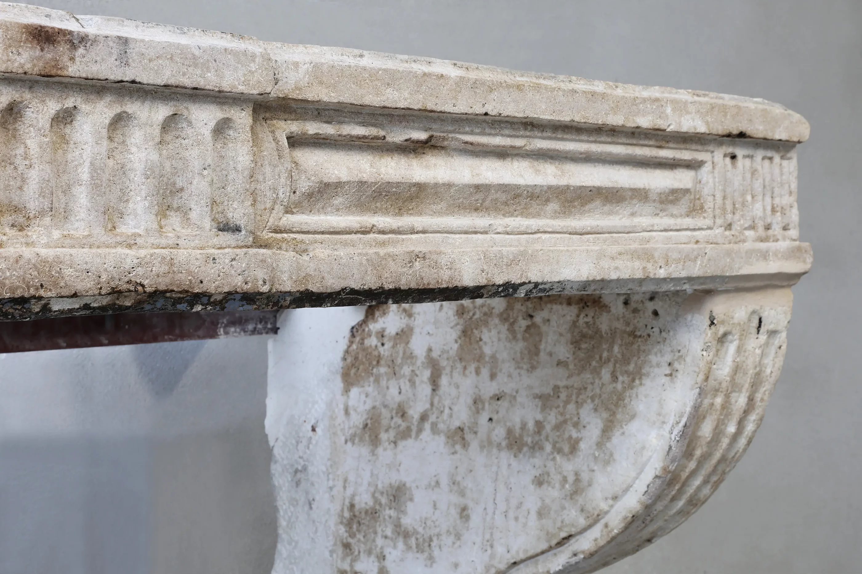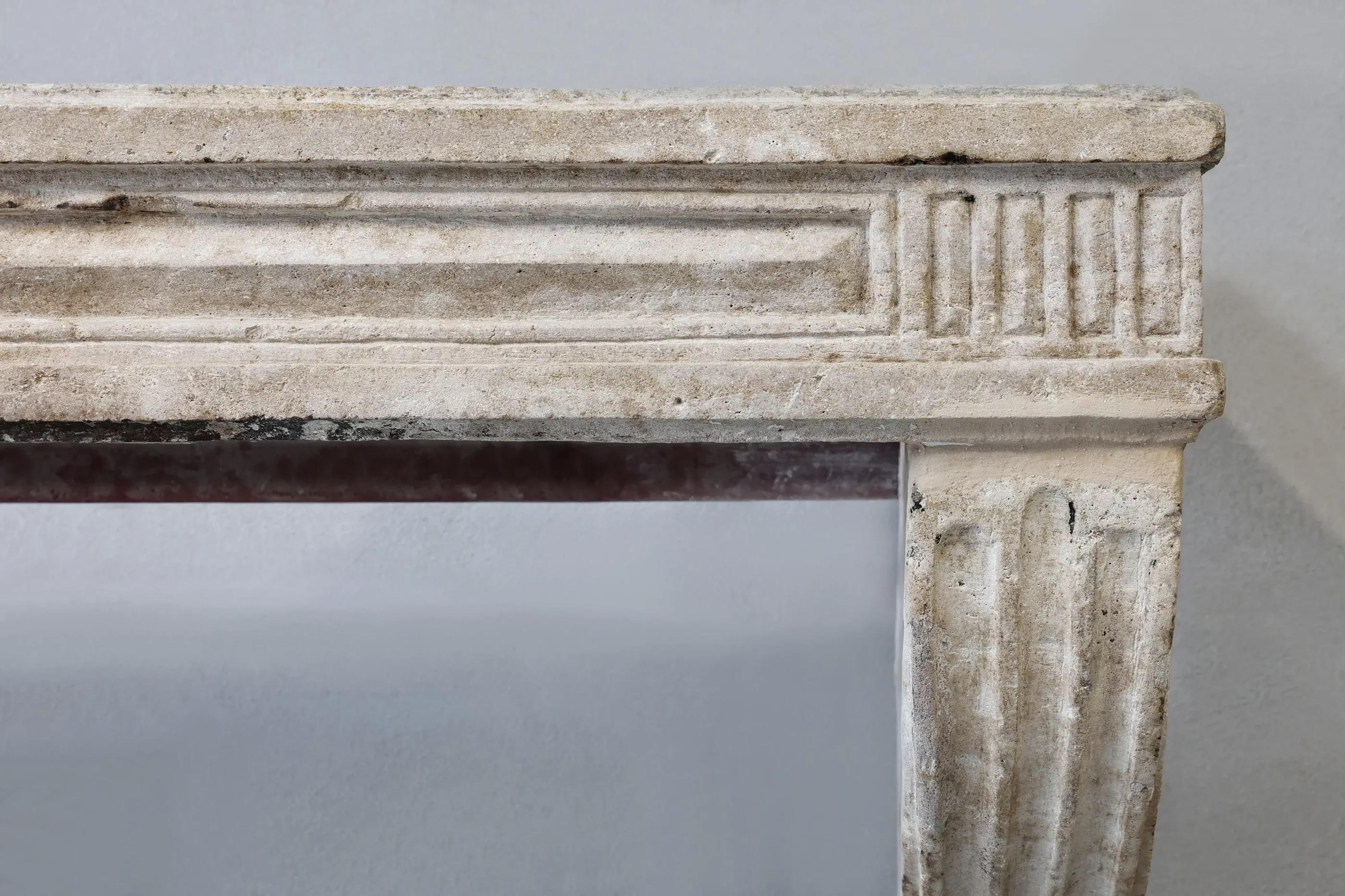 This Antique Fireplace surround is shown in the four photos above as a calm, late-18th-century limestone surround with a structured frieze and fluted legs. The elevation is symmetrical and clearly neoclassical: framed rectangular fields in the frieze, restrained mouldings, and vertical fluting that keeps the profile crisp and architectural. Hand-carved details are visible, and the lintel is a single piece. The surface shows patina and a weathered character, supporting projects where authentic material depth matters more than a newly finished appearance.