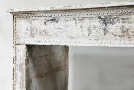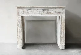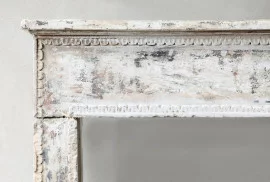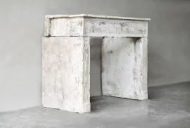 Very unique antique fireplace of French limestone from the 19th century with beautiful lines and decorations and a warm color scheme! This fireplace is in Directoire style and rustic in appearance due to the straight shapes. The beautiful edge in the front part and continuing on the legs make this mantle to a very beautiful one!