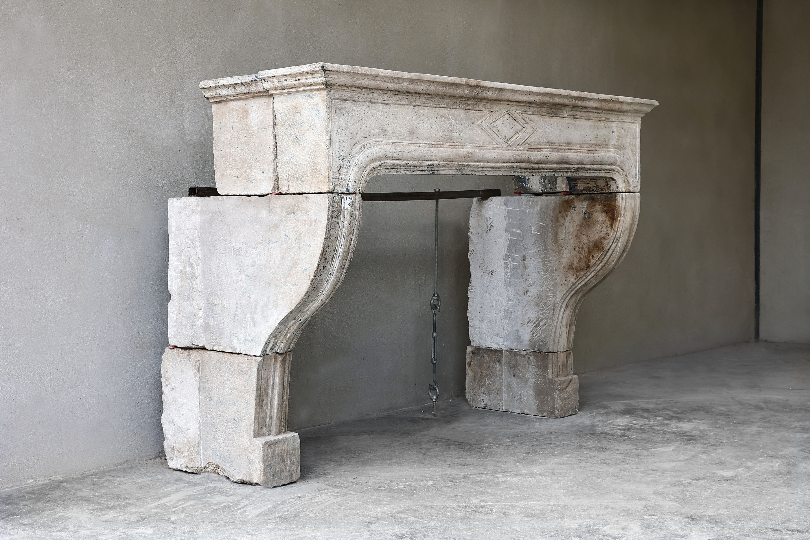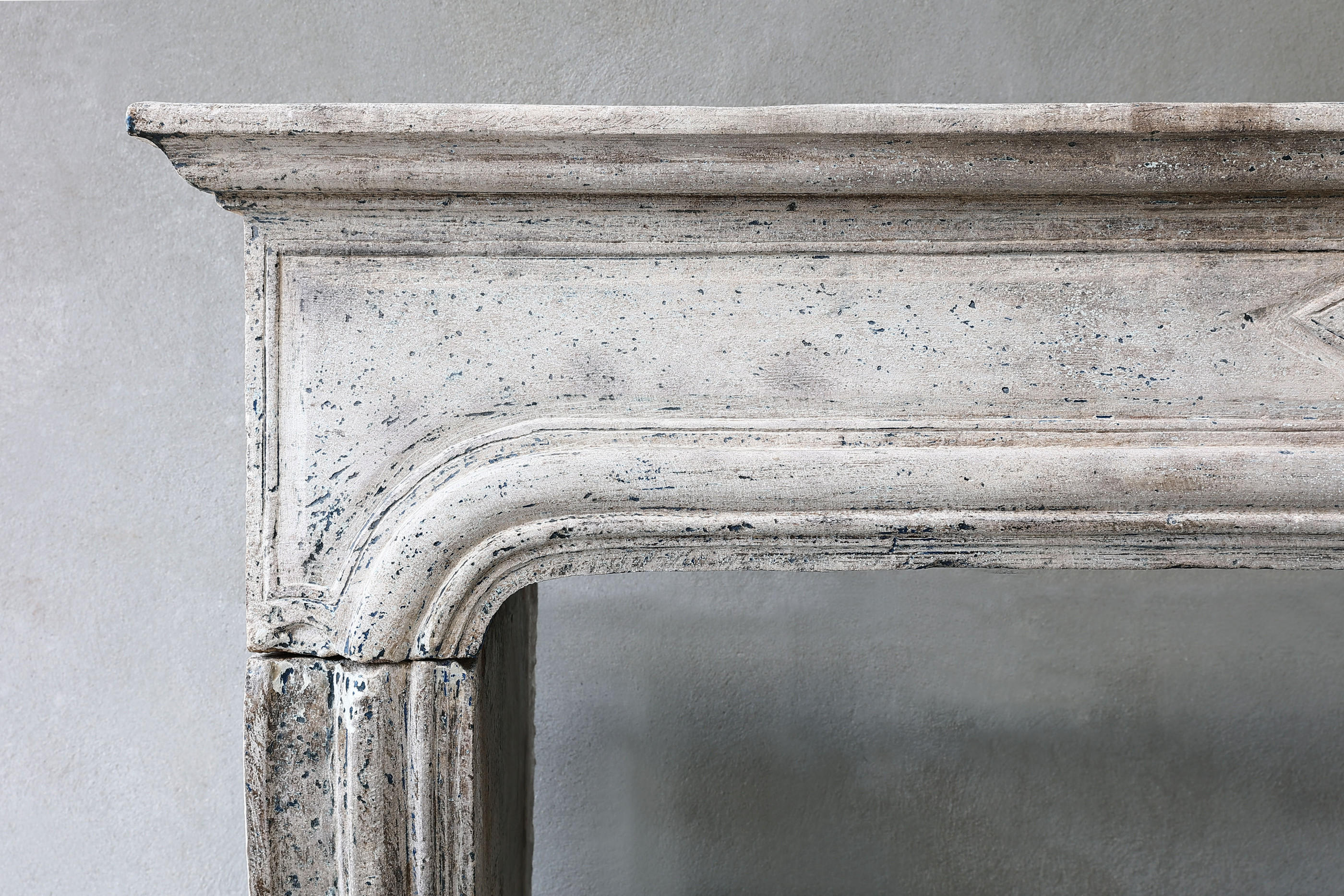 Elegant antique French limestone fireplace in the style of Louis XIV. This old French fireplace has a beautiful ornament in the middle and a beautiful molding (lines). The fireplace dates from the 19th century and has a warm patina.