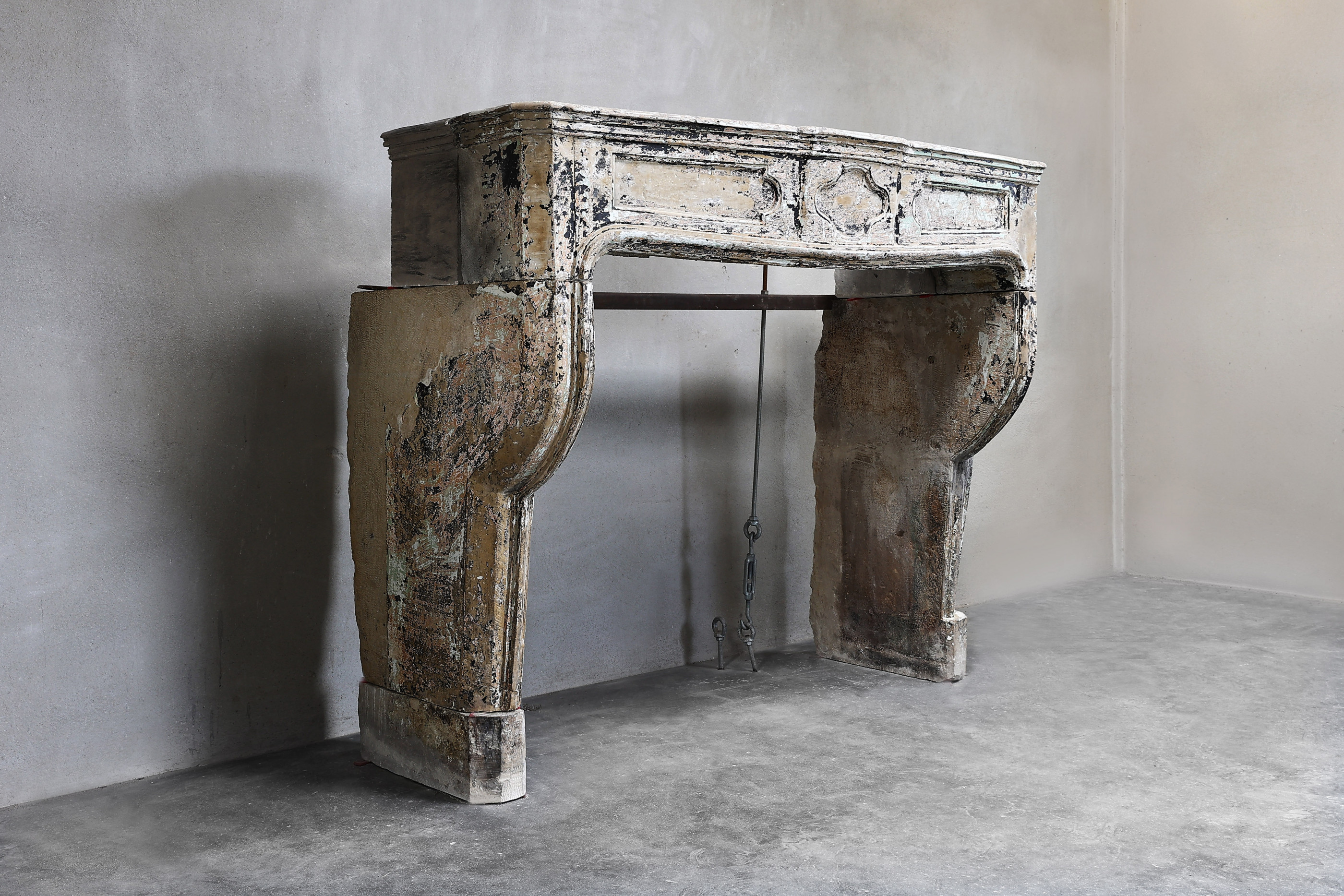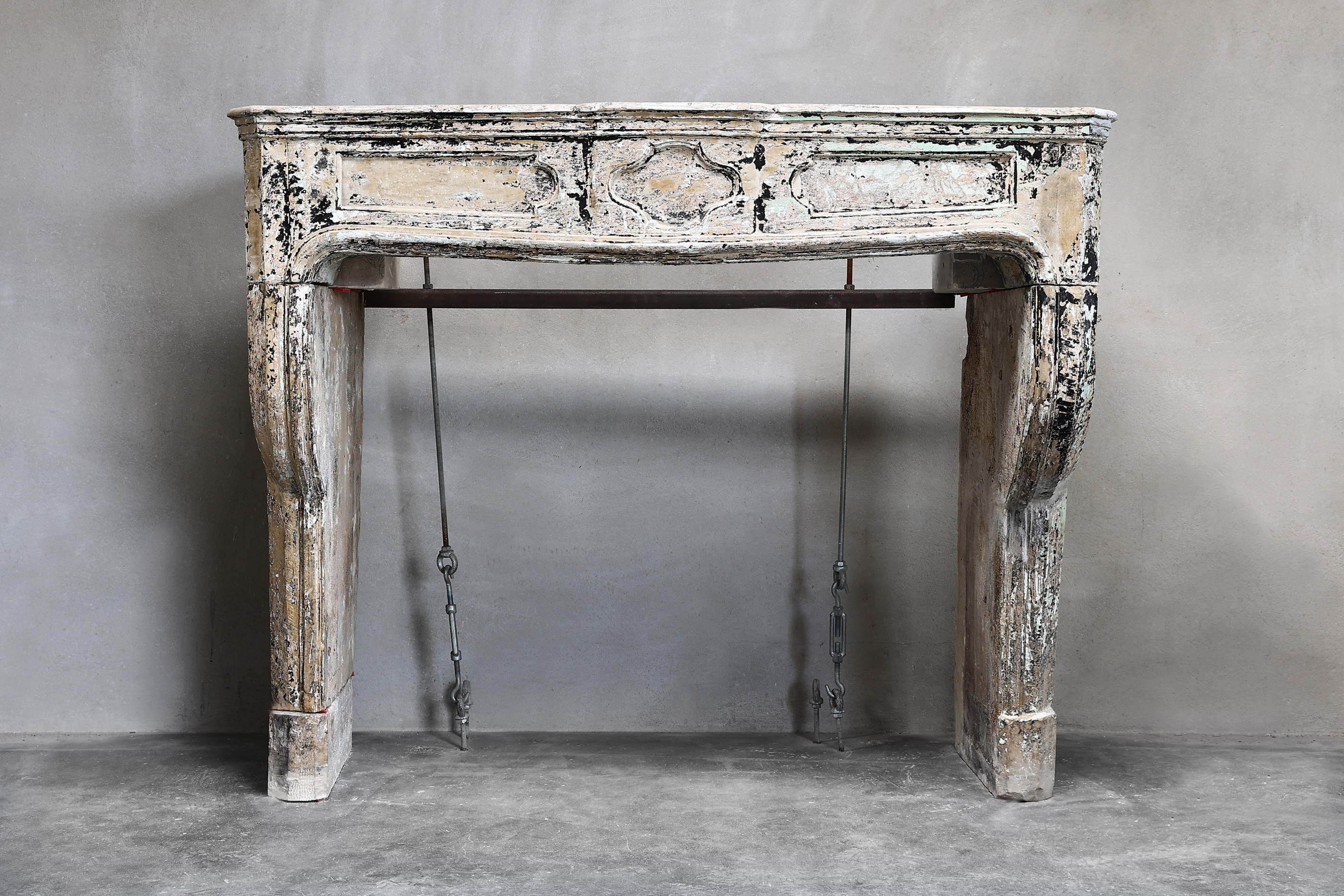 Ornate and patinated fireplace from the 19th century. A fireplace with history and allure! This fireplace dates from the 19th century and is made of French limestone. The fireplace is in the style of Louis XIV and has hand-carved ornaments in the front part.