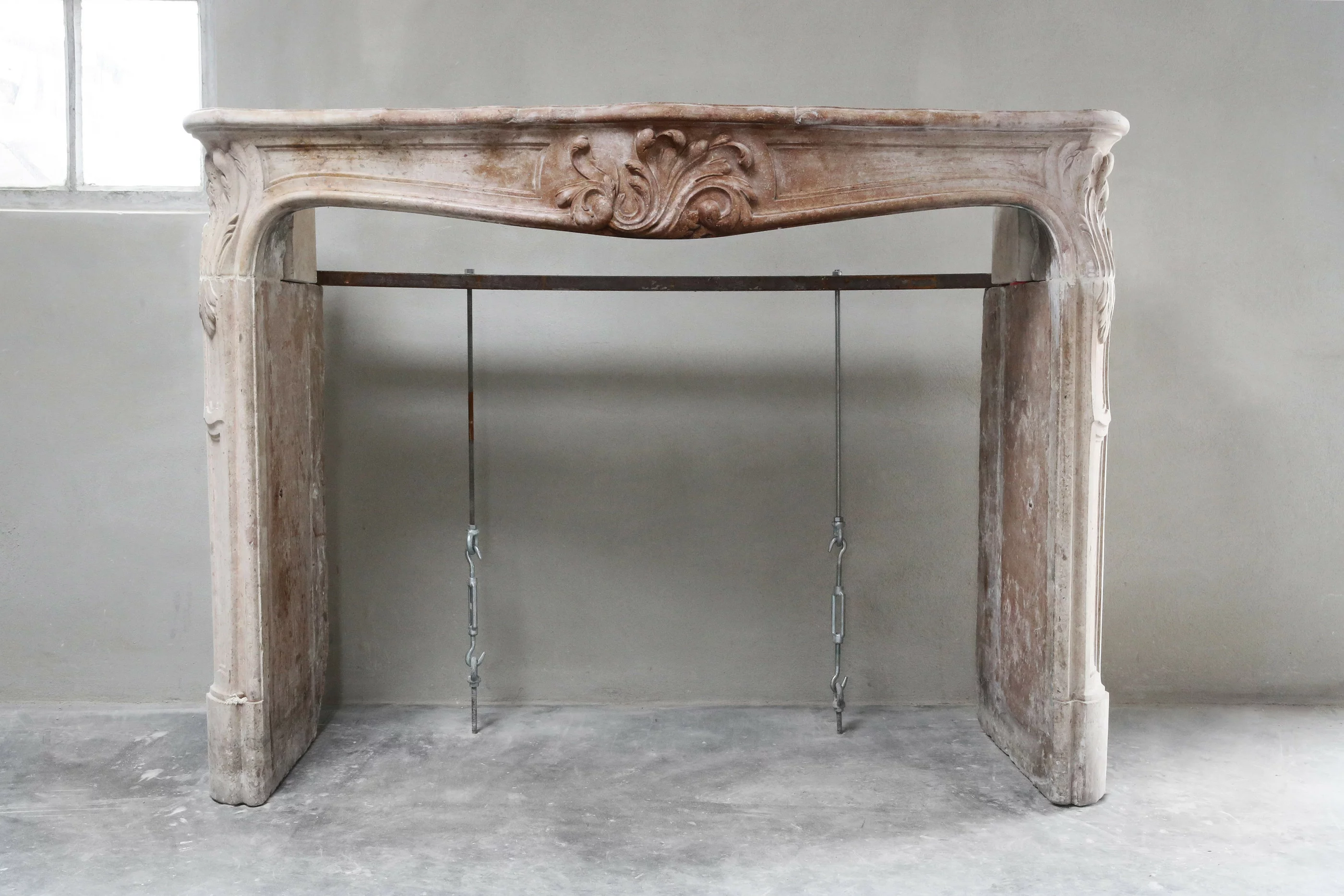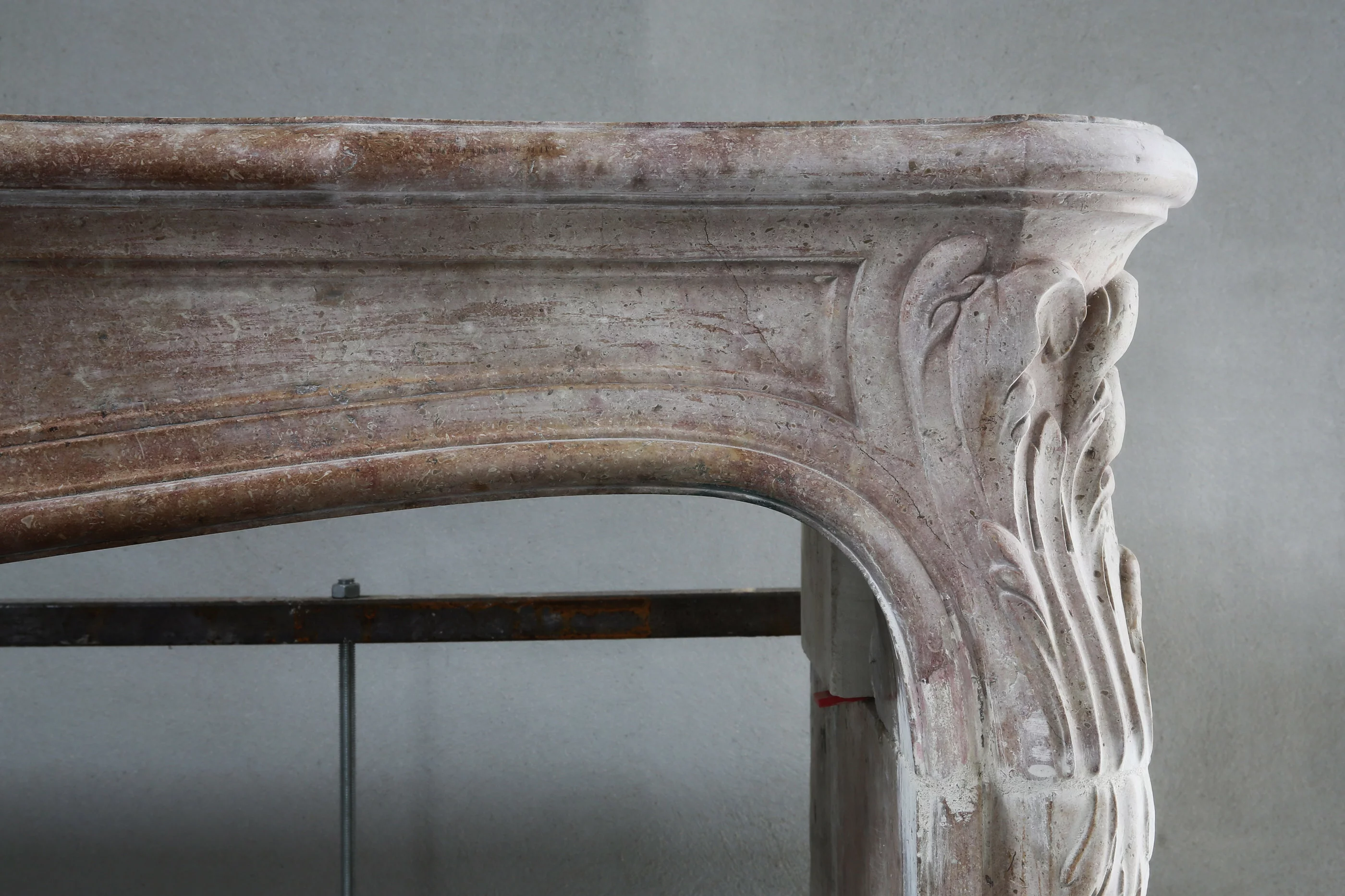A French antique mantelpiece in the style of Louis XV from the 19th century. The marble stone is called Pierre de Bourgogne and is from the Burgundy region in France and has a warm brown/beige color nuance. An ornate mantelpiece with a beautiful ornament in the middle and curved legs.