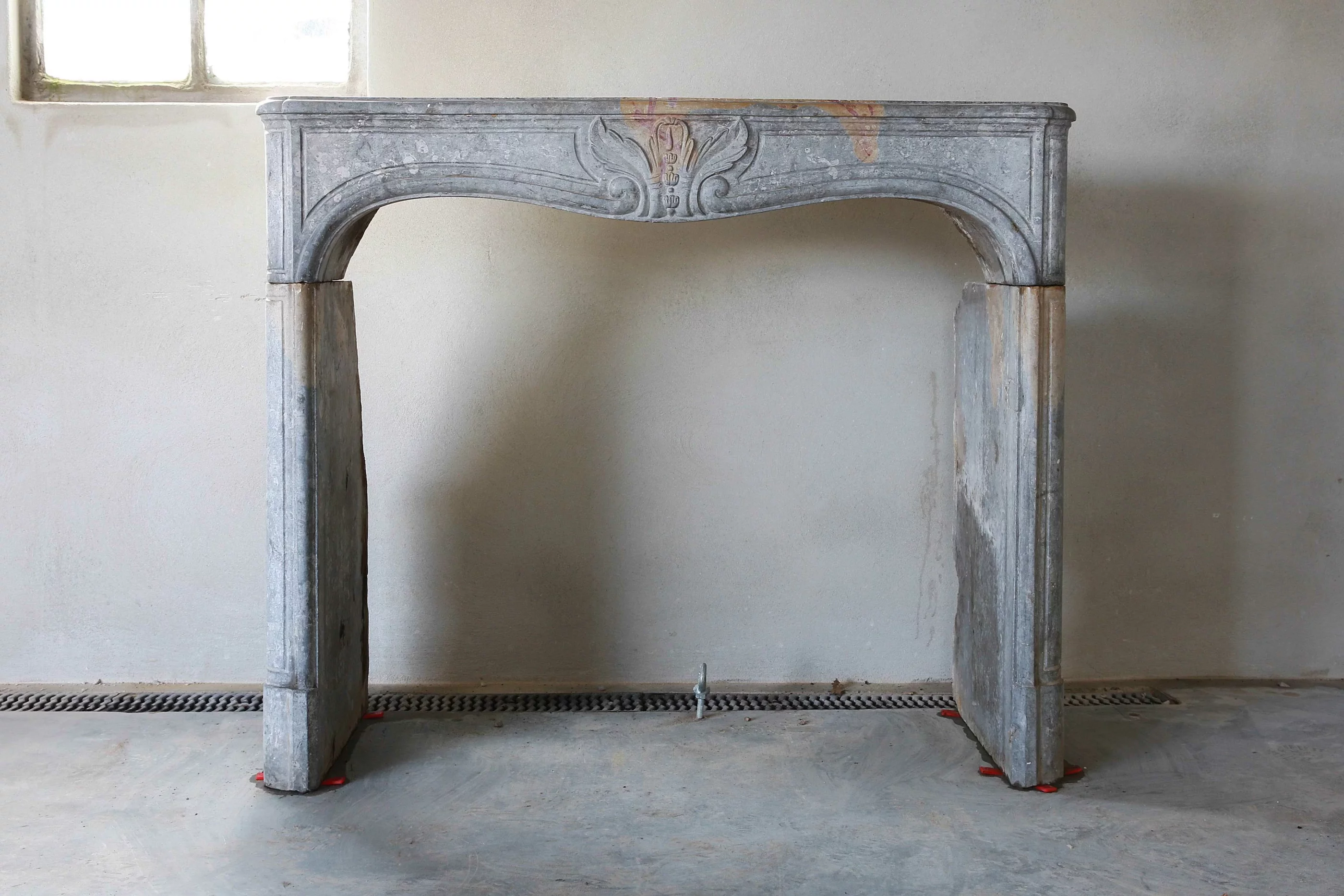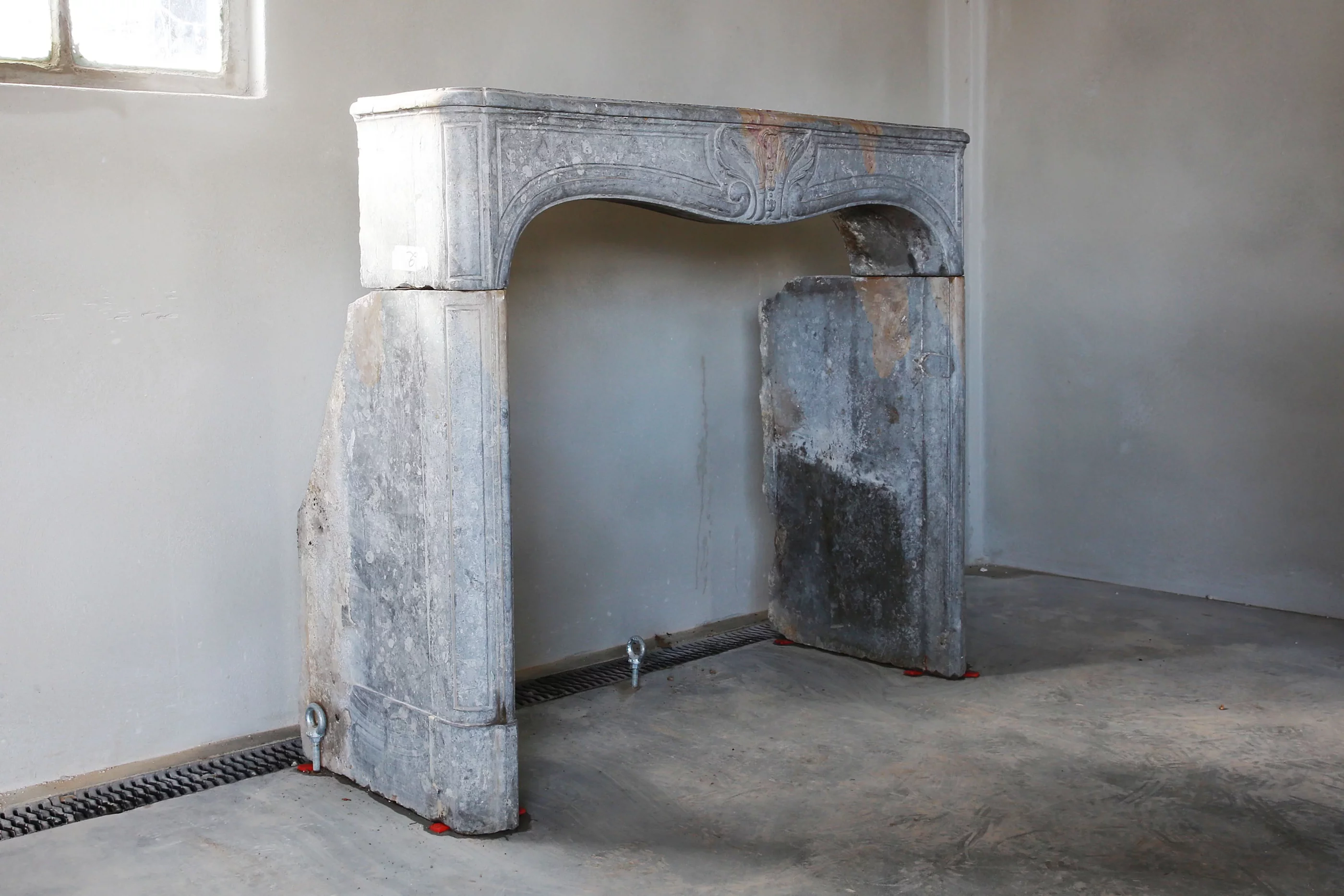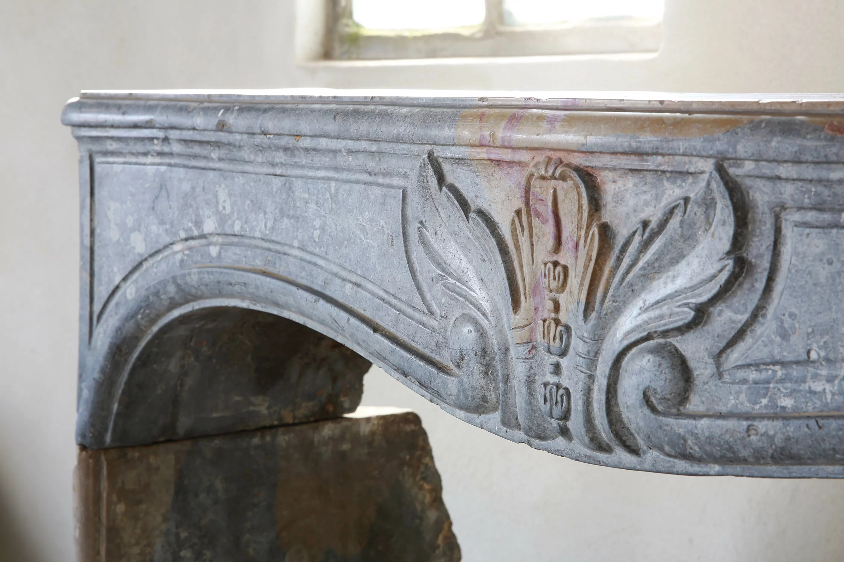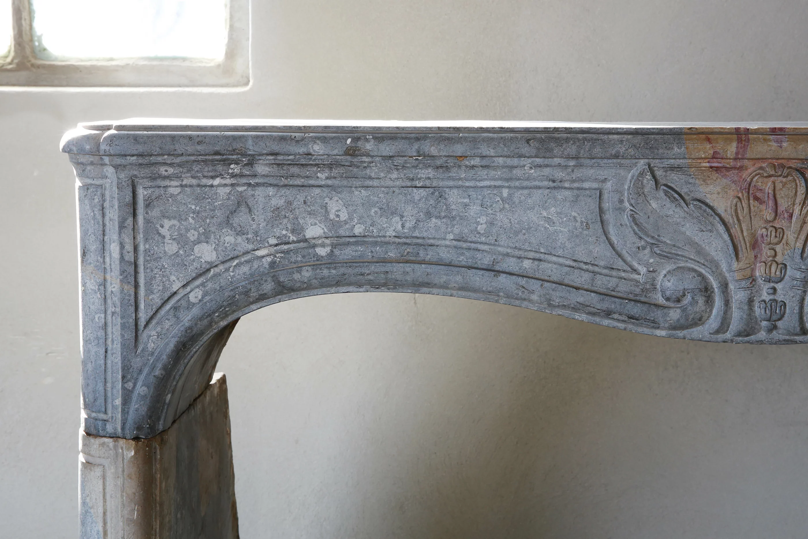 This antique mantelpiece is distinguished on the one hand by fine framework and on the other hand with the characteristic features of incomplete metamorphosis, whereby the blue-gray basic color is mixed with yellow and even red shades. An antique fireplace with this tri-colores color shade is unique and only very rare.