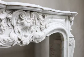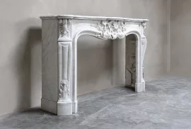 Beautiful exclusive antique fireplace made of Carrara marble from Italy! This 19th century fireplace is in the style of Louis XV and richly decorated with various ornaments in the front part and on the legs. A chic fireplace within our collection.