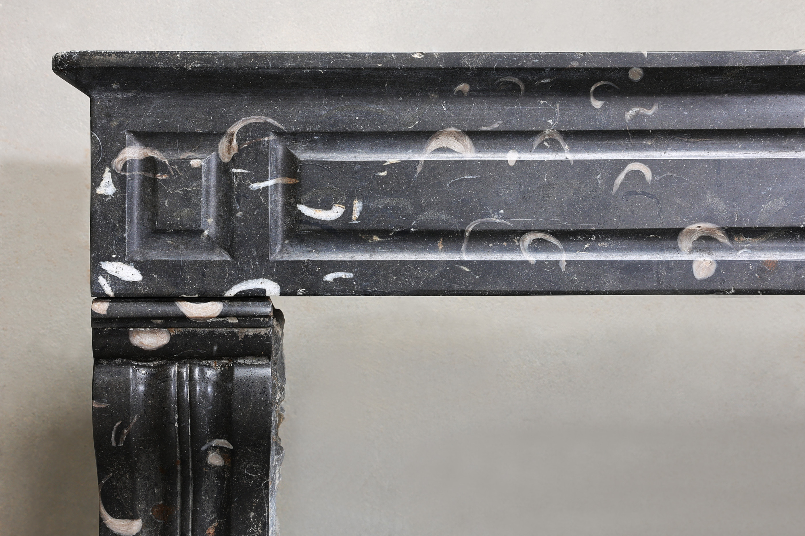 Beautiful antique mantelpiece made of beautiful black marble with light veins from the 19th century in the style of Louis XVI. This mantelpiece has a warm color nuance and beautiful straight shapes! A chic antique mantle that is compact in size and has an elegant appearance!