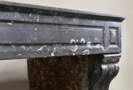 Beautiful antique mantelpiece made of beautiful black marble with light veins from the 19th century in the style of Louis XVI. This mantelpiece has a warm color nuance and beautiful straight shapes! A chic antique mantle that is compact in size and has an elegant appearance!