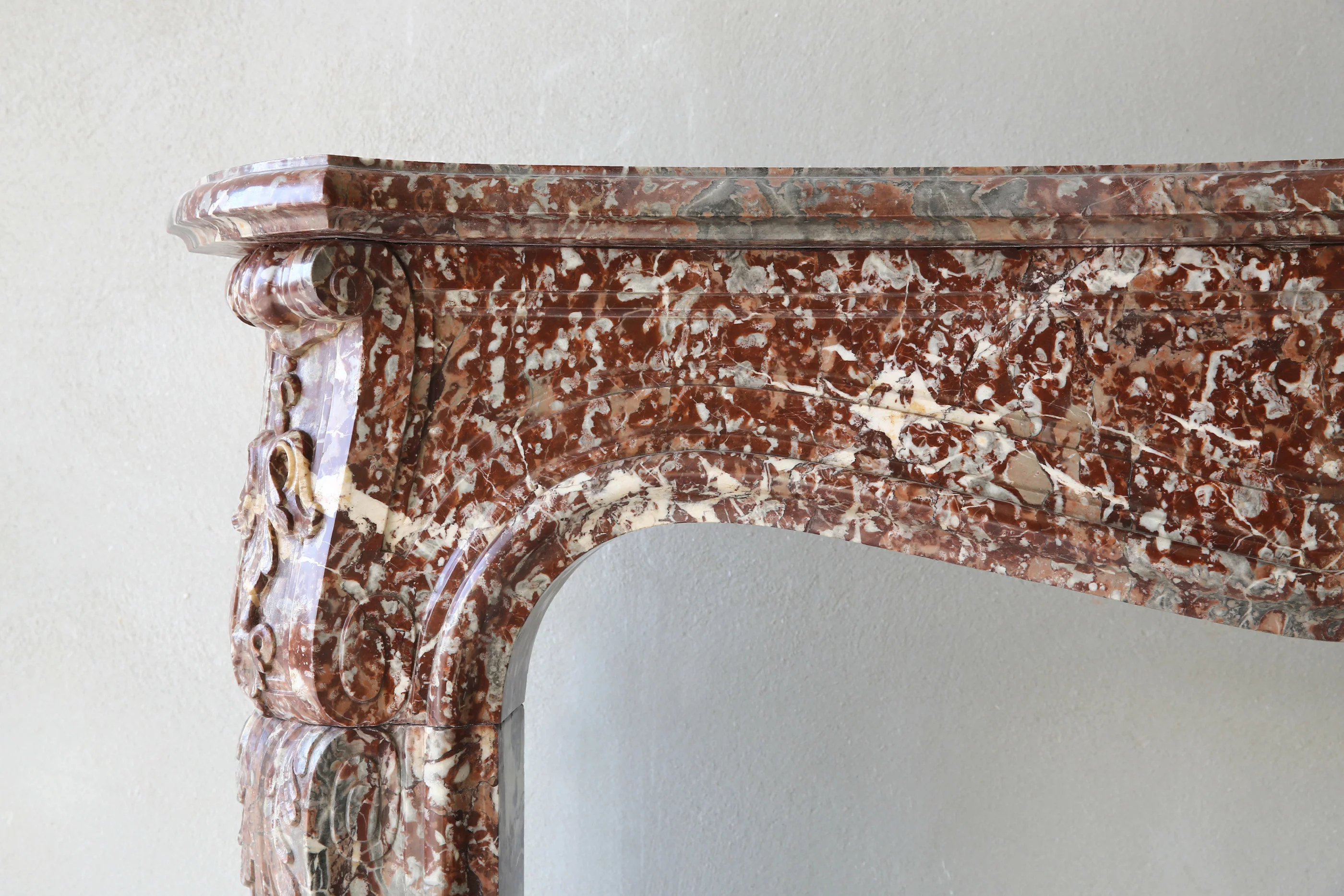 Recently we took this unique marble fireplace from St. Remy marble from France! A beautiful specimen within our extensive collection of marble fireplaces. The St. Remy type of marble resembles Rouge Royal. Gray fossils (tortillons) and both light and dark veins are found on the red background.