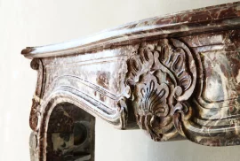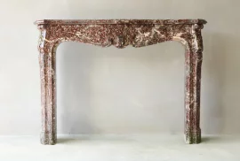 Recently we took this unique marble fireplace from St. Remy marble from France! A beautiful specimen within our extensive collection of marble fireplaces. The St. Remy type of marble resembles Rouge Royal. Gray fossils (tortillons) and both light and dark veins are found on the red background.