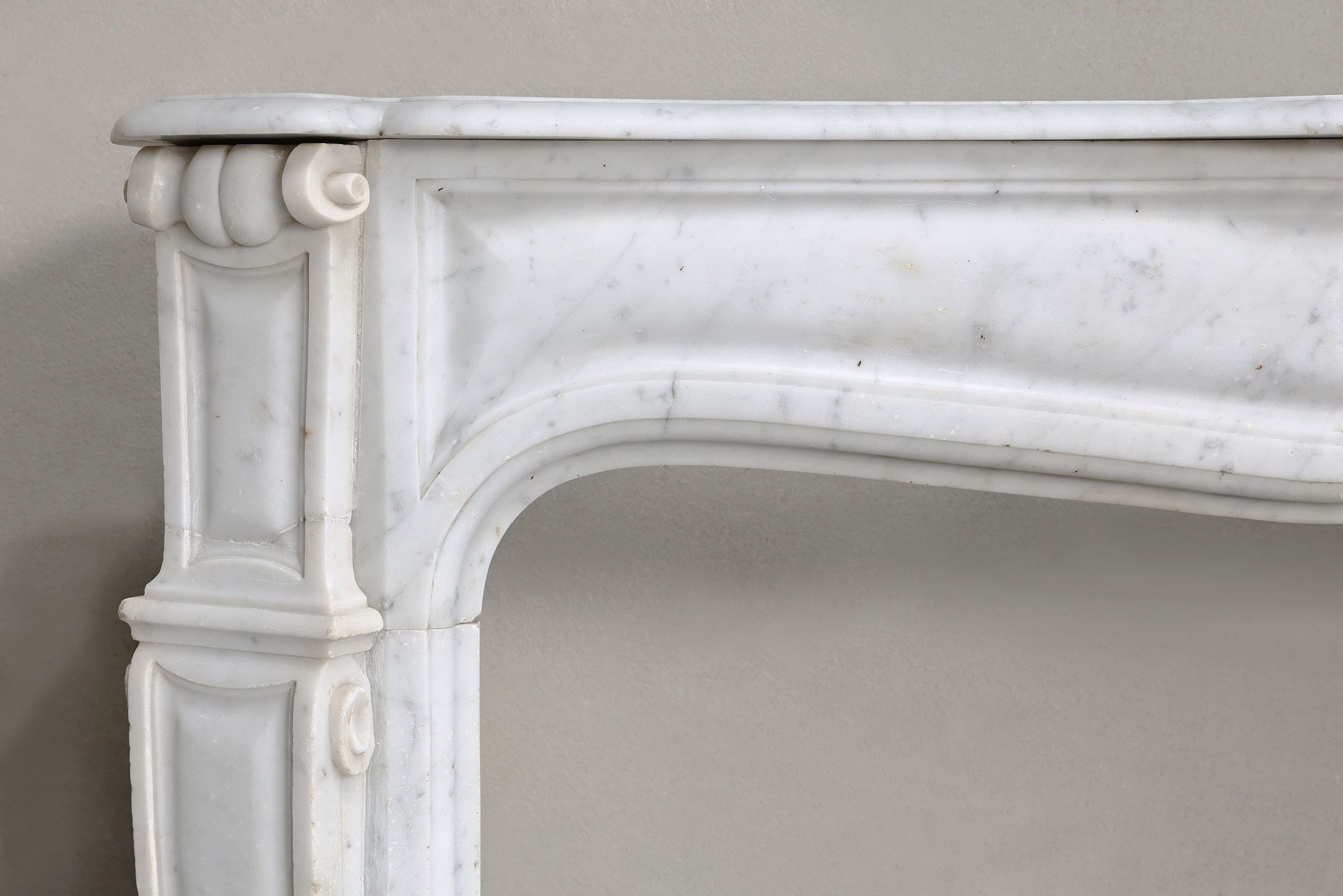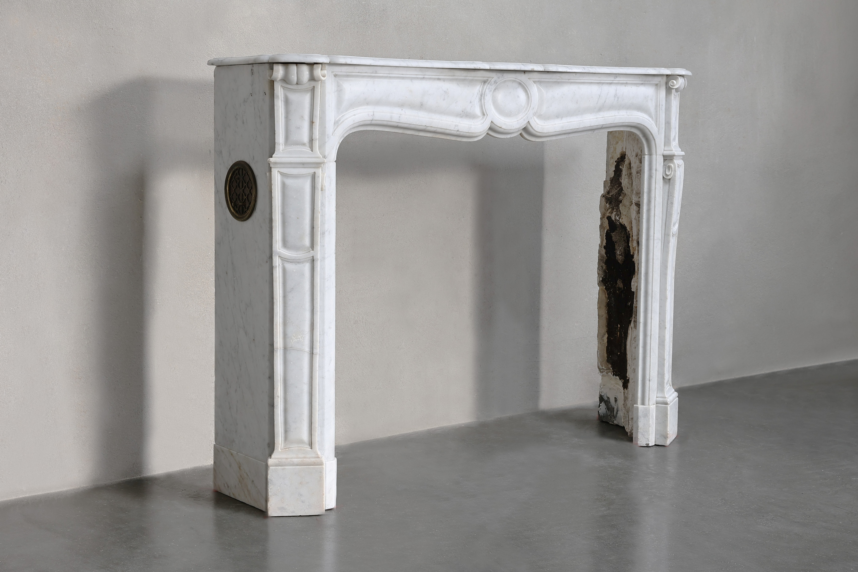 Beautiful compact antique mantelpiece made of Carrara marble from the 19th century! This graceful mantle is in Pompadour style, characterized by the round ornament in the center of the front part.
