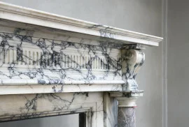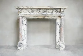 We are proud to present this beautiful antique marble fireplace! A treasure in our collection. This fireplace is made from two exclusive types of marble: the largest part consists of Paonazzo marble and the two pillars on the legs are equipped with Sarrancolin marble. A richly decorated fireplace with a lot of charisma! This fireplace dates from the year 1880 and is in the style of Louis XVI.