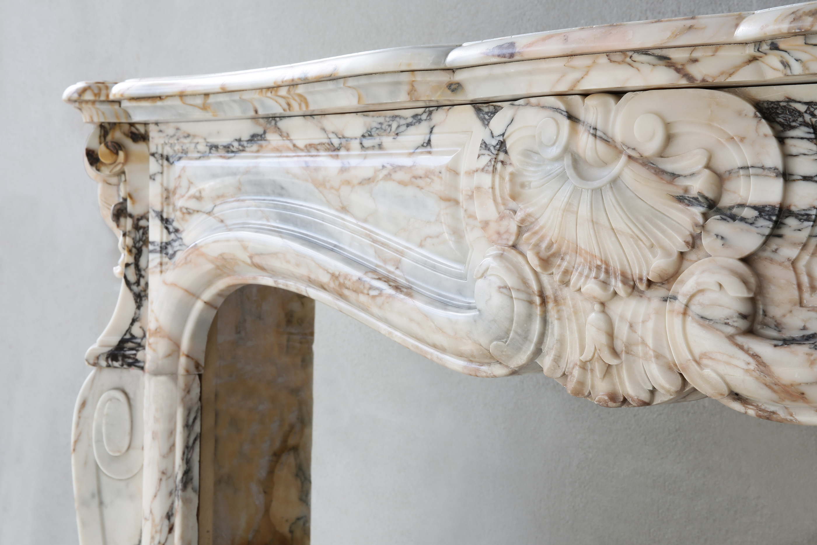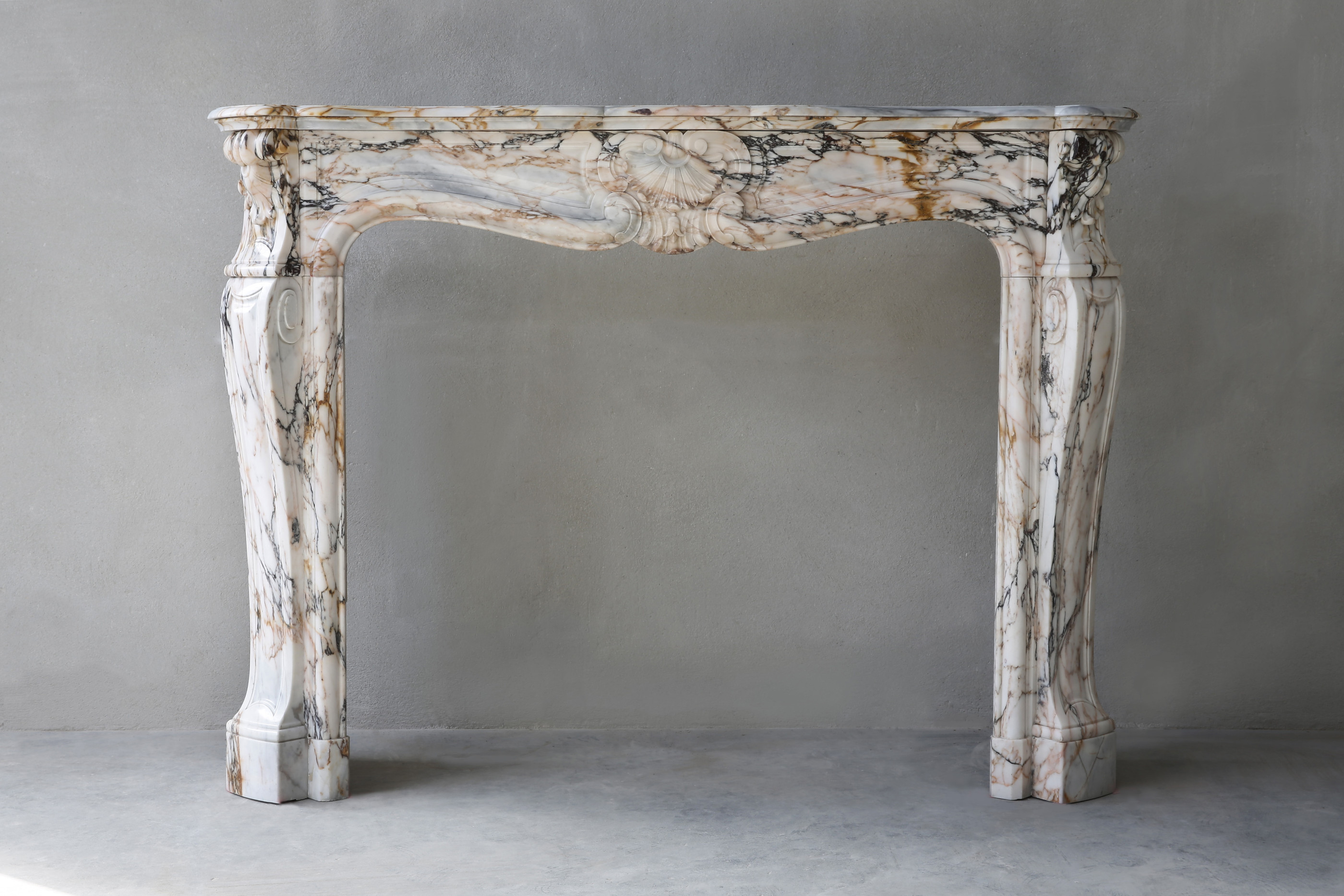Chic antique marble mantle from 1890 - 1900. This beautiful fireplace is chiseled from the Greek marble type Skyros and has a warm color scheme. This fireplace is in Louis XV style and has a scallop in the middle of the front part with continuous decorations on the legs. A beautiful stylish fireplace that comes from the old city center of Brussels.