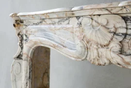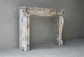 Chic antique marble mantle from 1890 - 1900. This beautiful fireplace is chiseled from the Greek marble type Skyros and has a warm color scheme. This fireplace is in Louis XV style and has a scallop in the middle of the front part with continuous decorations on the legs. A beautiful stylish fireplace that comes from the old city center of Brussels.