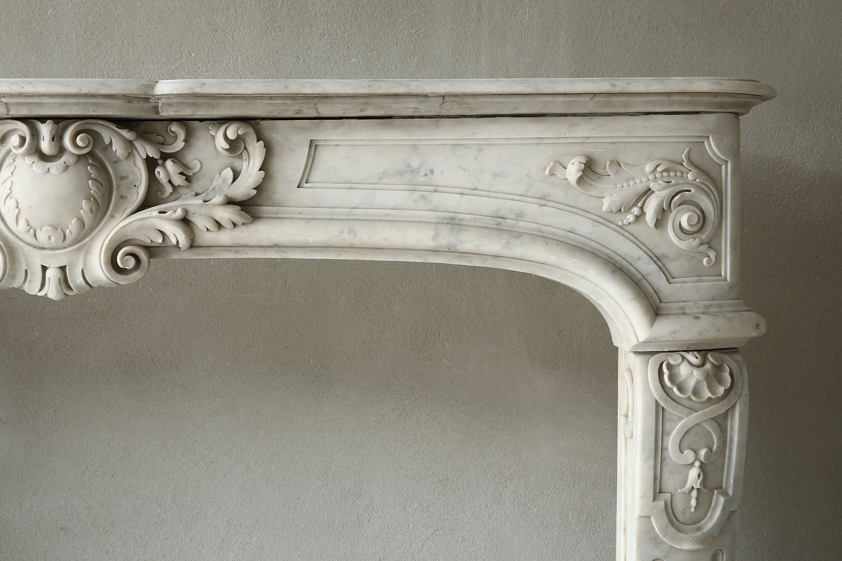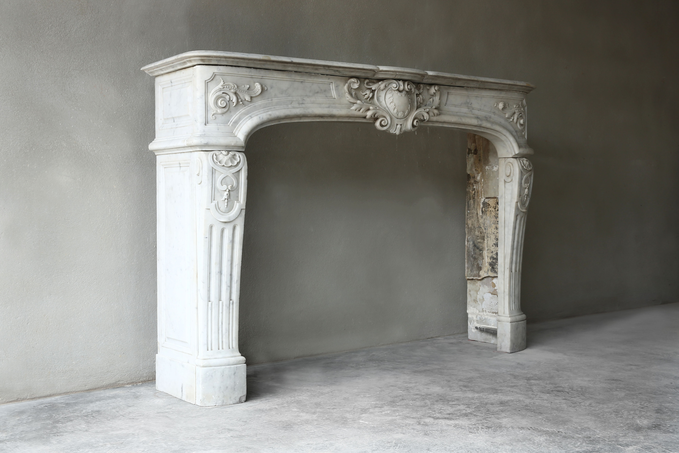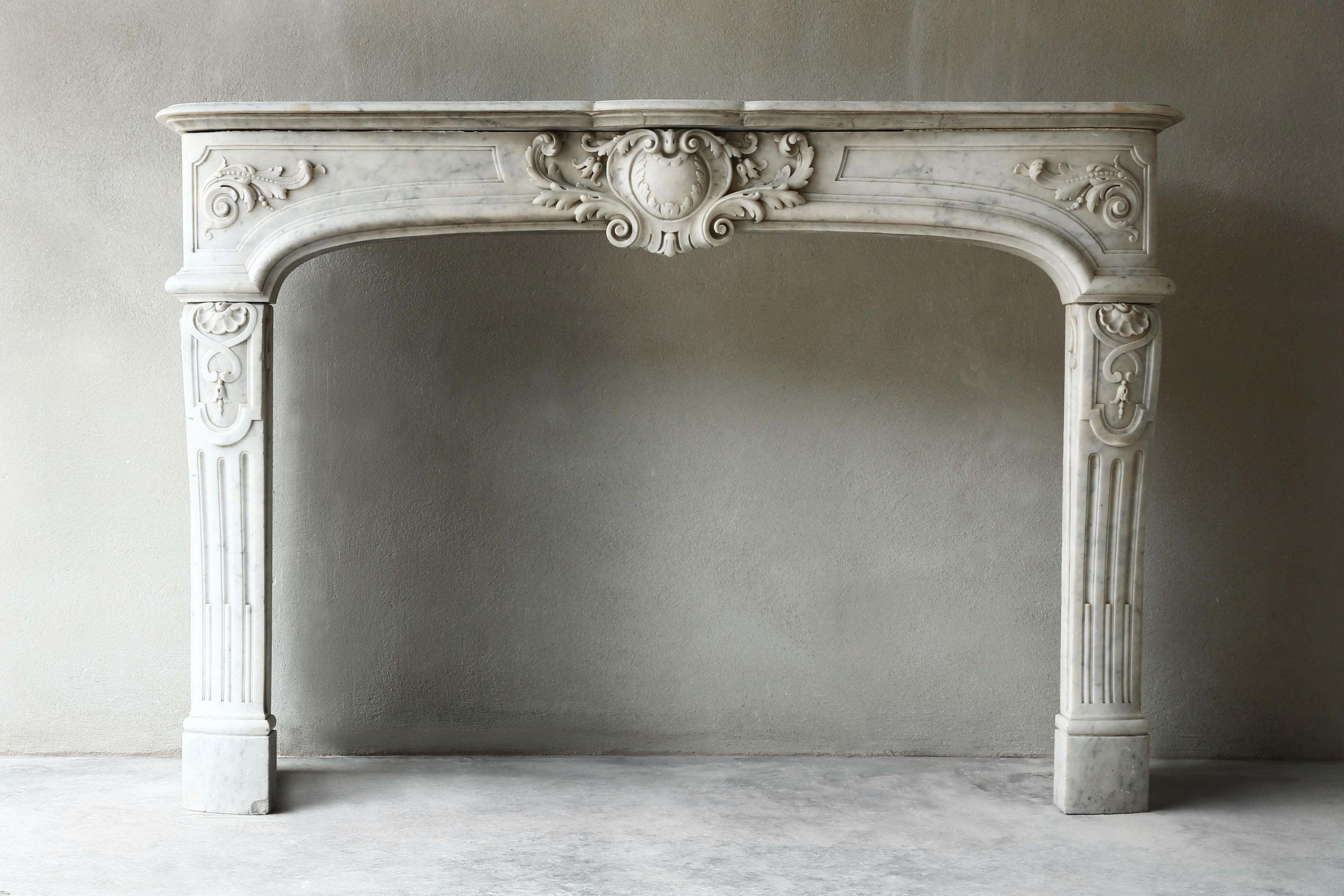 Very rare marble antique fireplace from the era of Louis XIV of white carrara marble. This unique fireplace dates back to the 19th century. The curved legs are decorated with scallops and cannellures. The front part has a beautiful scallop in the middle with continuous ornaments on the sides.