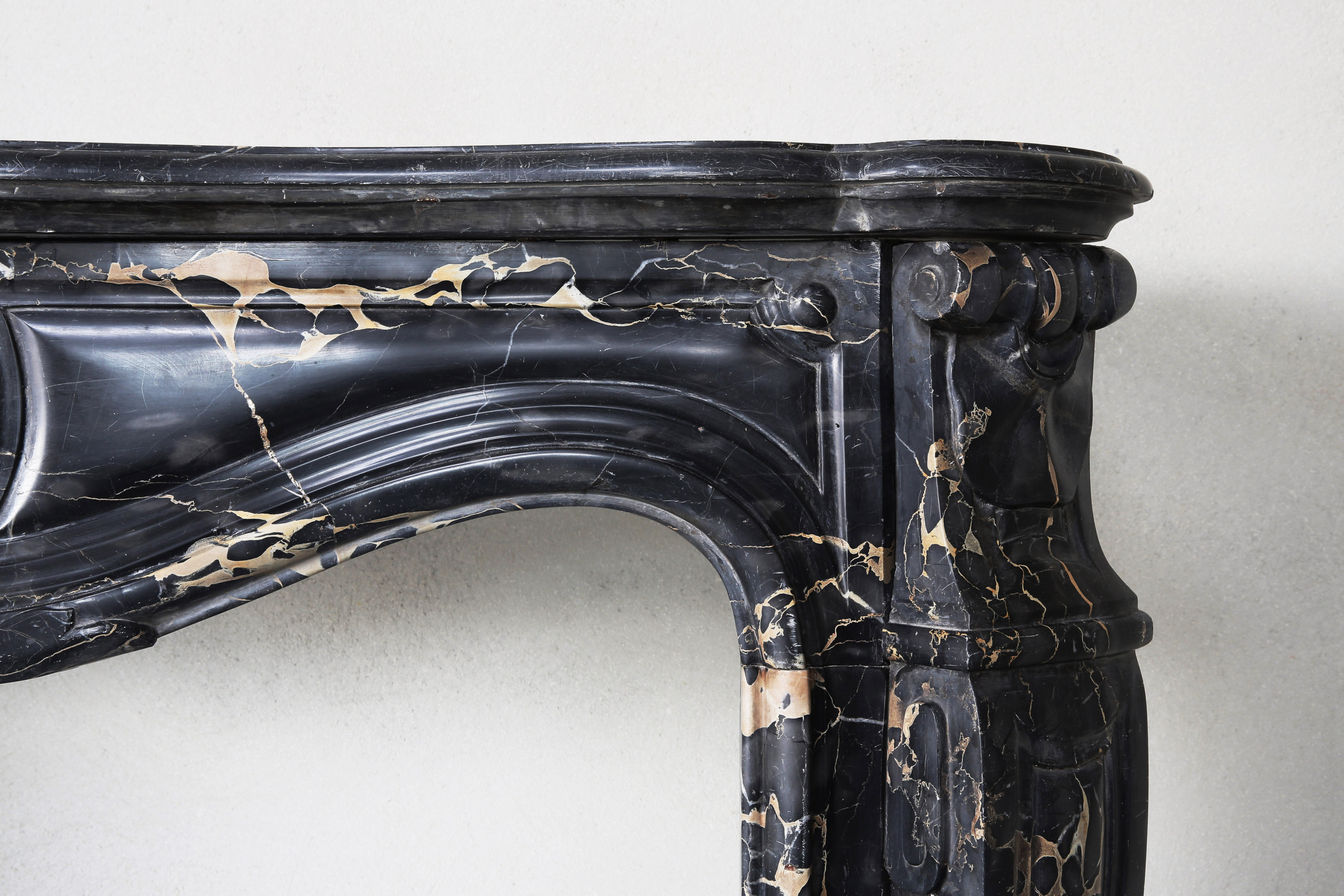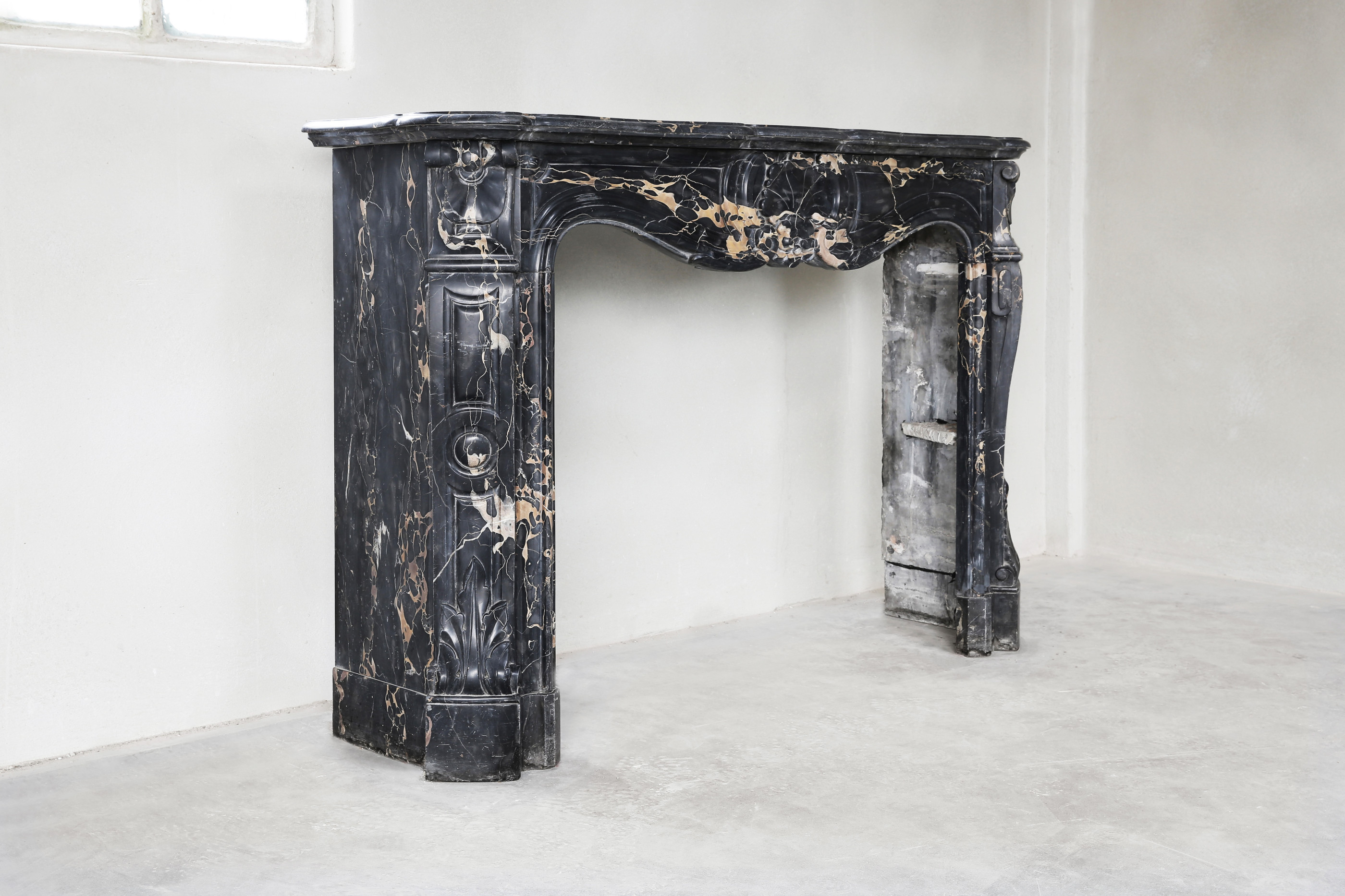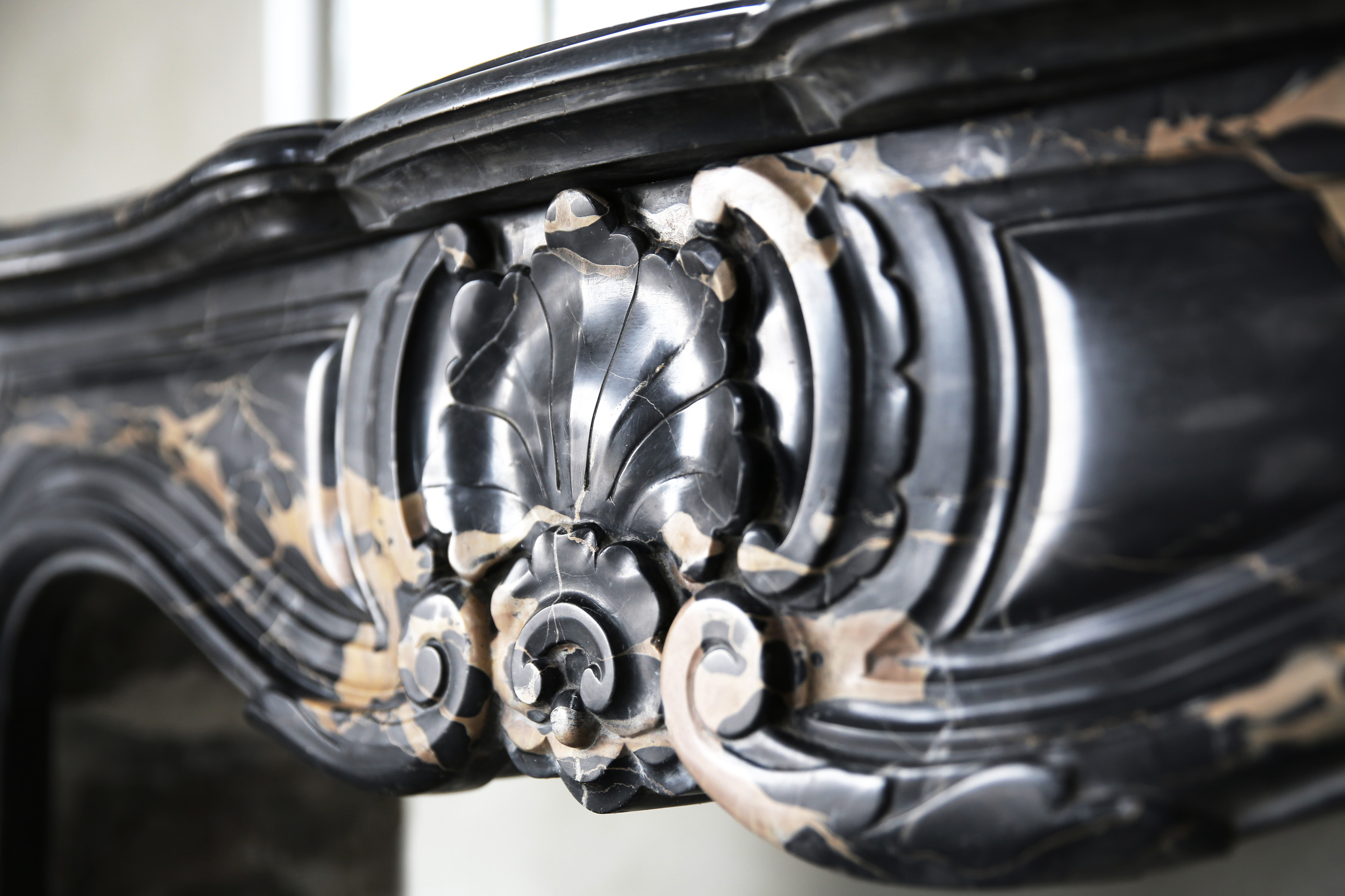 A rare antique marble fireplace from ancient Portoro marble from Tuscany. Portoro marble is one of the most elegant Italian marbles. The black background with golden veins ensures luxury and exclusivity. The chimney is in Louis XV style and dates back to the 19th century. Equipped with a nice scallop in the middle of the leaf. The legs are also decorated with ornaments. A chic fireplace with a warm look that fits perfectly in a fashionable, rural or classic home!