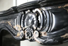 A rare antique marble fireplace from ancient Portoro marble from Tuscany. Portoro marble is one of the most elegant Italian marbles. The black background with golden veins ensures luxury and exclusivity. The chimney is in Louis XV style and dates back to the 19th century. Equipped with a nice scallop in the middle of the leaf. The legs are also decorated with ornaments. A chic fireplace with a warm look that fits perfectly in a fashionable, rural or classic home!