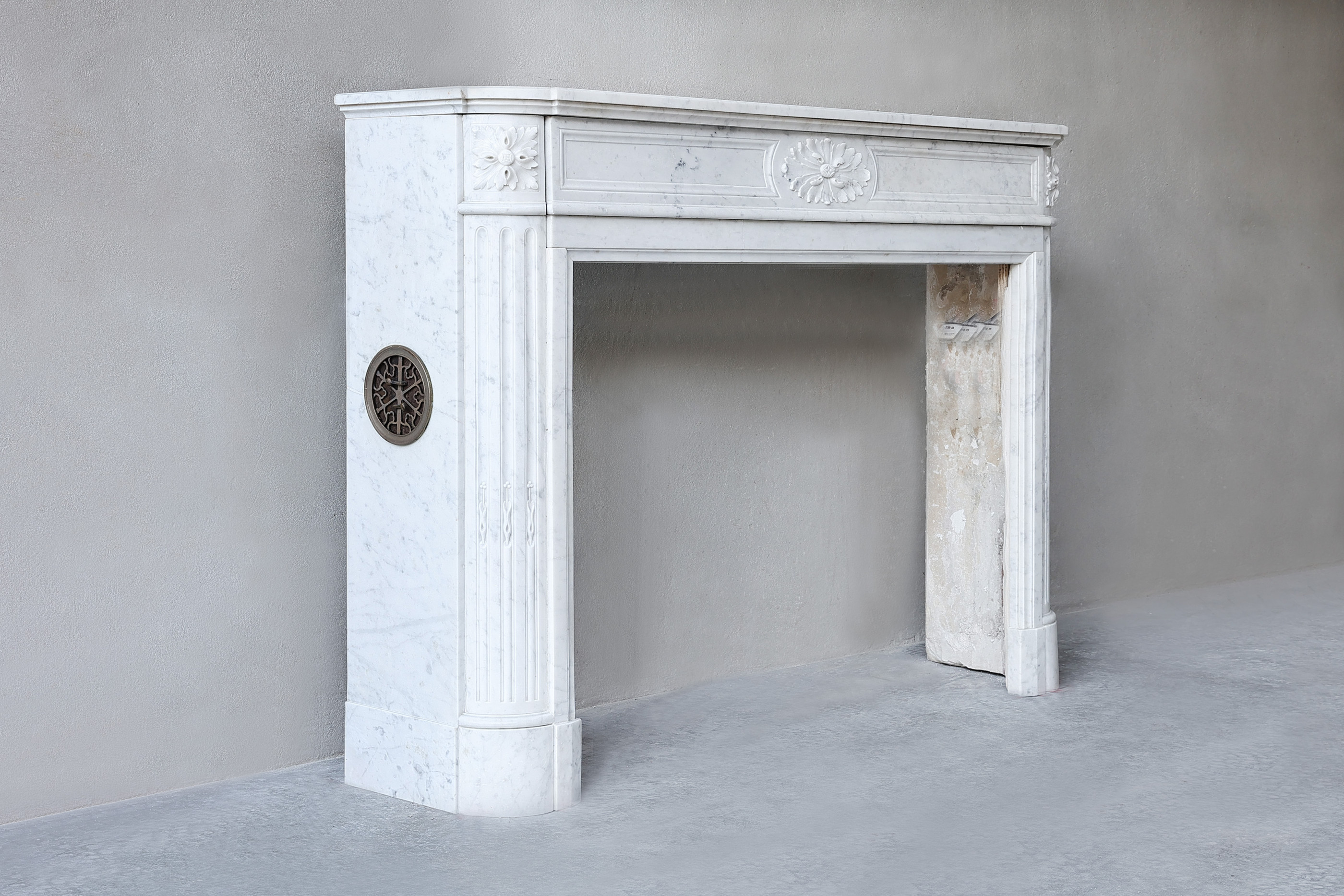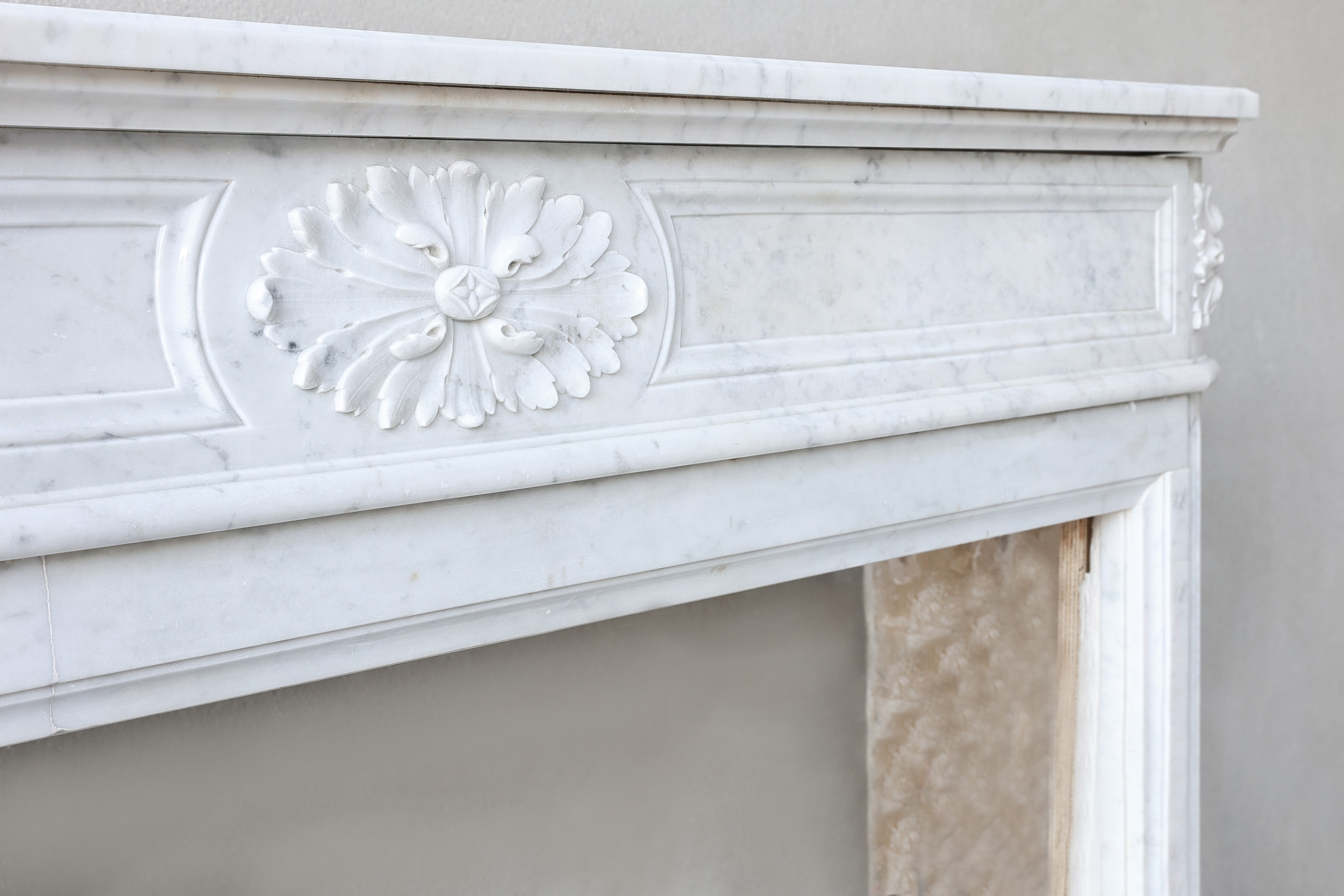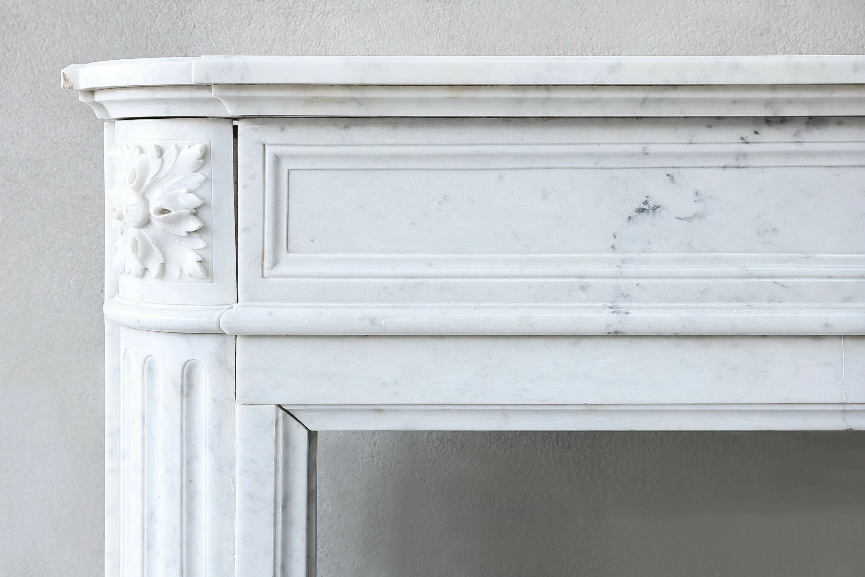 This stunning antique marble chimneypiece showcases the refined elegance of the Louis XVI style, characterized by its curved, symmetrical demi-lune legs. Crafted in Paris between 1860-1880, this piece is made from fine Carrara marble, celebrated for its purity and timeless beauty. With dimensions of 139 cm in width and 105 cm in height, this chimneypiece fits elegantly in a variety of interiors. Its impeccable craftsmanship and perfect condition make it an excellent addition to any classic or modern home. Whether used as a fireplace mantel or decorative feature, this 19th-century piece captures the essence of vintage Parisian design and timeless sophistication.