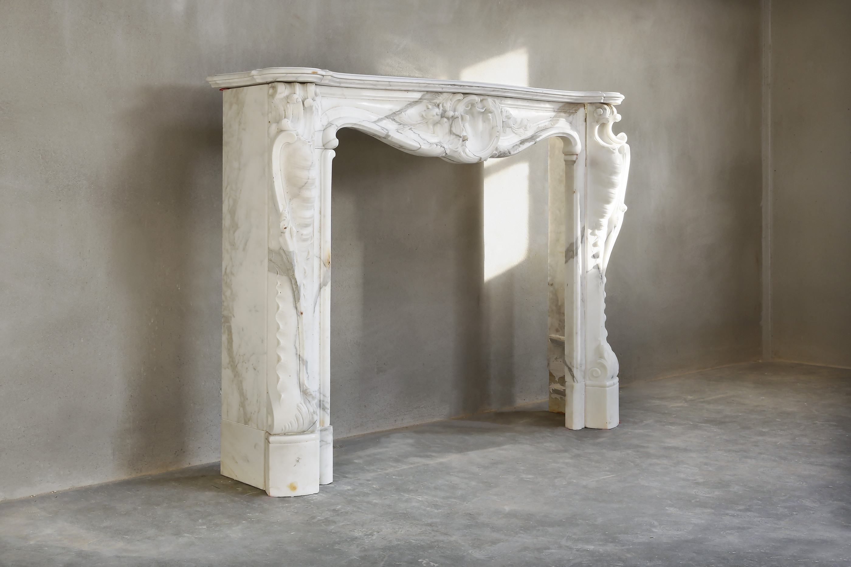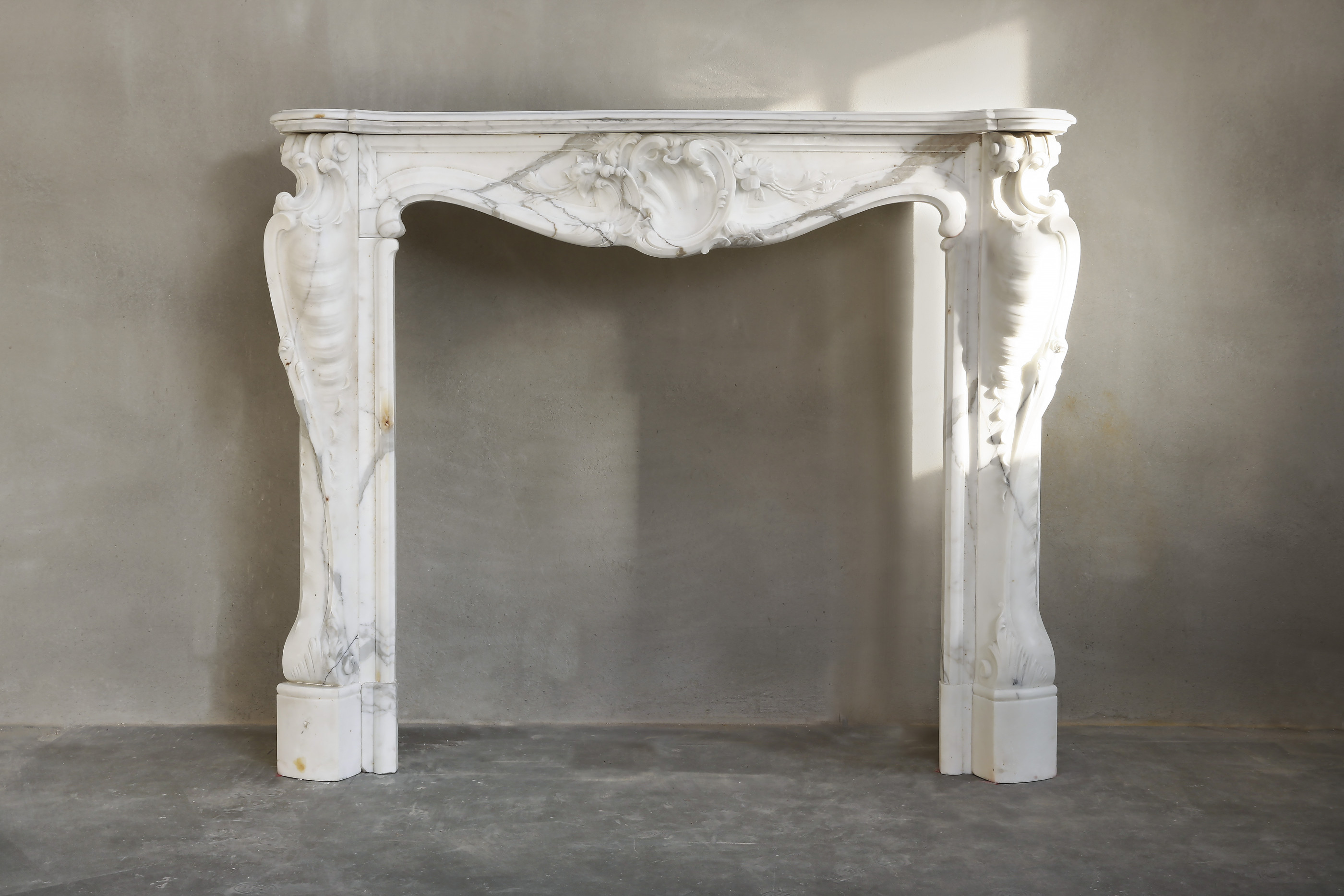 A very beautiful antique fireplace made of statuario marble. This type of marble comes from Italy and has light veins. The fireplace dates from the 19th century and is in the style of Louis XV. This type of fireplace is often equipped with a scallop in the middle of the front part and richly decorated legs.