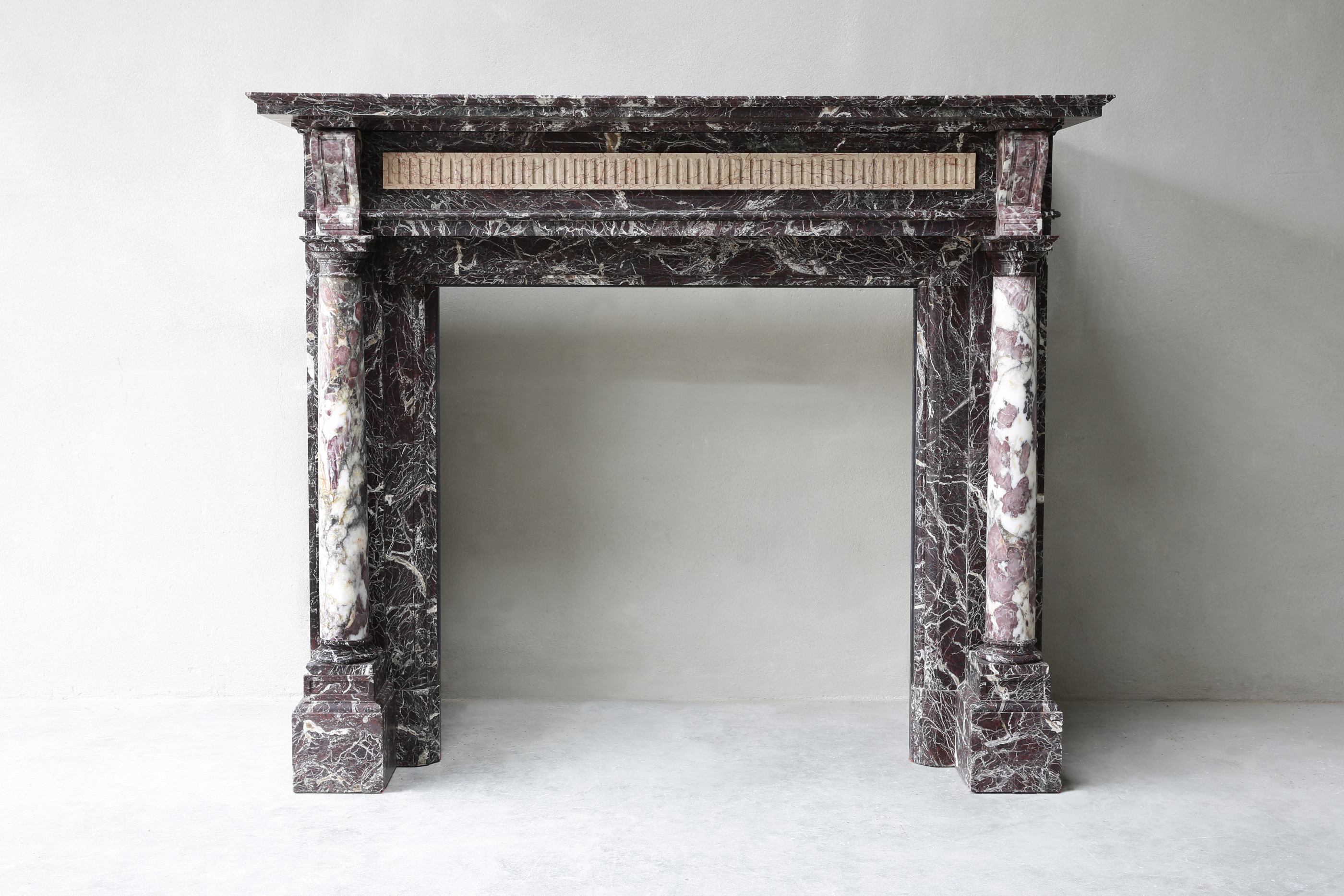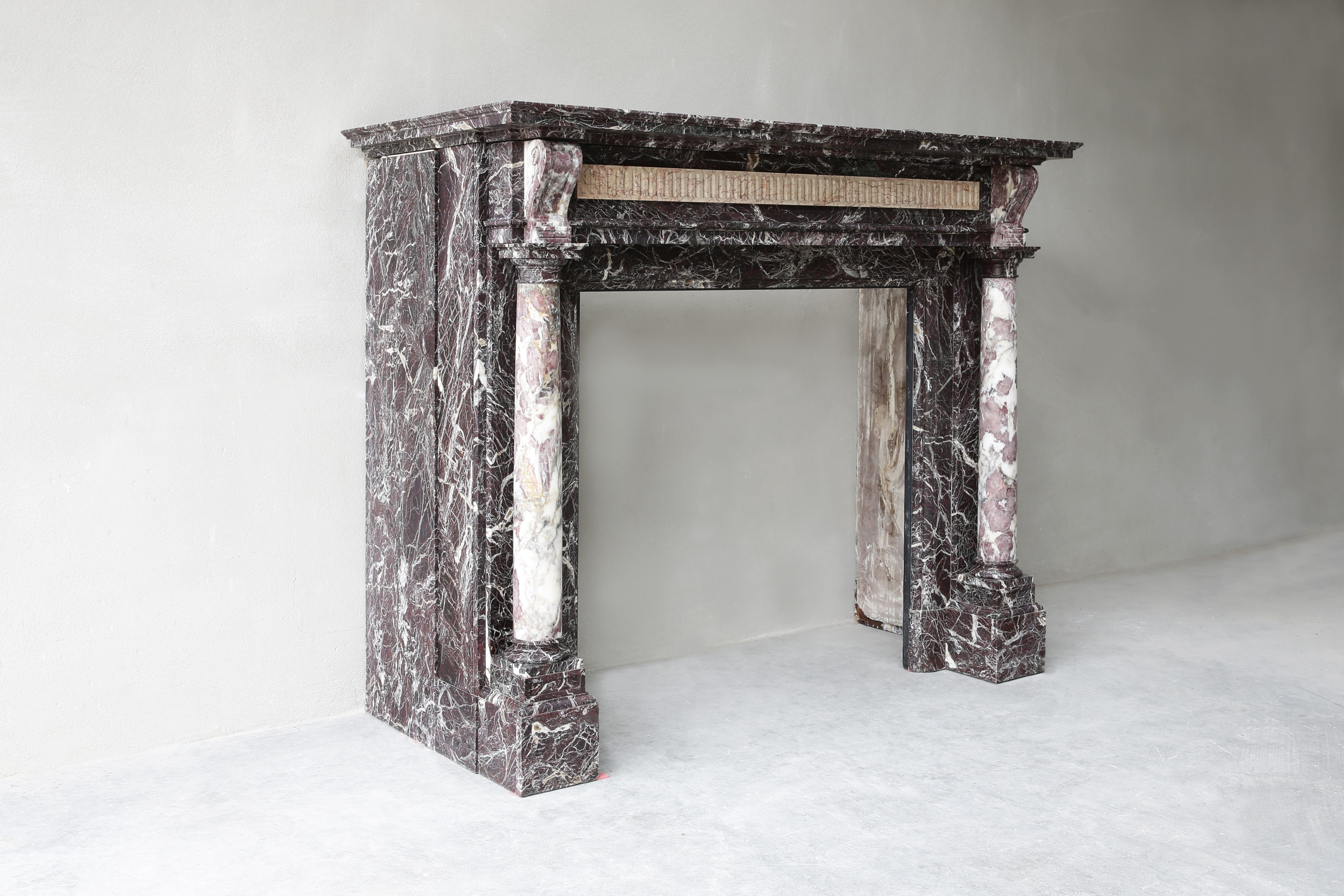 Exclusive antique marble fireplace with 19th century pillars! A beautiful mantle in our collection, with beautiful lines and ornaments, in the style of Louis XVI. The marble type is Levanto marble and is originally from Italy. We have taken this beautiful fireplace from an old building in Brussels.